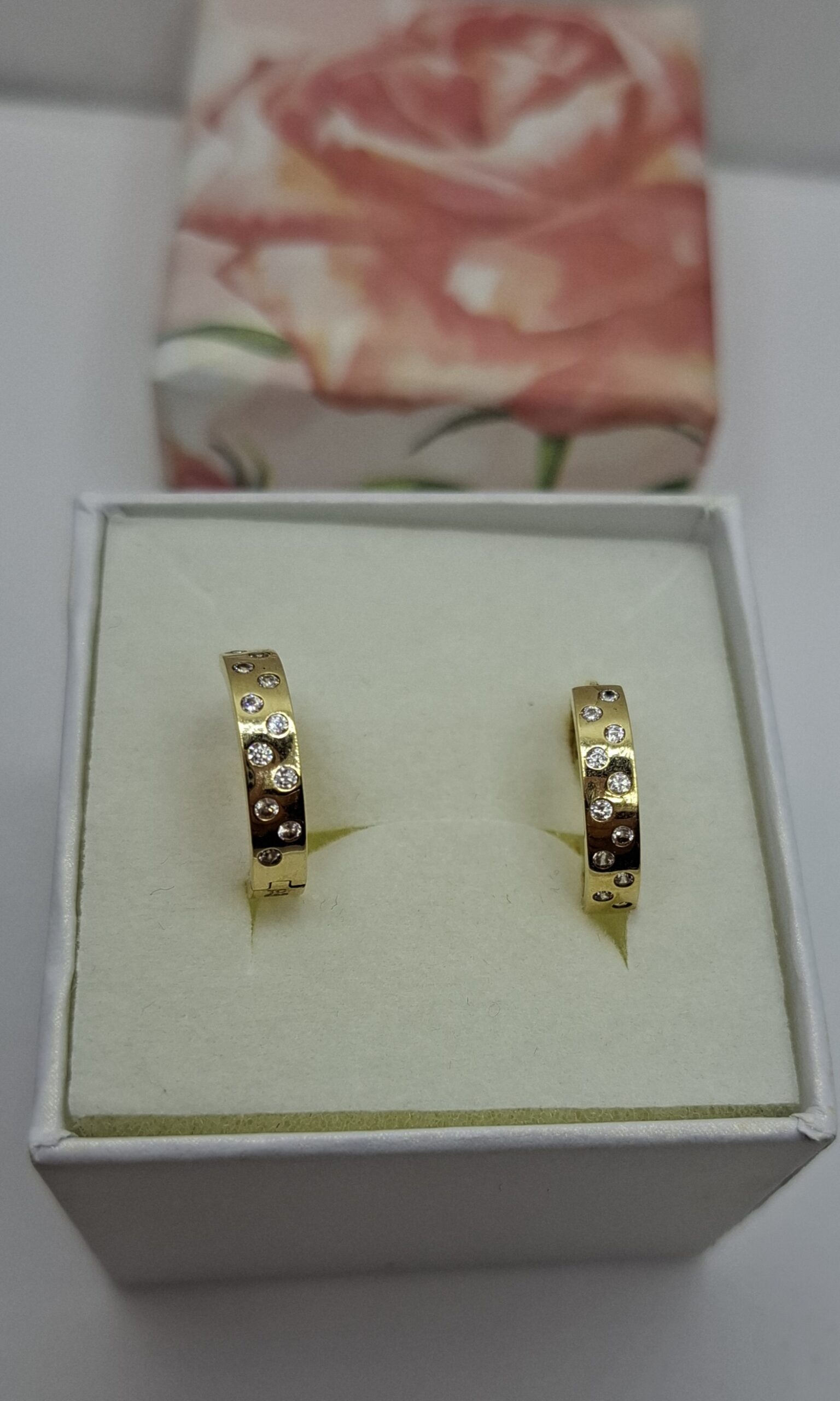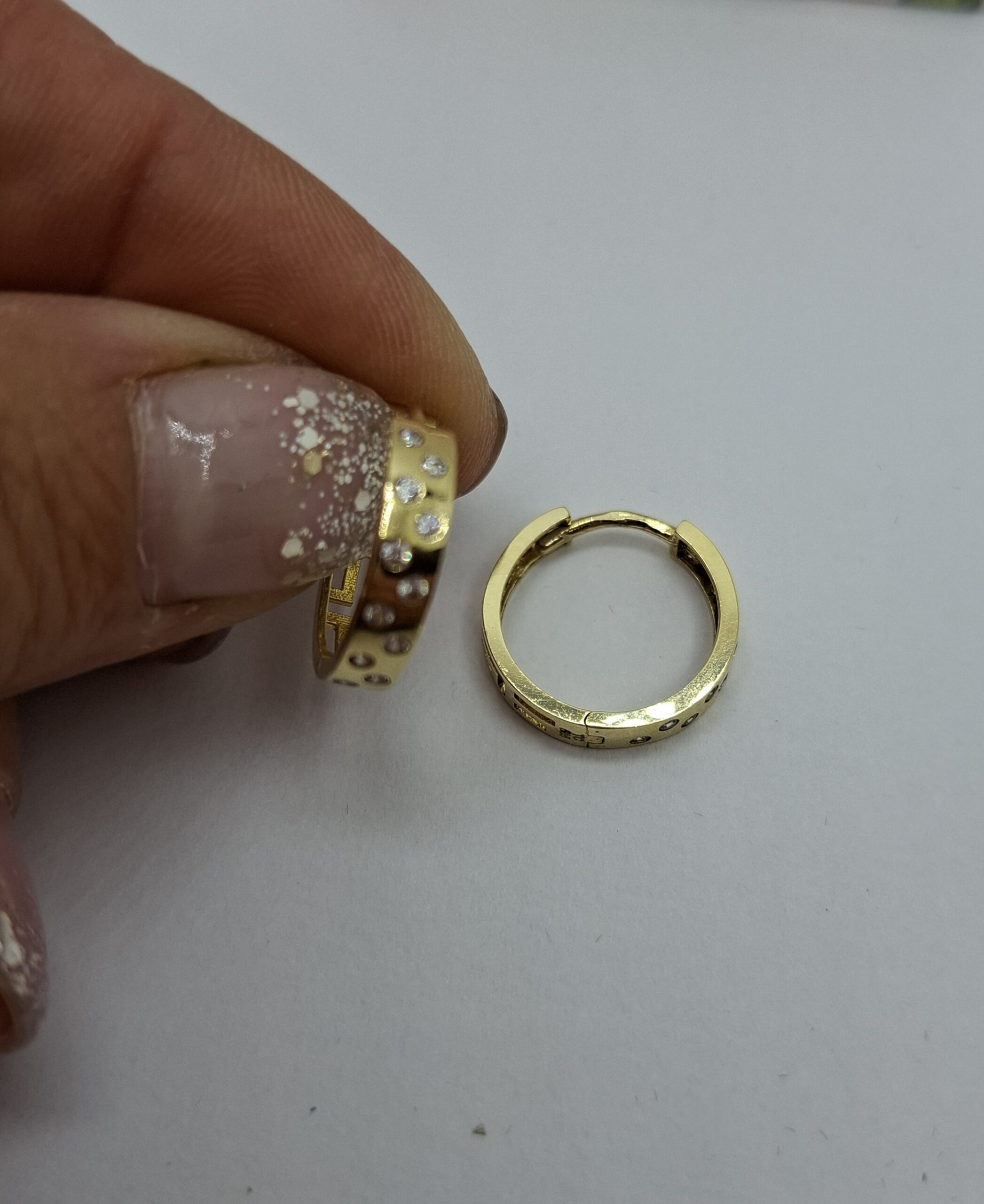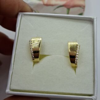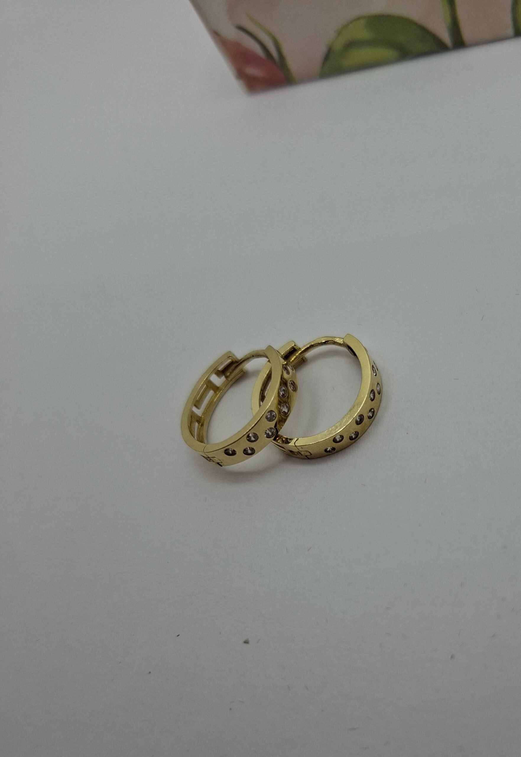 Arany karika fülbevaló, elől kis cirkónia kövekkel, a hátulja áttört görög mintás.  Átmérője:1,5cm, szélessége:3,5cm.