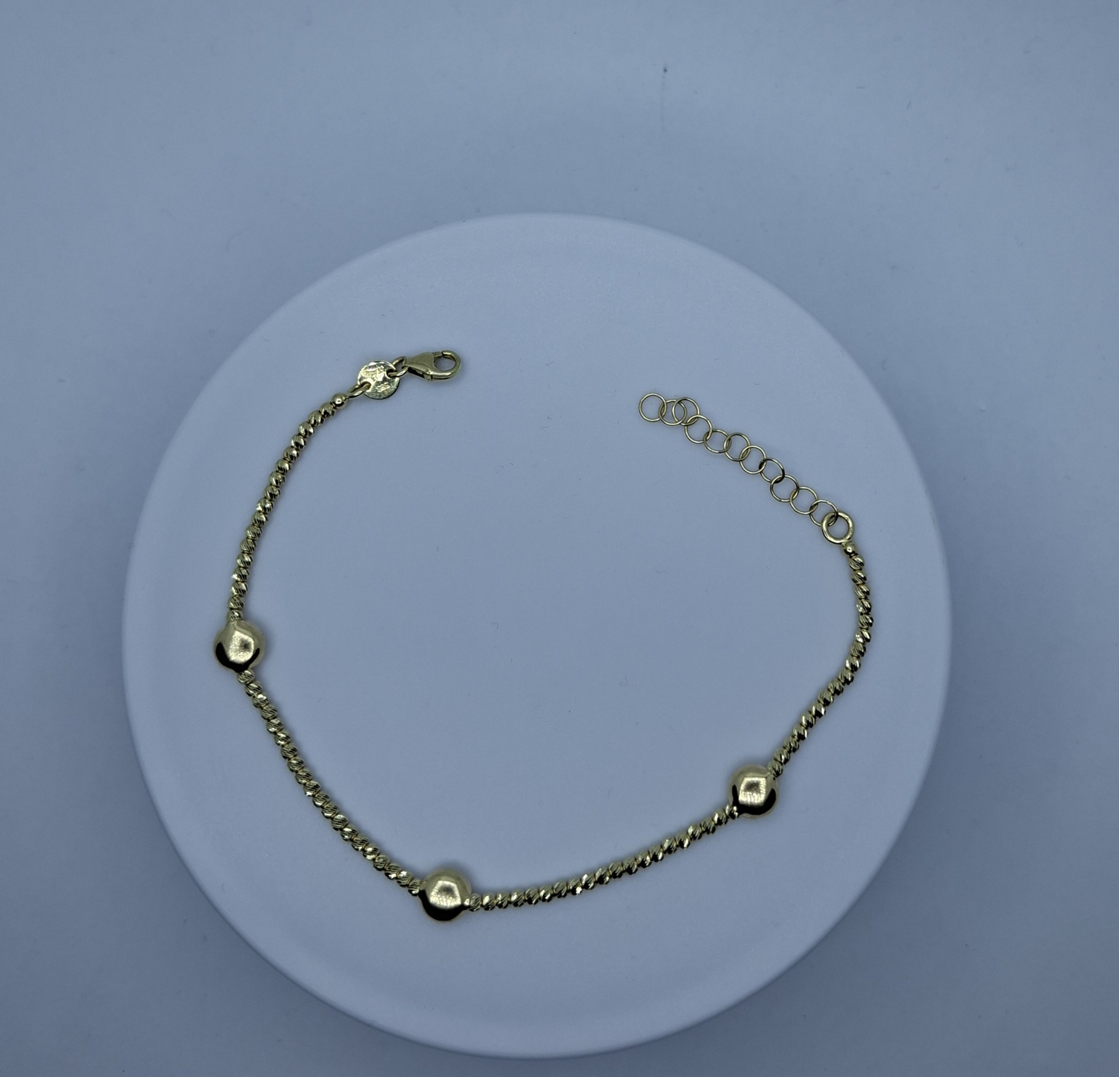 Sárga arany csillogó gyémántvésett karlánc, 3 db lapos fényes kerek dísszel. Hossza: 6-19cm-ig állítható. Vastagsága:2mm, a kerek díszek:6mm. 3gr, 14kt.
