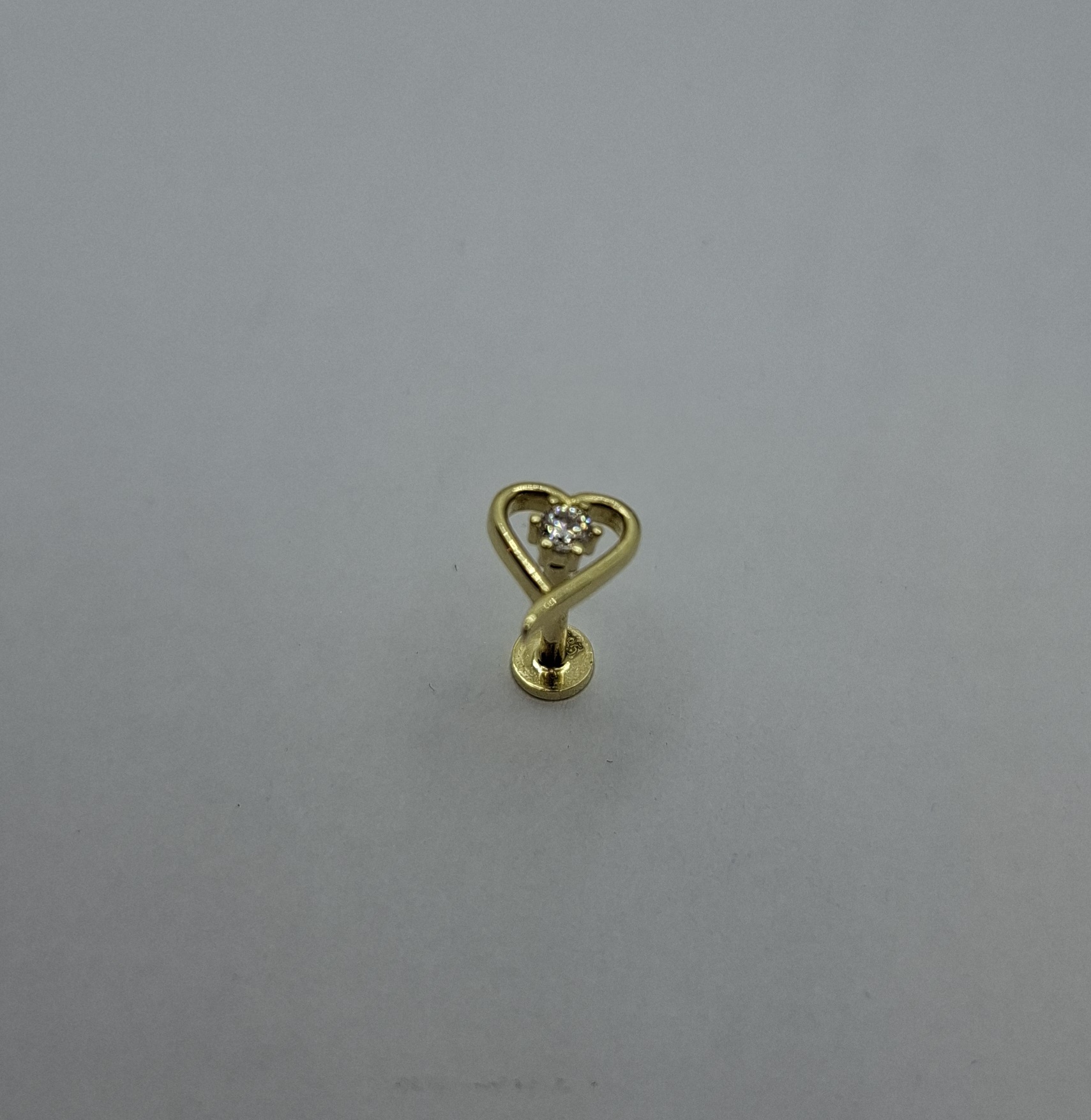 Sárga arany fül piercing, hátul lapos, középen csavar menettel. Súlya:0,6gr, 14kt.Magassága a szívnek 8mm, szélessége:6,5mm.