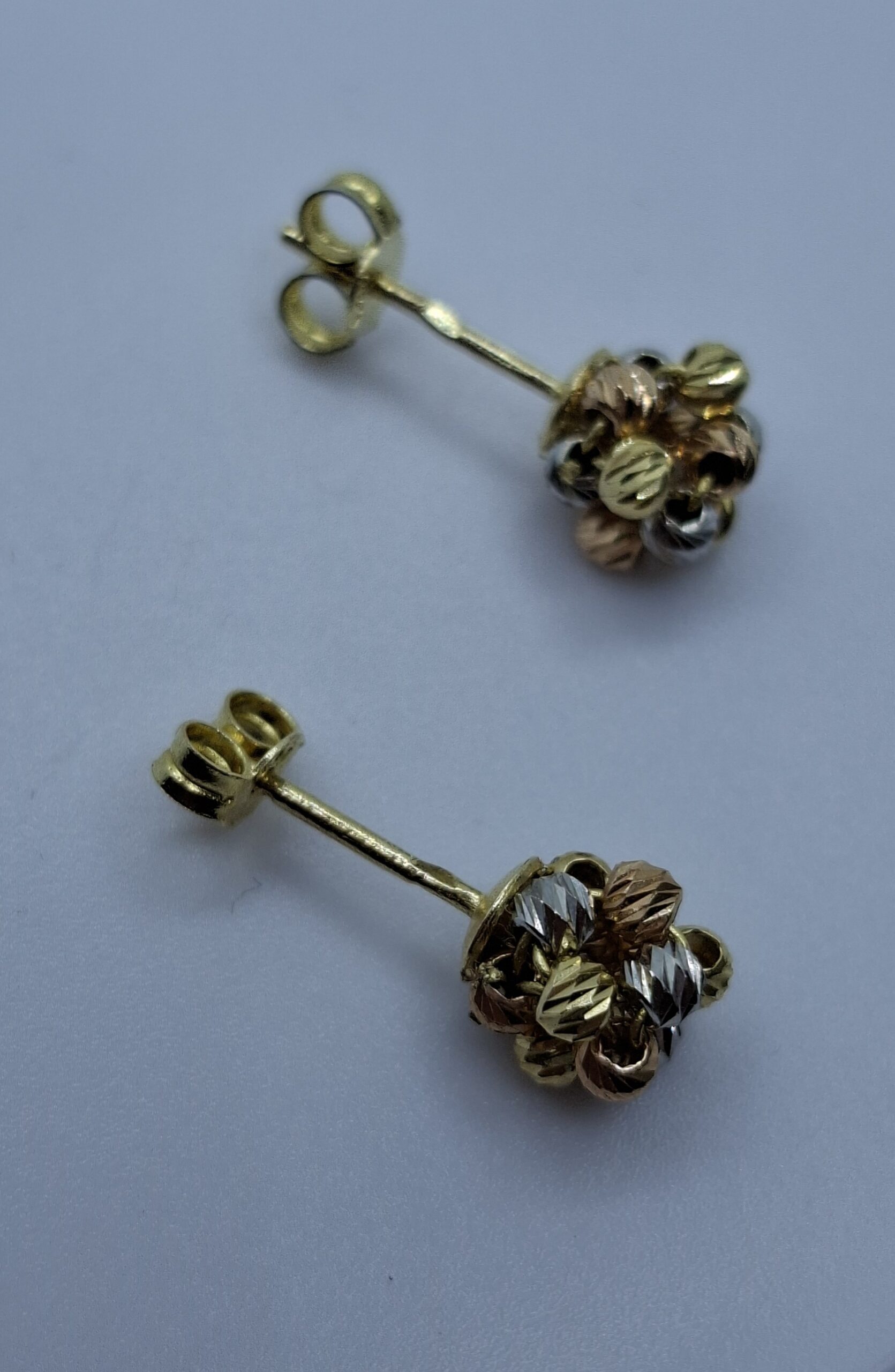 1 pár bedugós csillogó golyókból álló fülbevaló. Sárga arany, kis fehér és vörös szemekkel váltakozva. Mérete: 7mm. Súlya:1,5gr, 14kt. Modern, csillogós