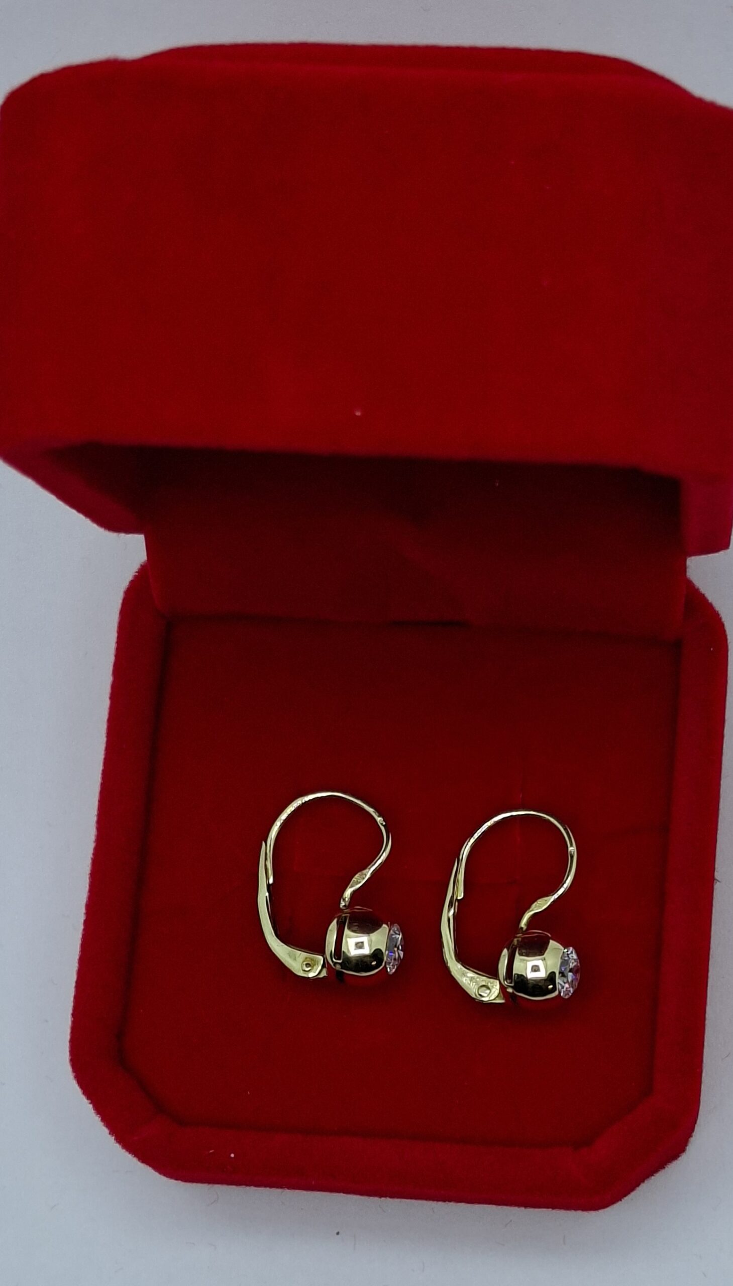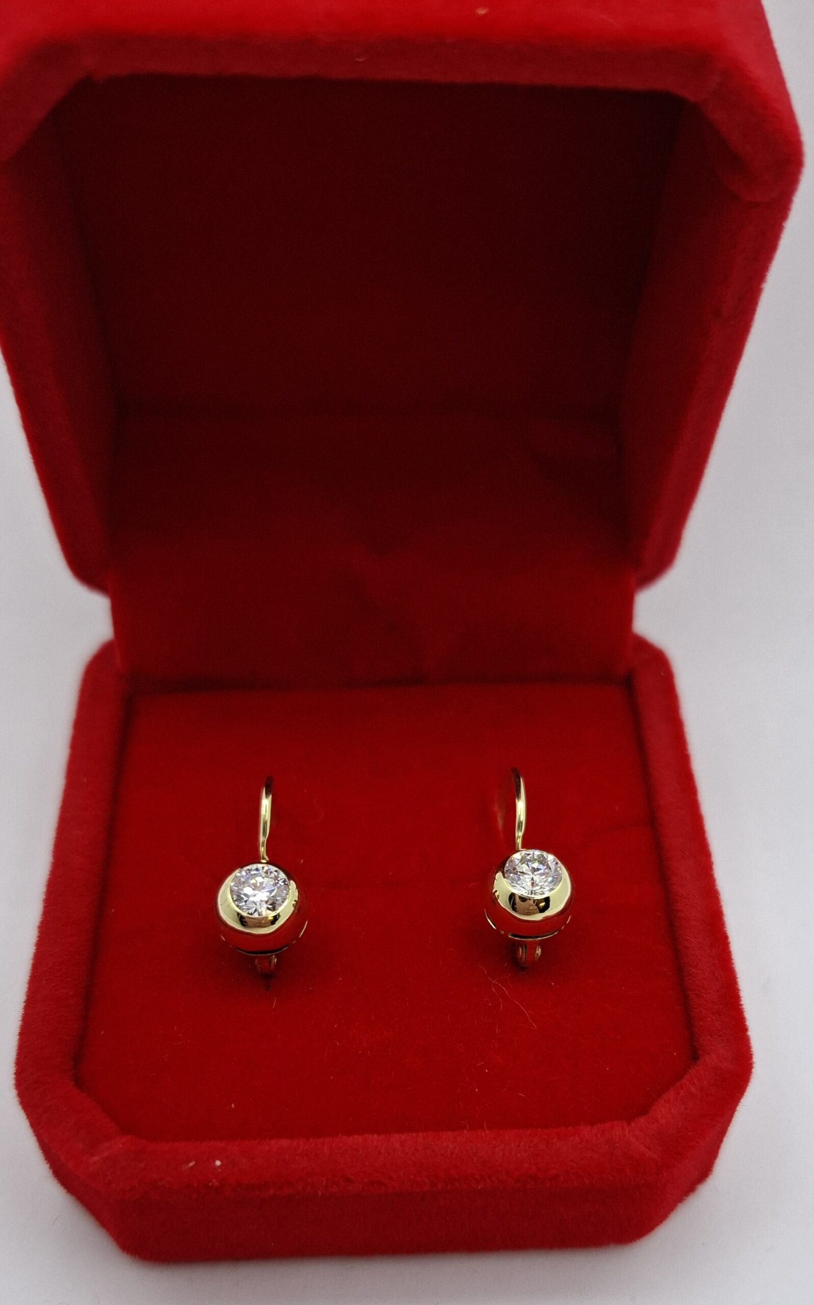 Sárga arany gyémánt köves fülbevaló, hagyományos hátul lebillenős jó fajta kapoccsal.  A gyémántok: 2db 4mm F, VVSi1, nagyon jó minőségűek, brilians csiszolás össz: 0,48ct. A fülbevaló súlya:2,3gr, 14kt magyar fémjelzett. Kényelmes viselet, nem kell kivenni éjszakára sem. Mutatós, csodásan csillogó.