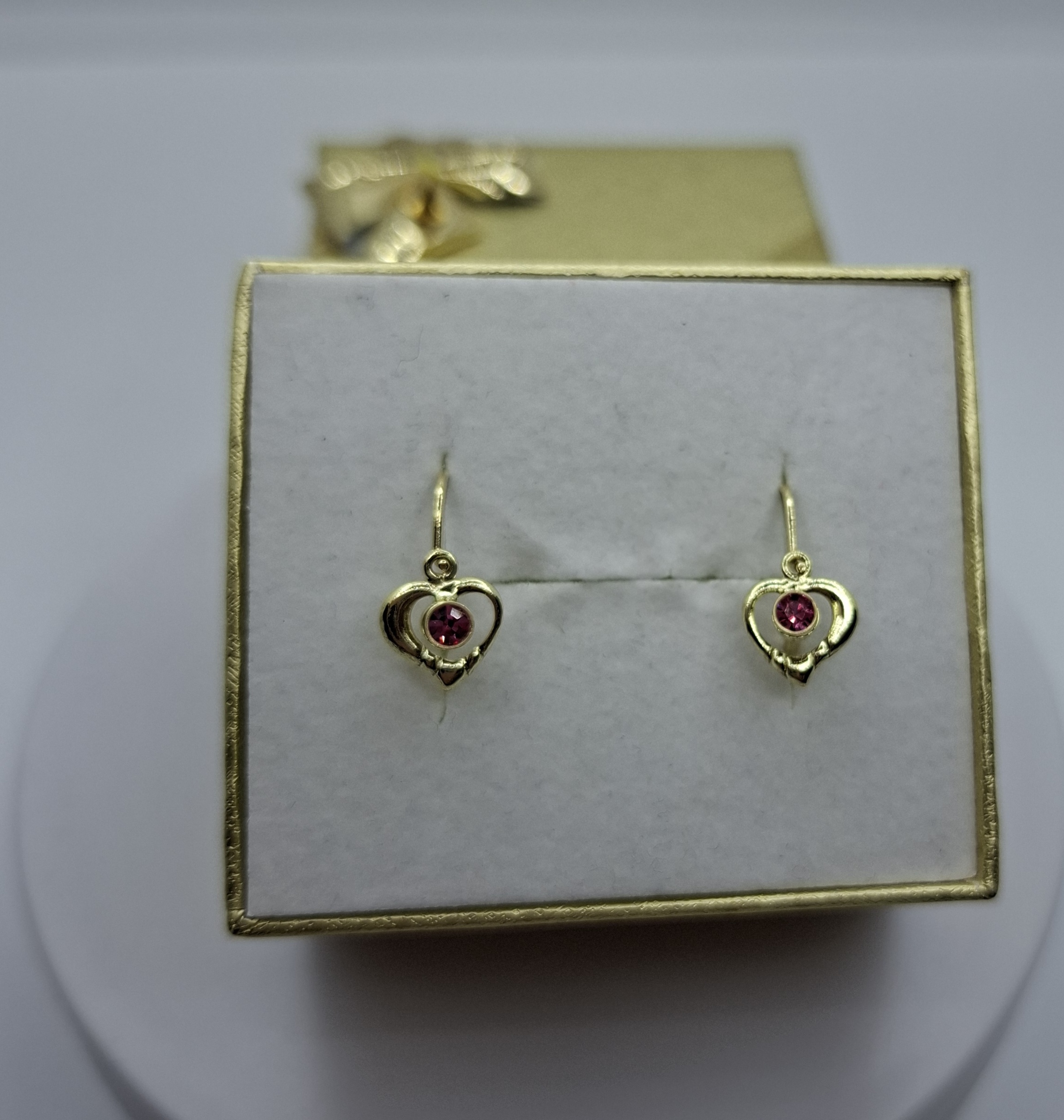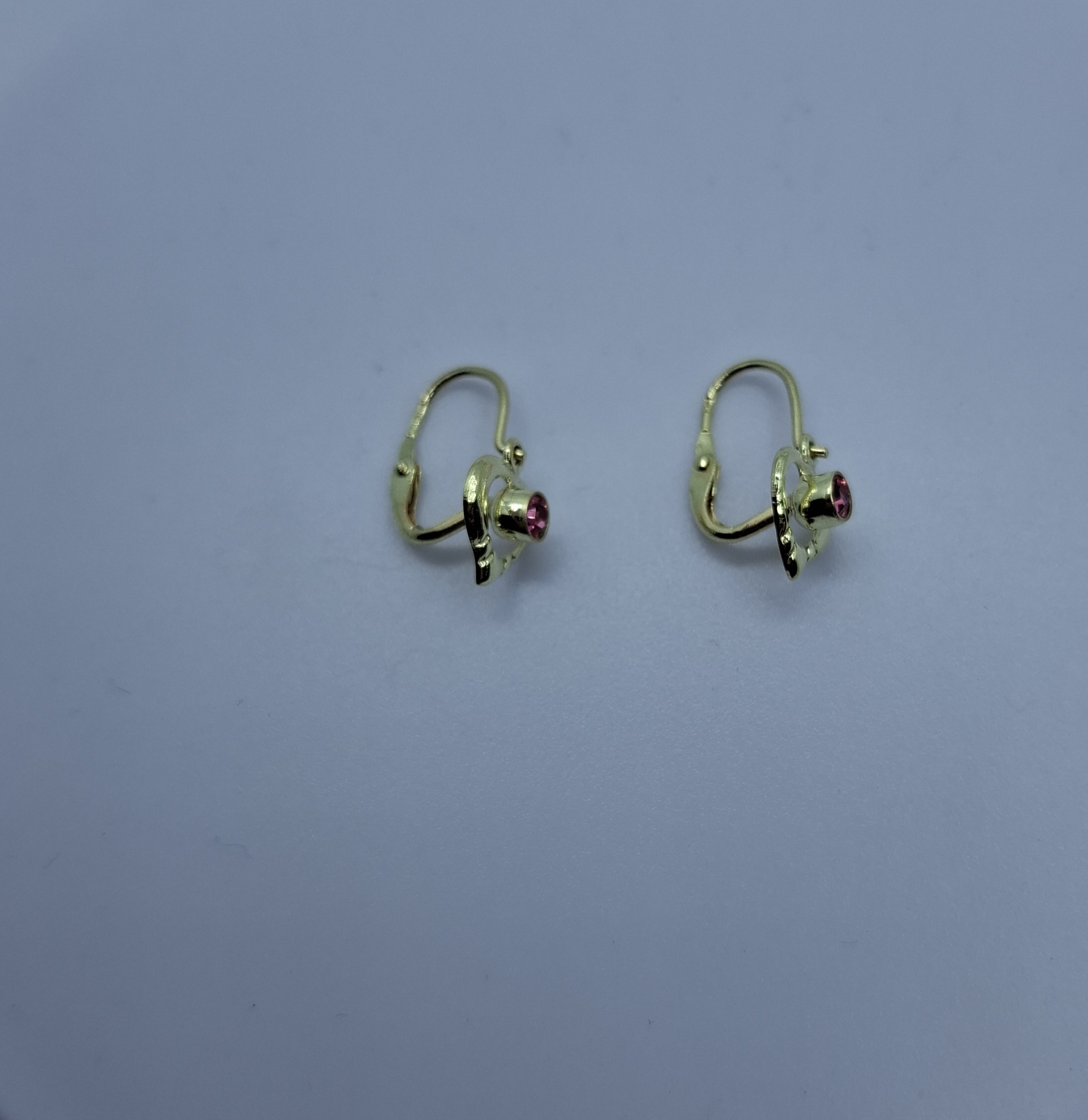 Sárga arany gyerek fülbevaló, elől csuklópántos kapoccsal. Szív, benne rózsaszín Swarovski kristállyal. Hossza:1,5cm, szélessége a szívnél:8mm. Súlya:0,9gr, 14kt.