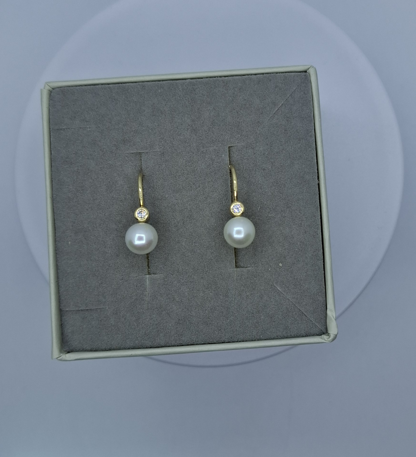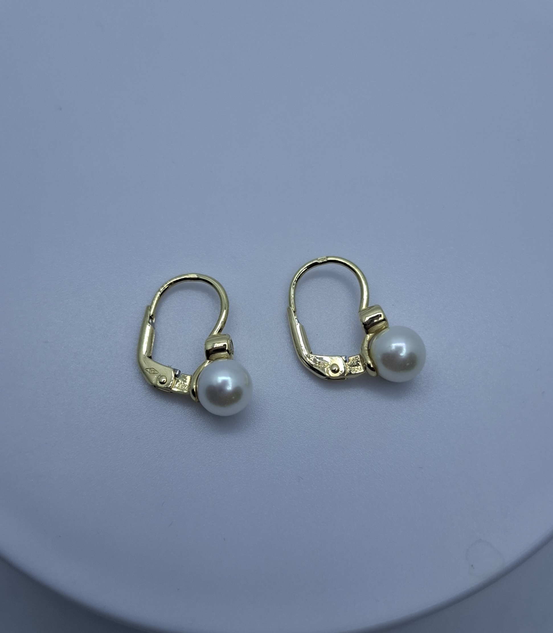 1 pár sárga arany hagyományos kapcsos fülbevaló, tenyésztett gyönggyel, felette kis befoglalt cirkónia kővel. Nagyon mutatós, minden ékszerhez és minden ruhához illik. Fülbevaló hossza:1,6cm, a tenyésztett gyöngy:6,3mm. Súlya:2,3gr, 14kt.