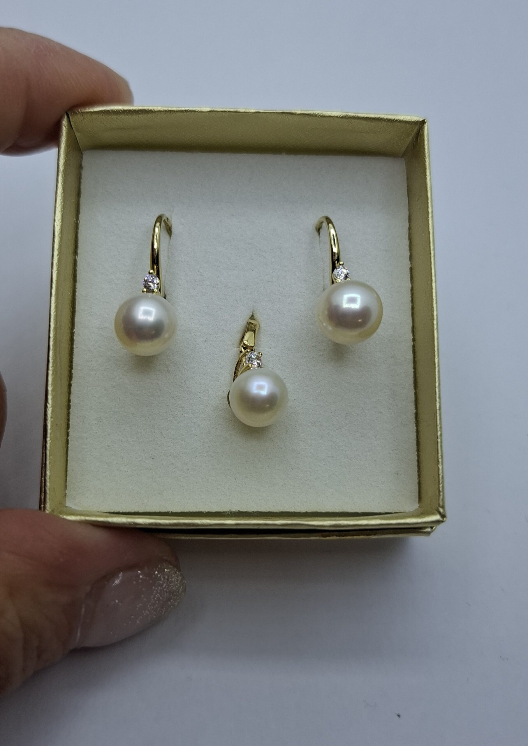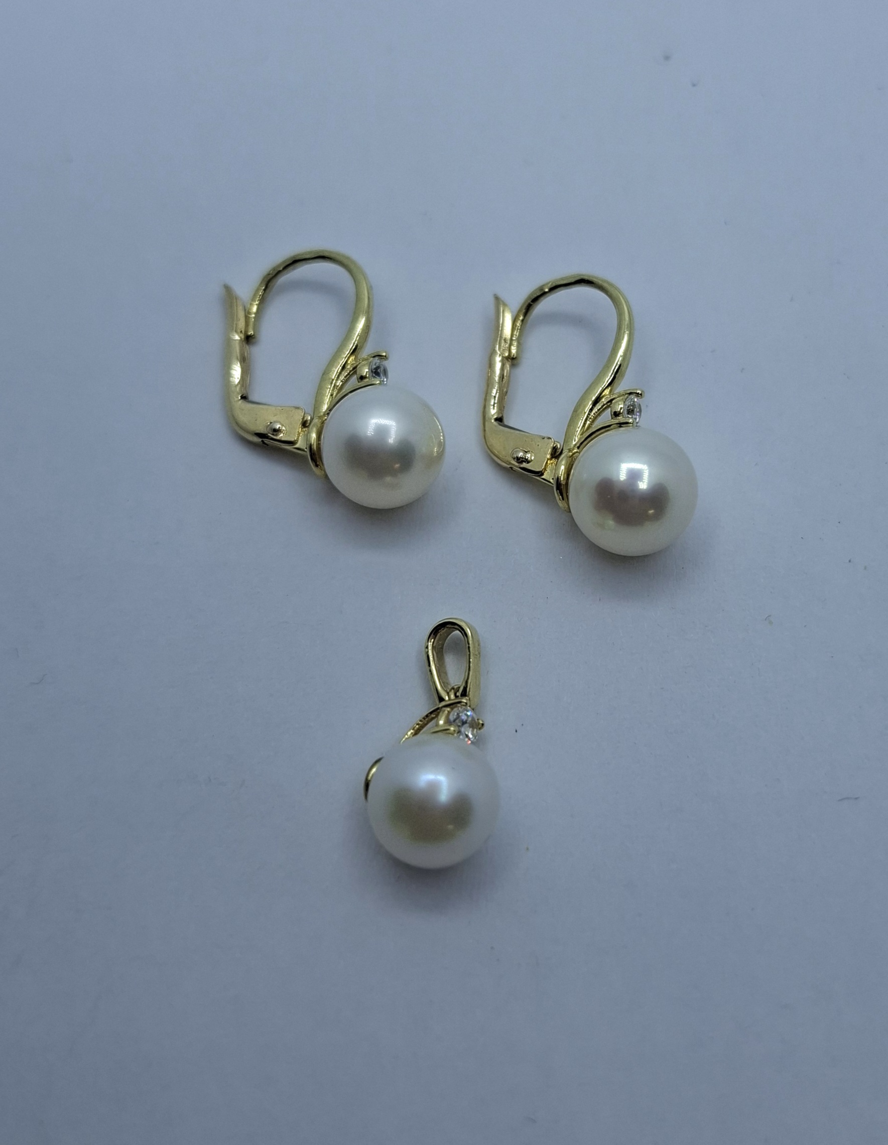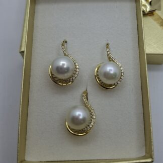 Sárga arany gyöngyös hagyományos kapcsos fülbevaló, hozzá tartozó medállal. A gyöngy fölött  1 kis cirkónia csillogó kővel. A fülbevaló hossza:2cm, a tenyésztett gyöngy mérete:7,7mm. A medál teljesen olyan mint a fülbevaló. Szett súlya:4gr, 14kt.