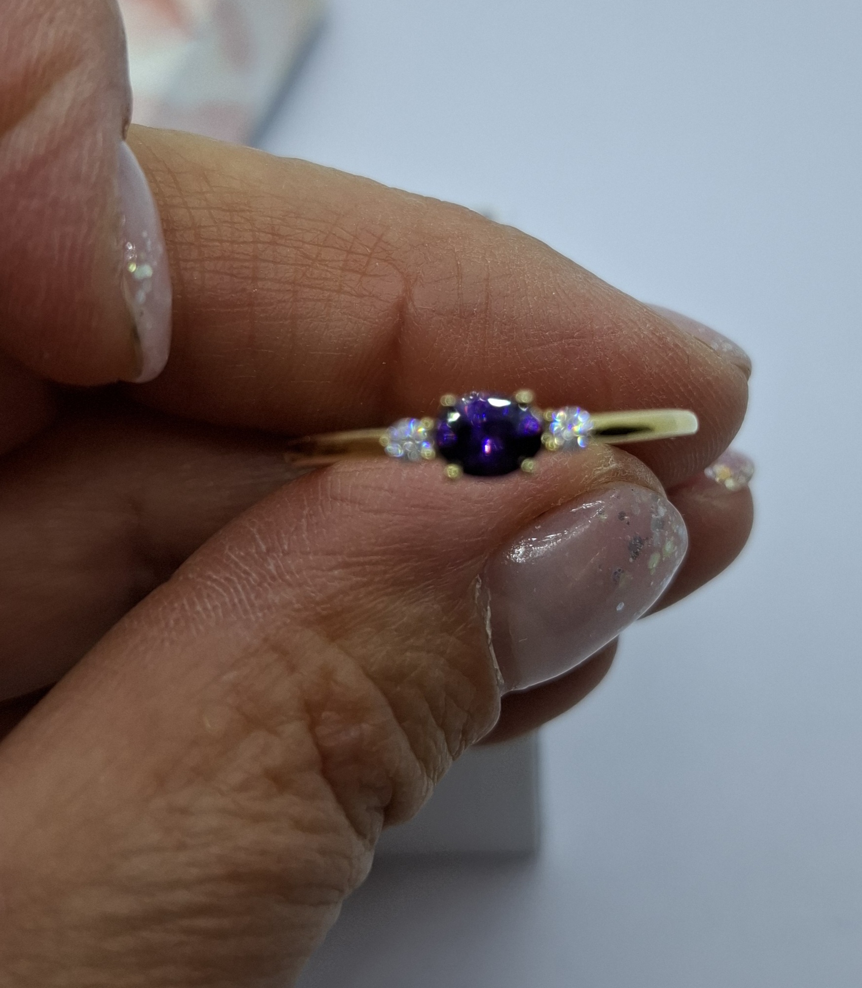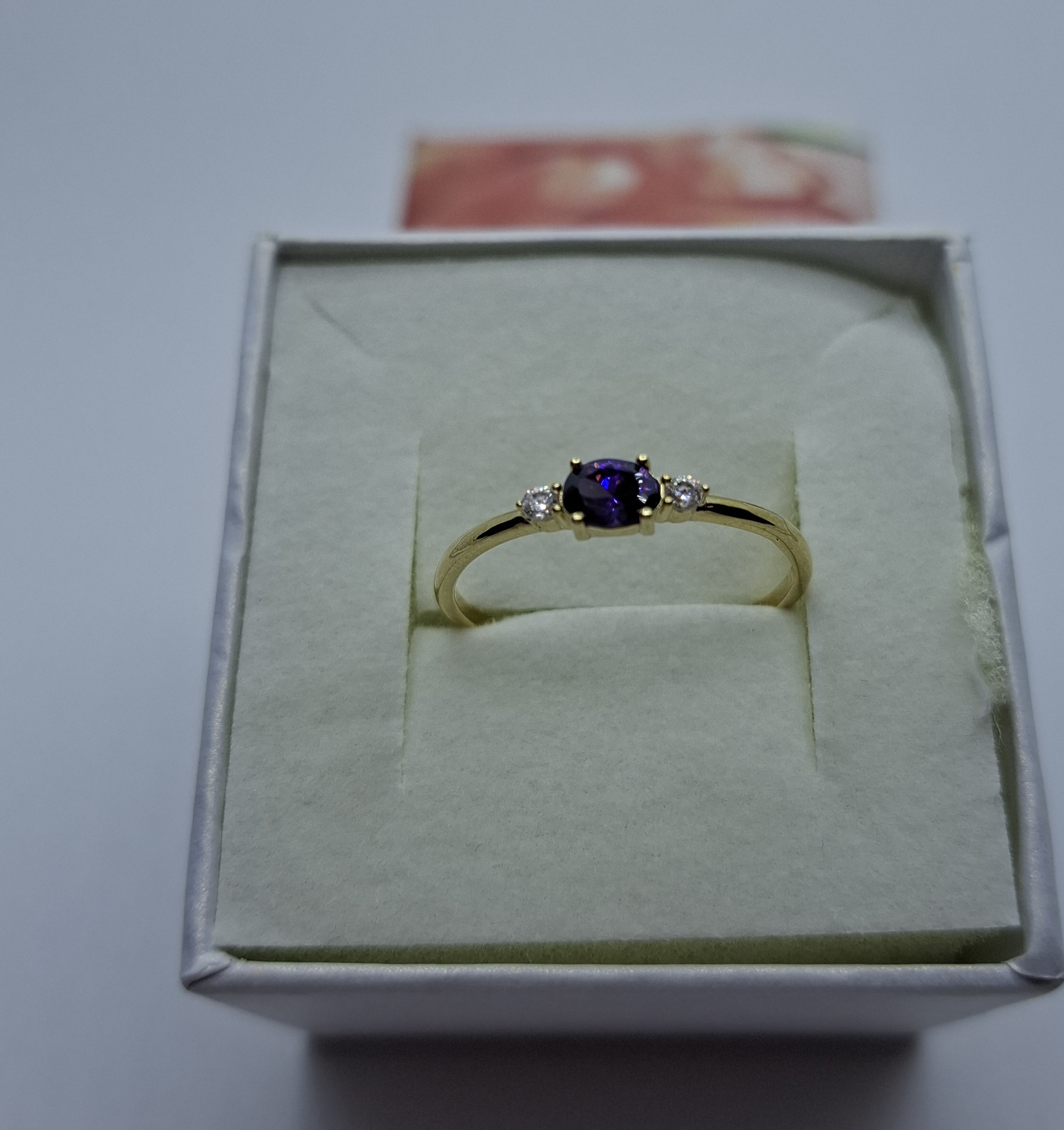 Arany női gyűrű, középen lila, mellette kis fehér cirkónia kővel. A gyűrű mérete:63, súlya:1,6gr, 14kt. A lila kő:4mmX5mm. A gyűrű sinje:1,5mm. Mutatós, szolíd.