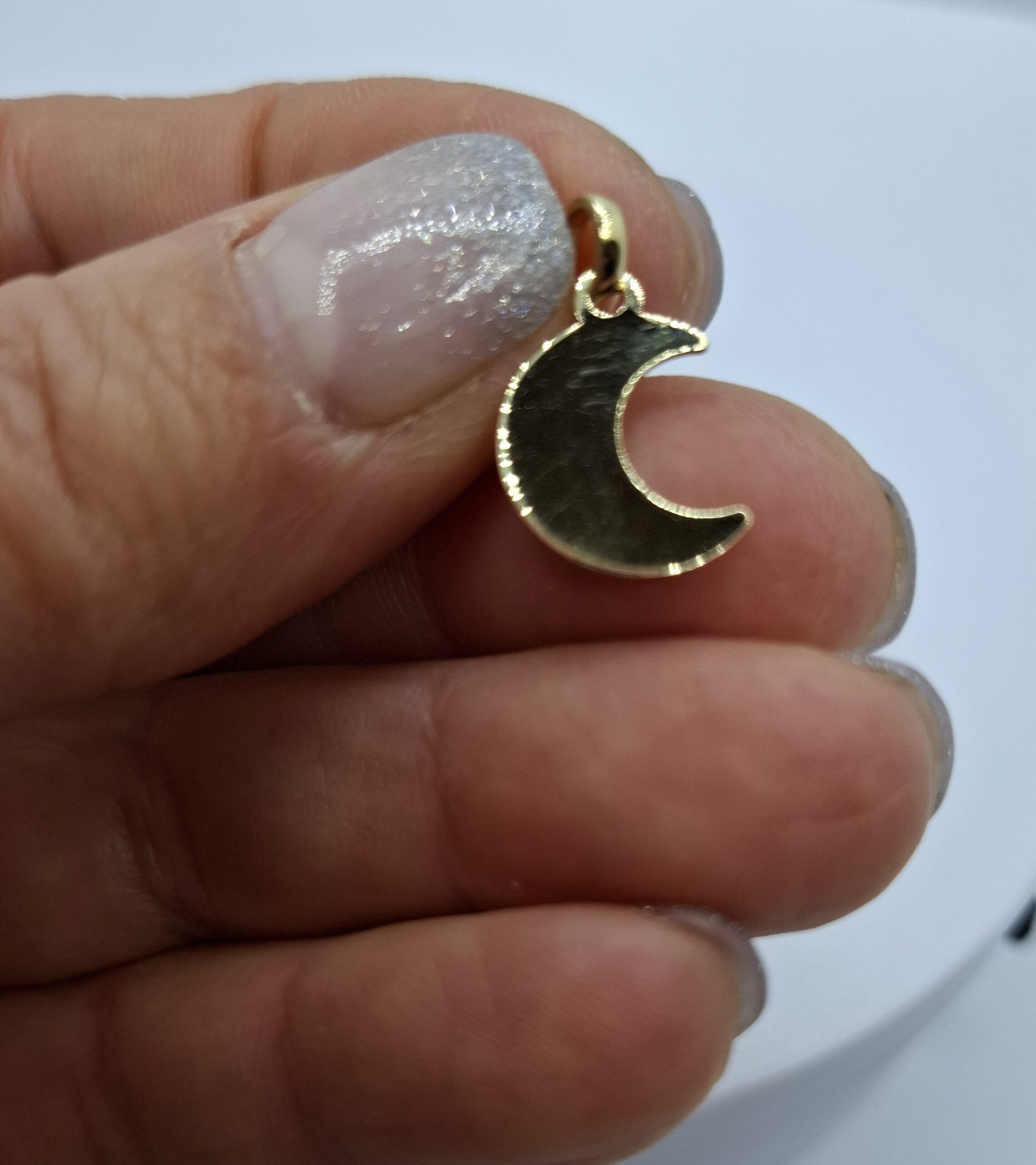 Sárga arany hold medál, fényes, sima, mutatós. Hossza: 1,5cm+karika:3cm, szélessége:1,2cm. Súlya:0,8gr, 14kt.
