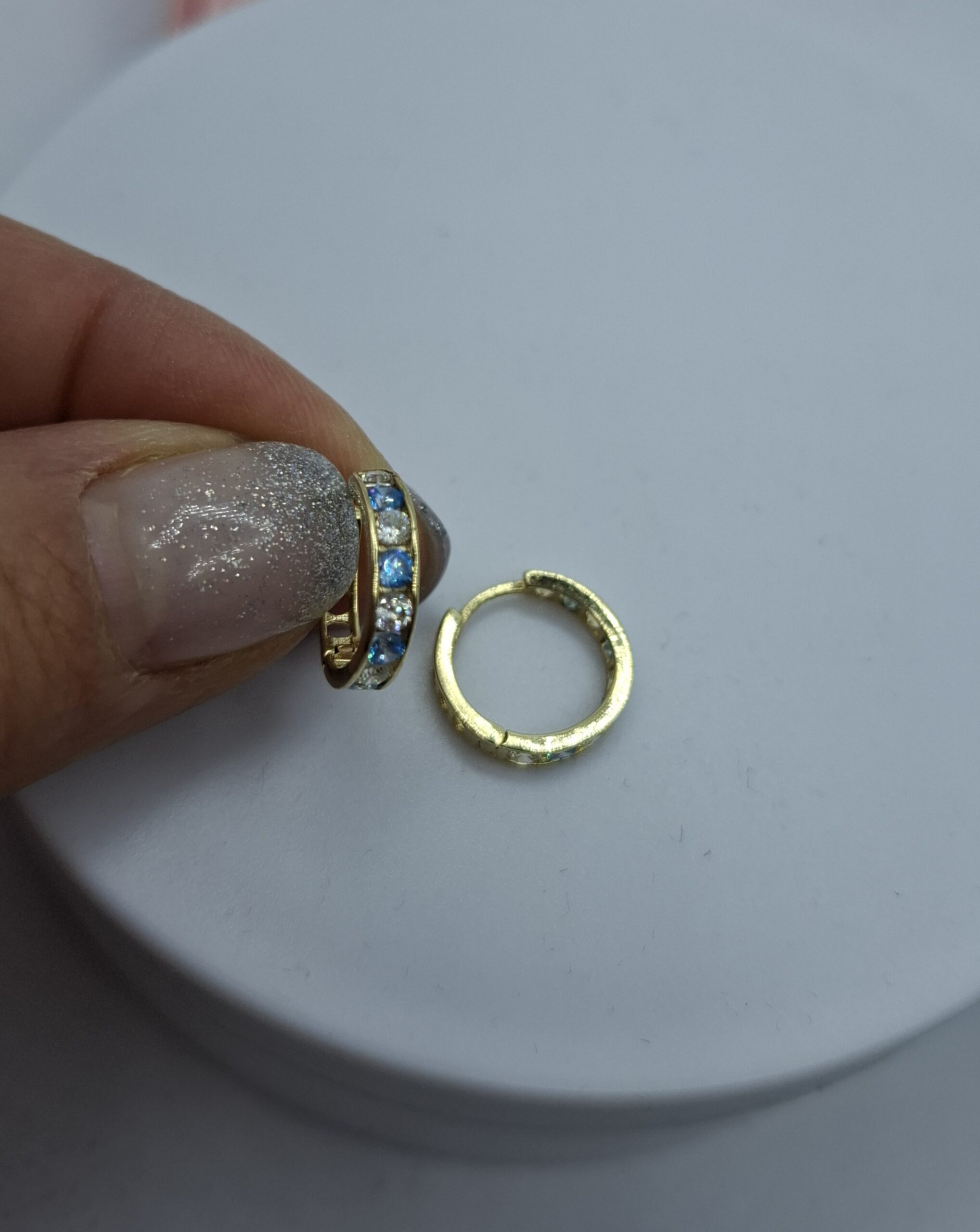 Arany karika fülbevaló, kék-fehér kövekkel. 5600