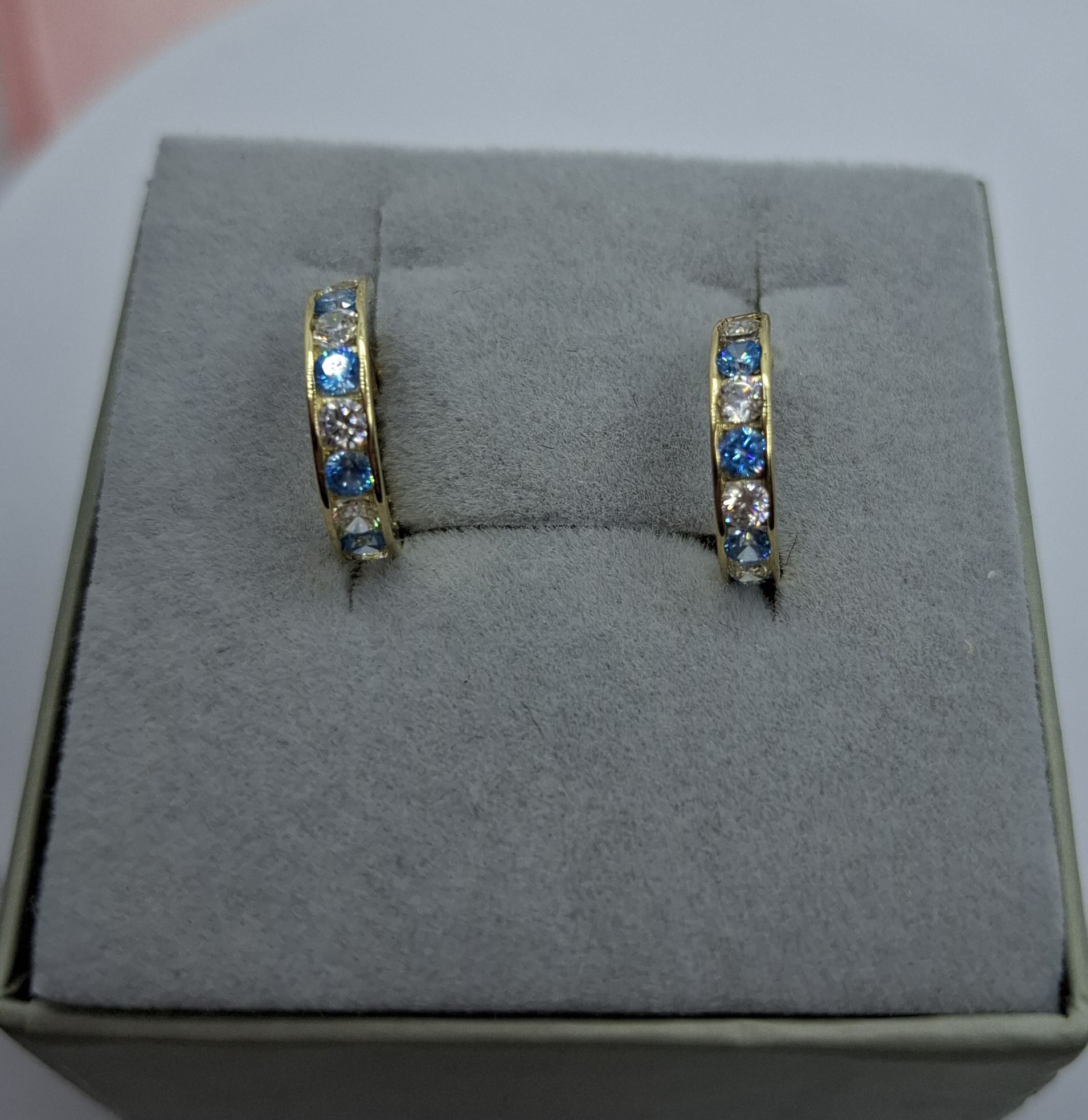1 pár sárga arany karika fülbevaló, elől viágoskék-fehér kövekkel. Mérete:1,3cm, szélessége:2,5mm. Súlya:1,6gr, 14kt.