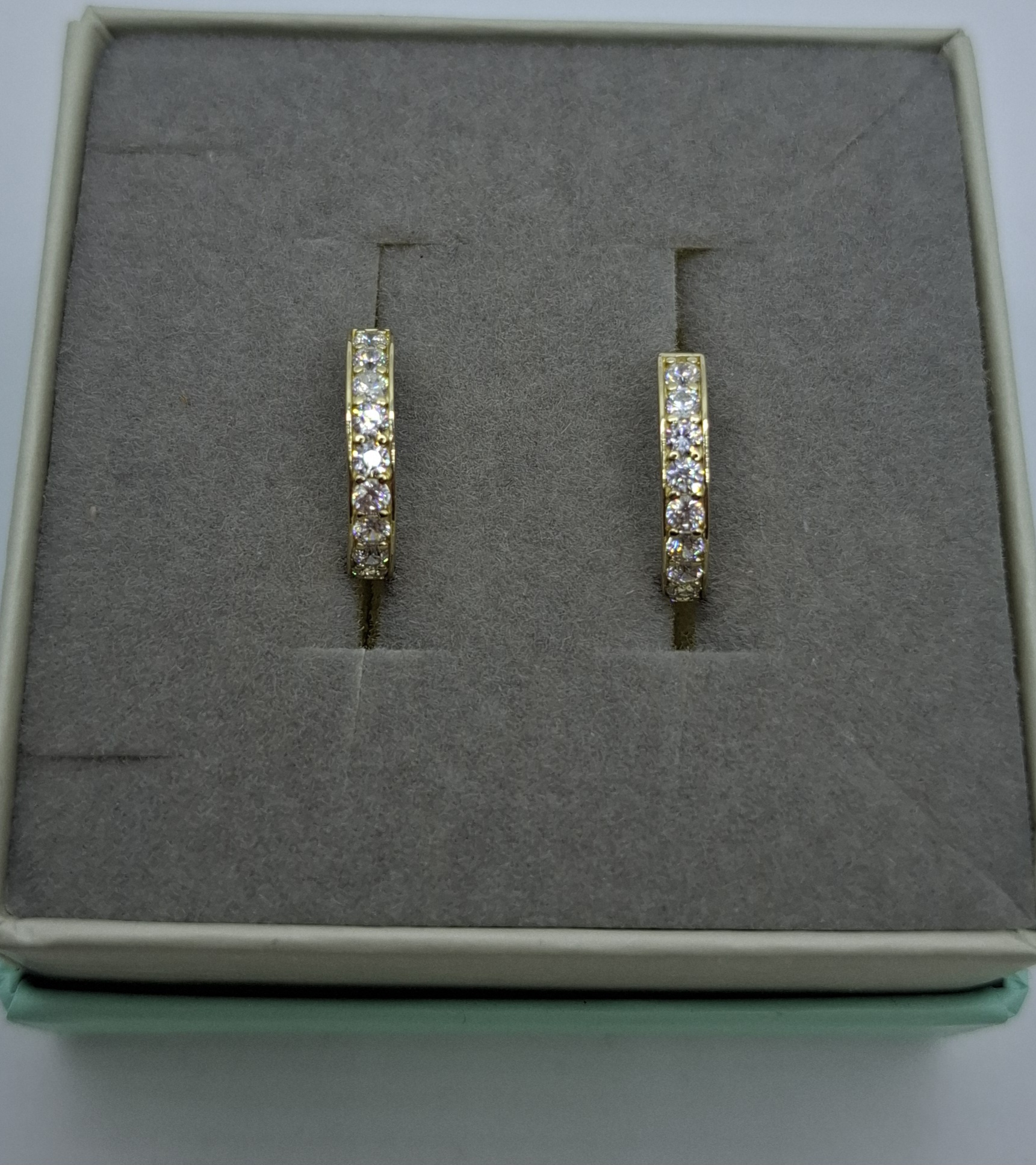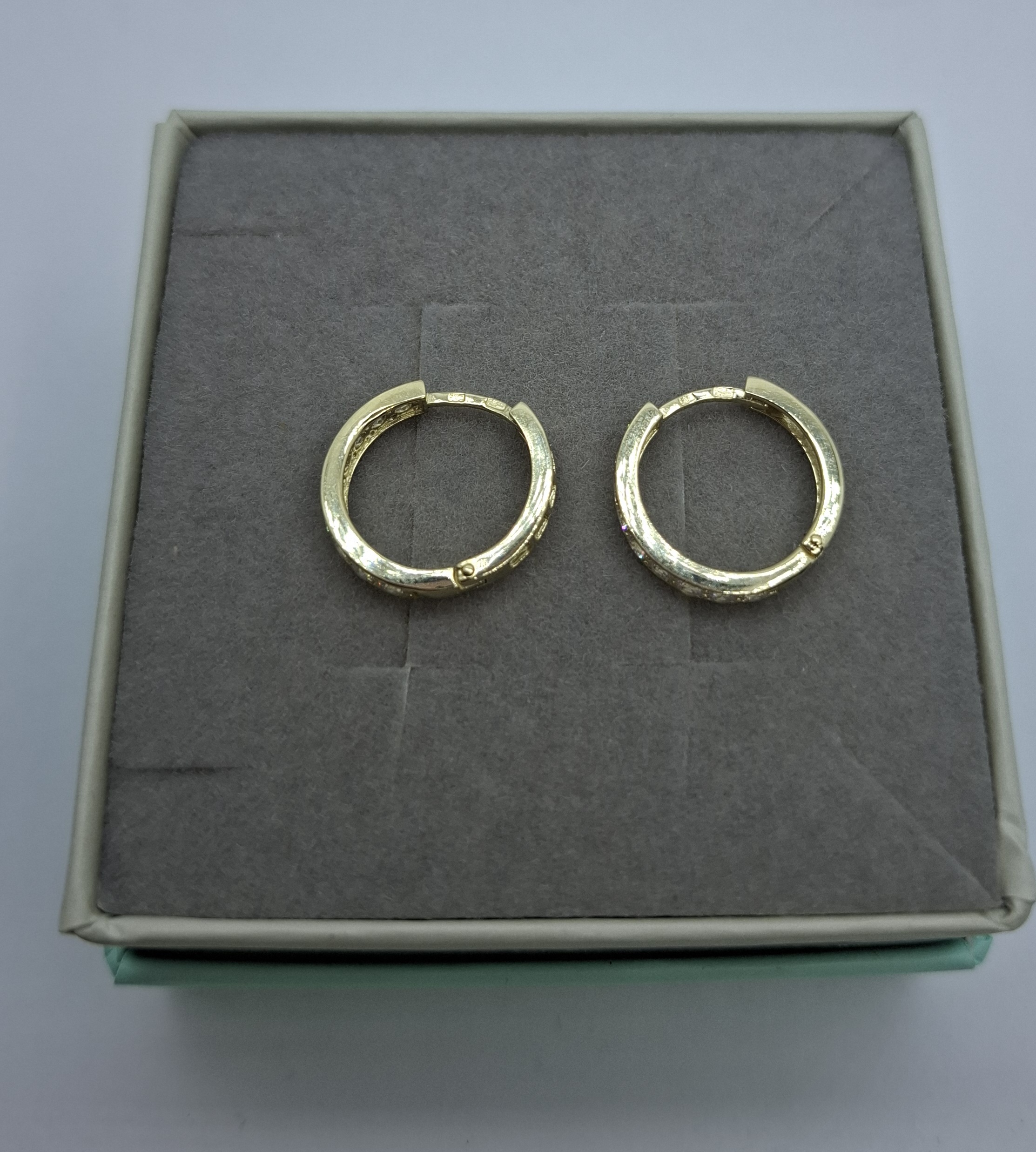 Sárga arany karika fülbevaló, külső átmérő:1,5cm. Elől csillogó cirkóniákkal. Szélessége:2,7mm, súlya:2,3gr, 14kt. Középen ketté nyitható. Modern.