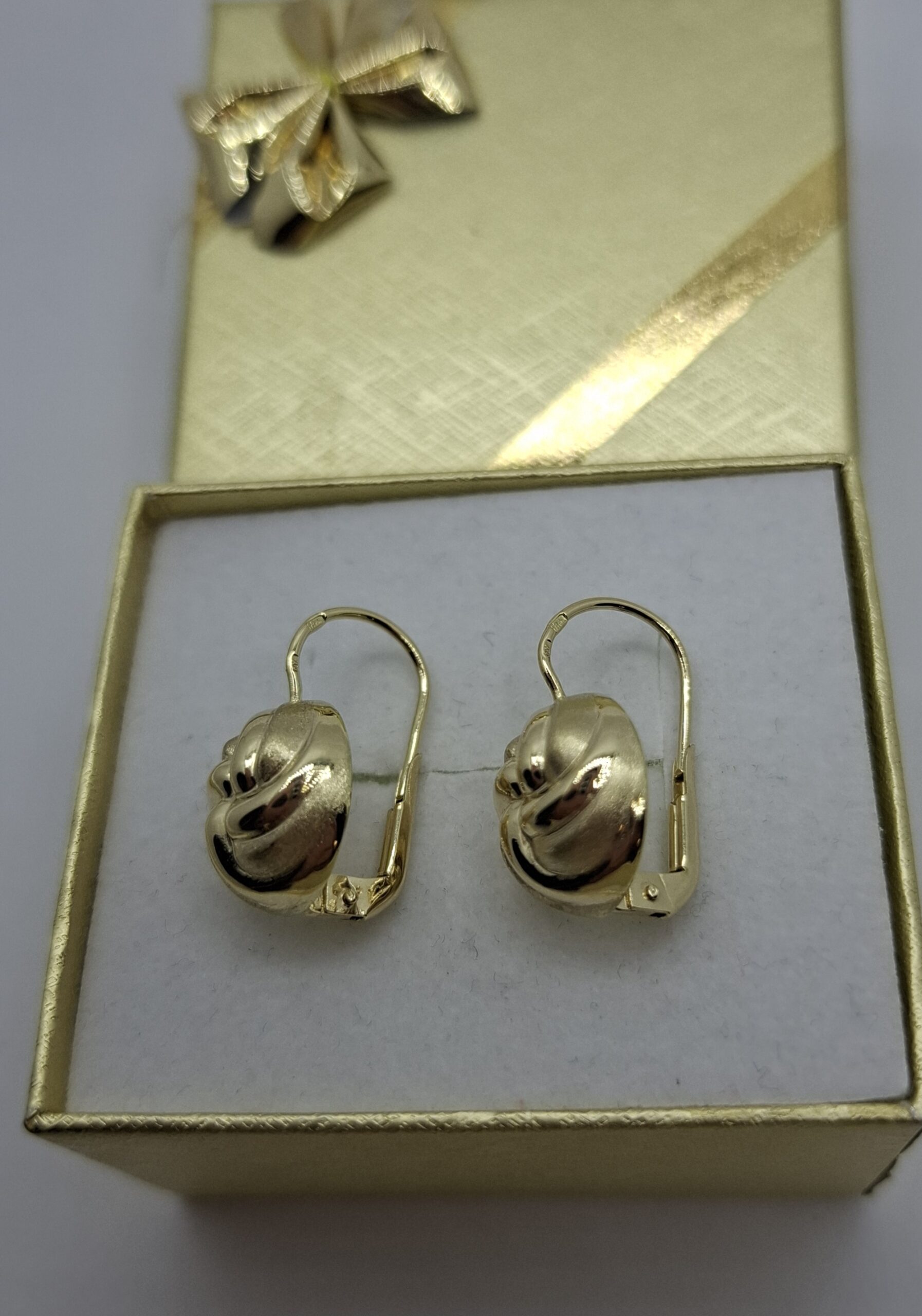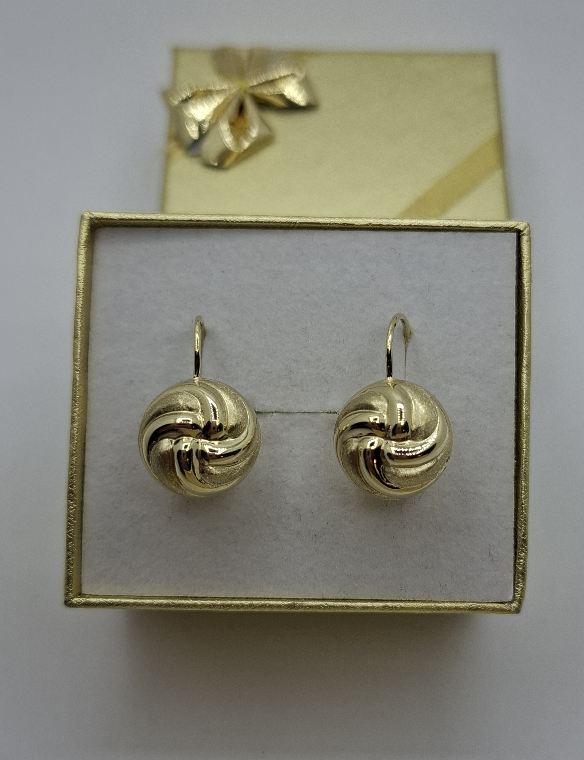 1 pár sárga arany fülbevaló, lencse, csavart matt-fényes mintával. Fej mérete:13mm, teljes hossza:2,1cm. Súlya:3,5gr, 14kt. Mutatós, modrern. Hátul hagyományos lebillenő kapoccsal.