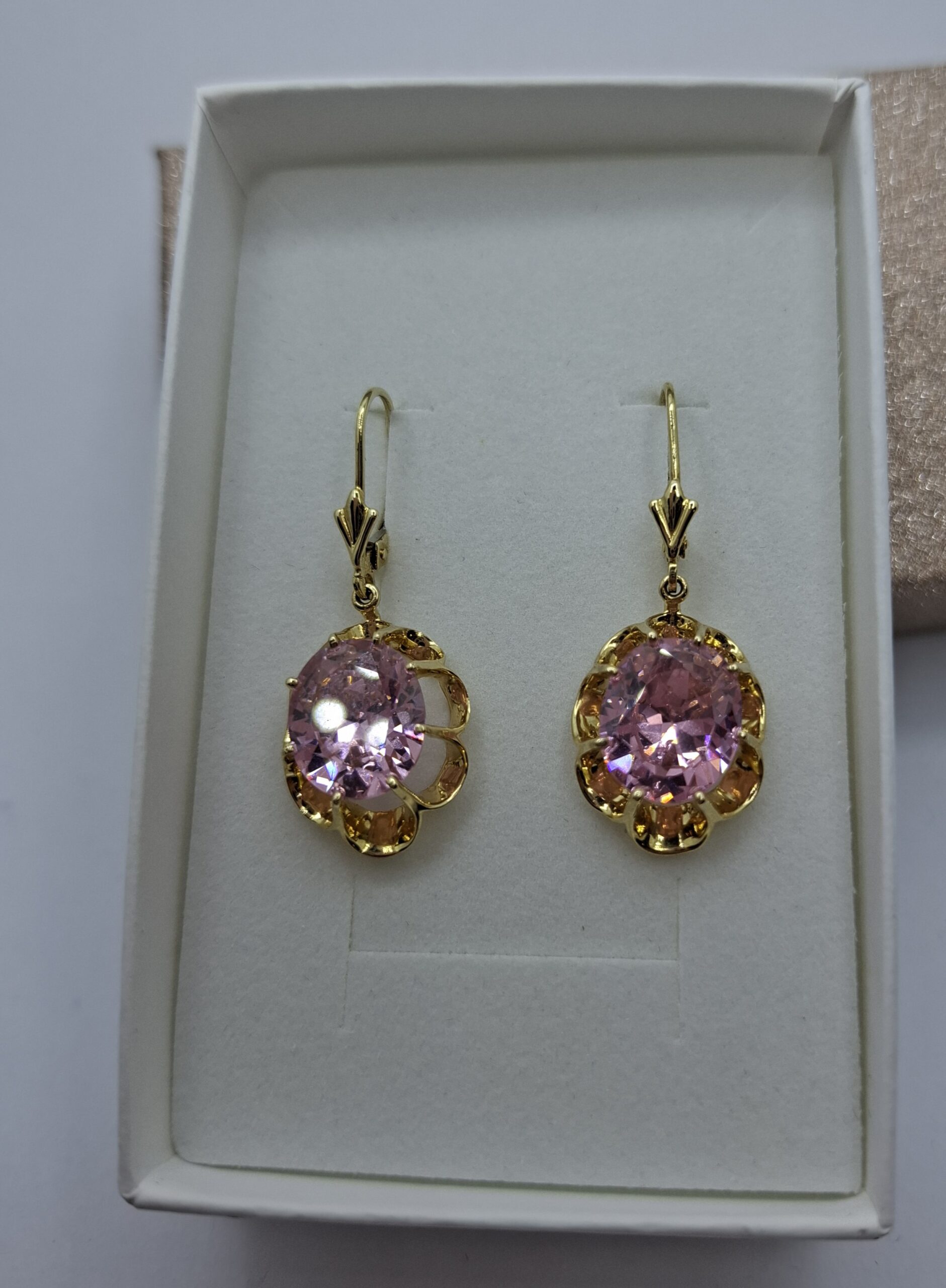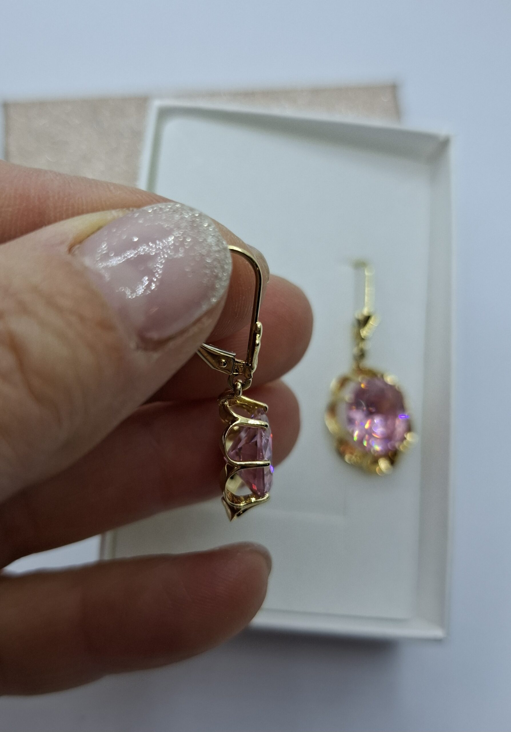Sárga arany lógós fülbevaló, szép halvány rózsaszín cirkónia kővel, hátul hagyományos lebillenő kapoccsal. Hossza:3,7cm, szélessége alul a legszélesebb részen:1,5cm, súlya:6,3gr, 14kt.