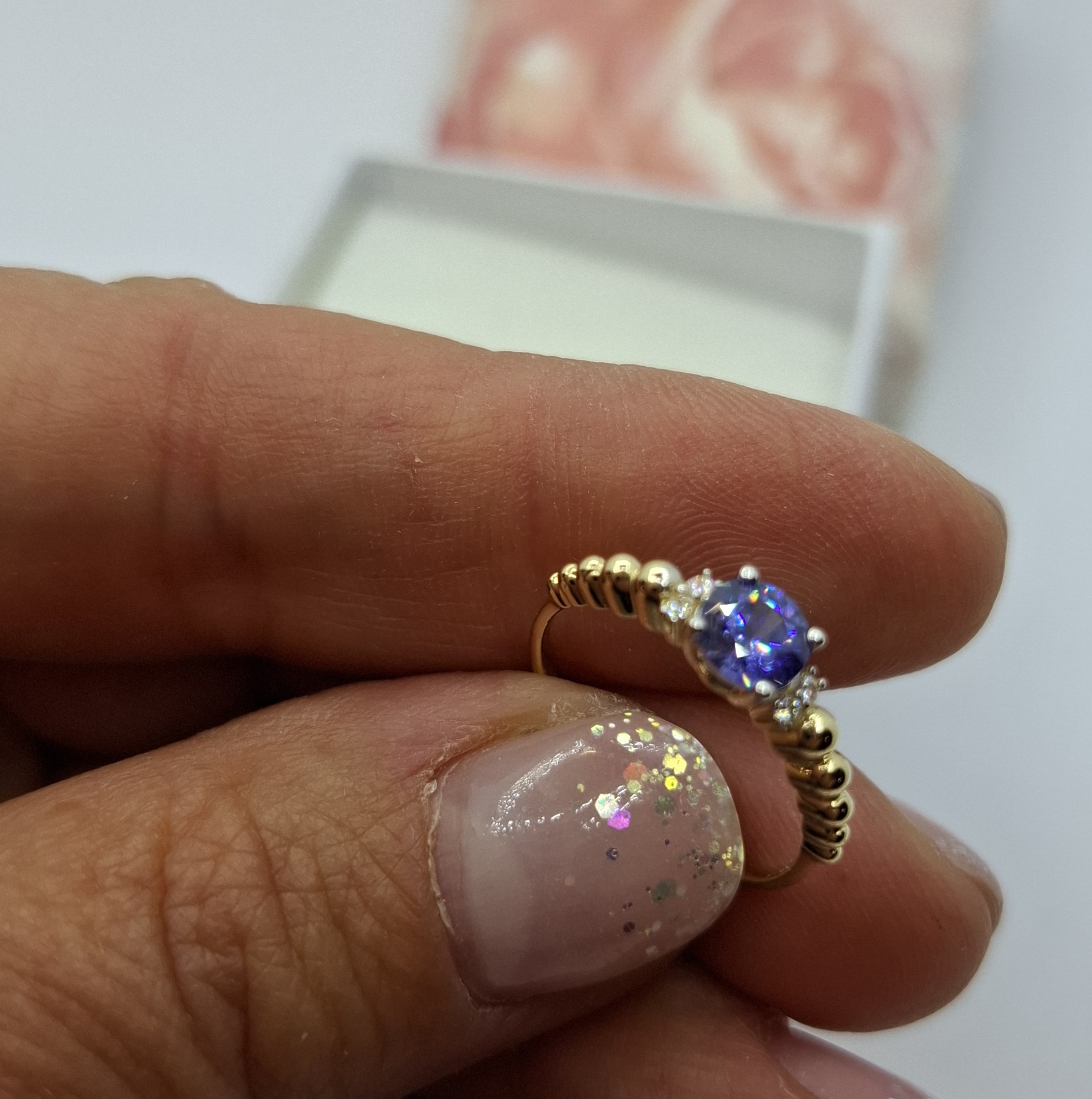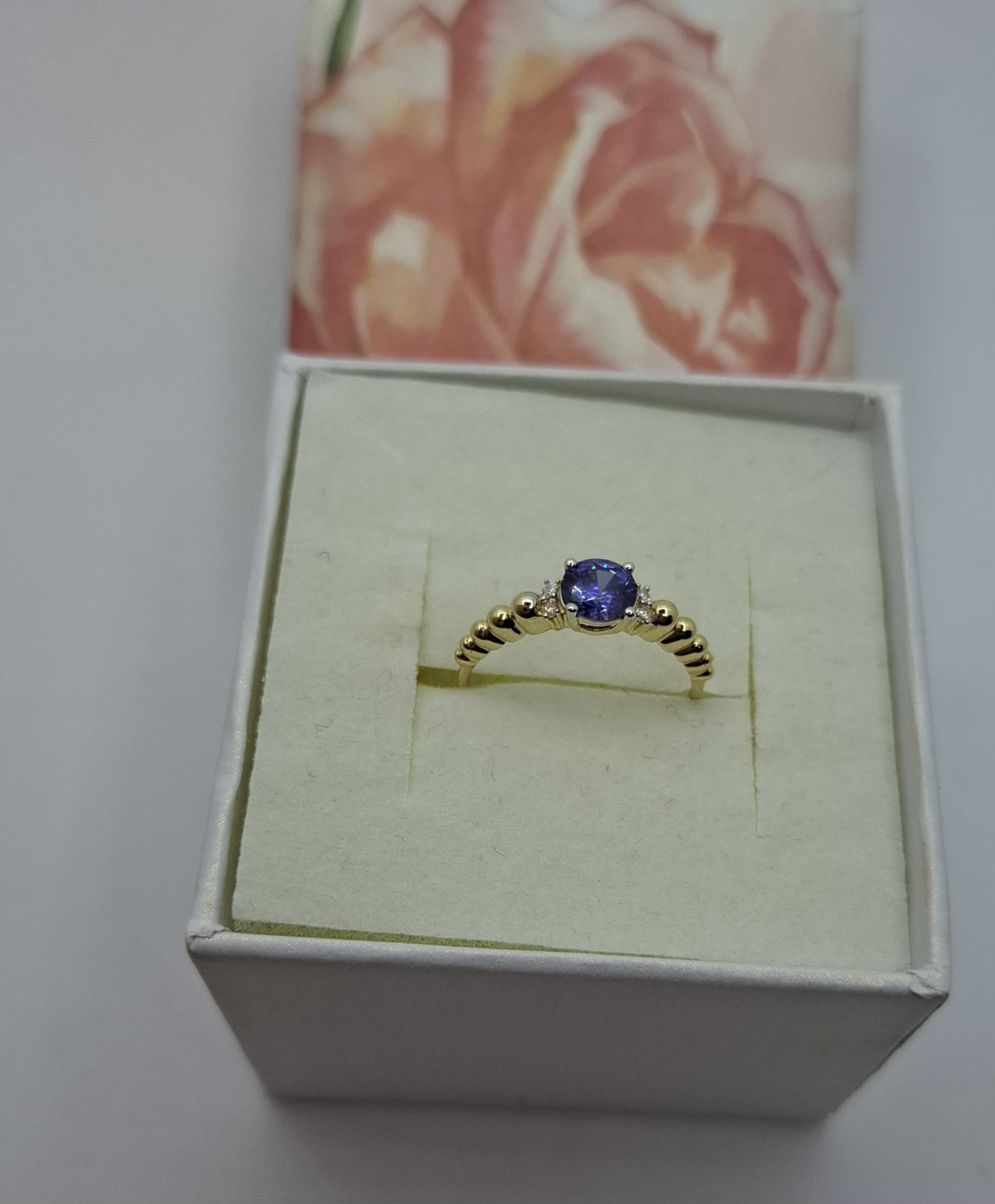 Sárga arany vékonyabb női gyűrű, szép közép kék szint. kővel. Gyűrű mérete:51. a kő:5mm, oldalt alul:2mm. Mutatós, szolíd. Súlya:1,5gr, 14kt.