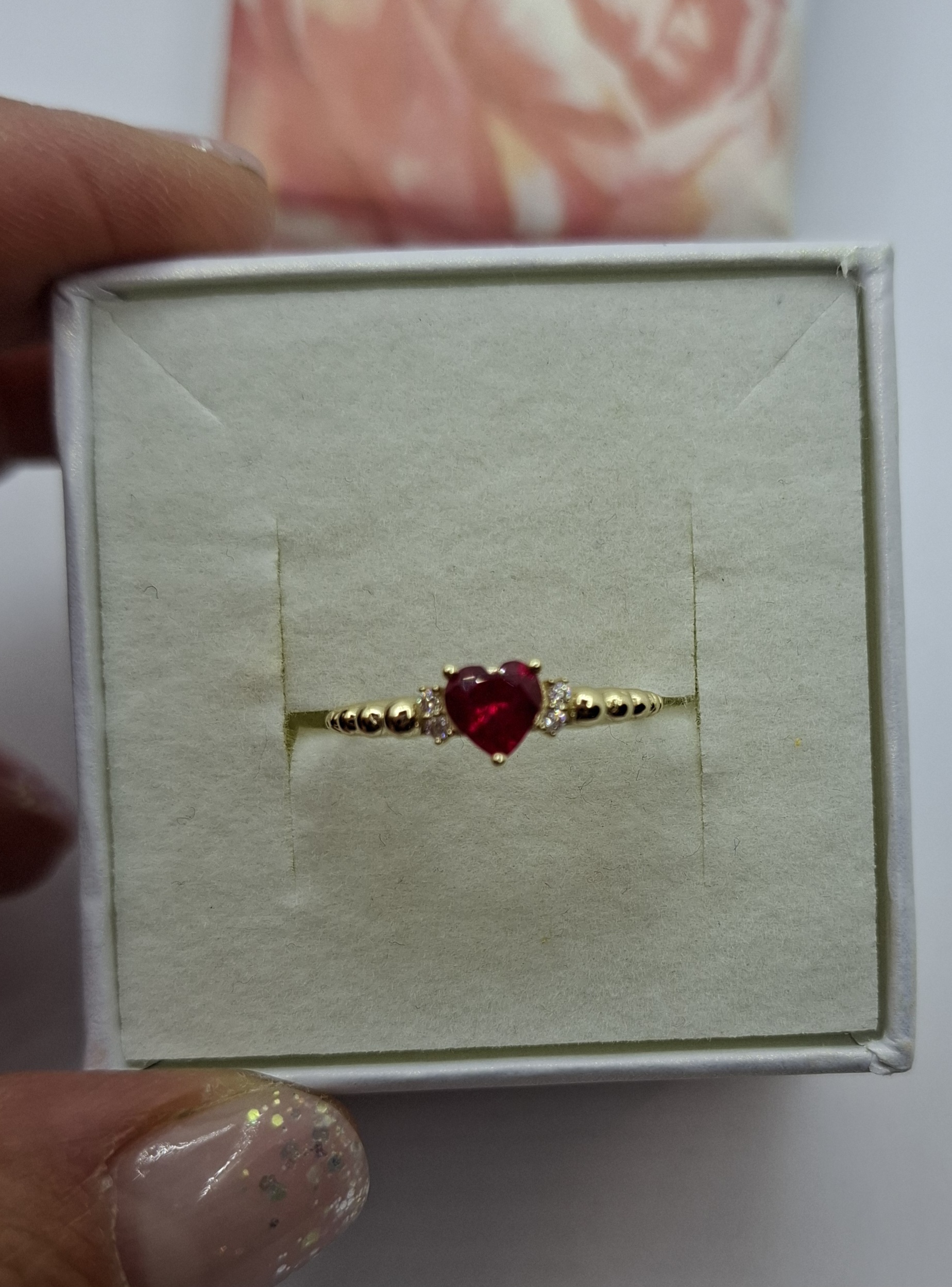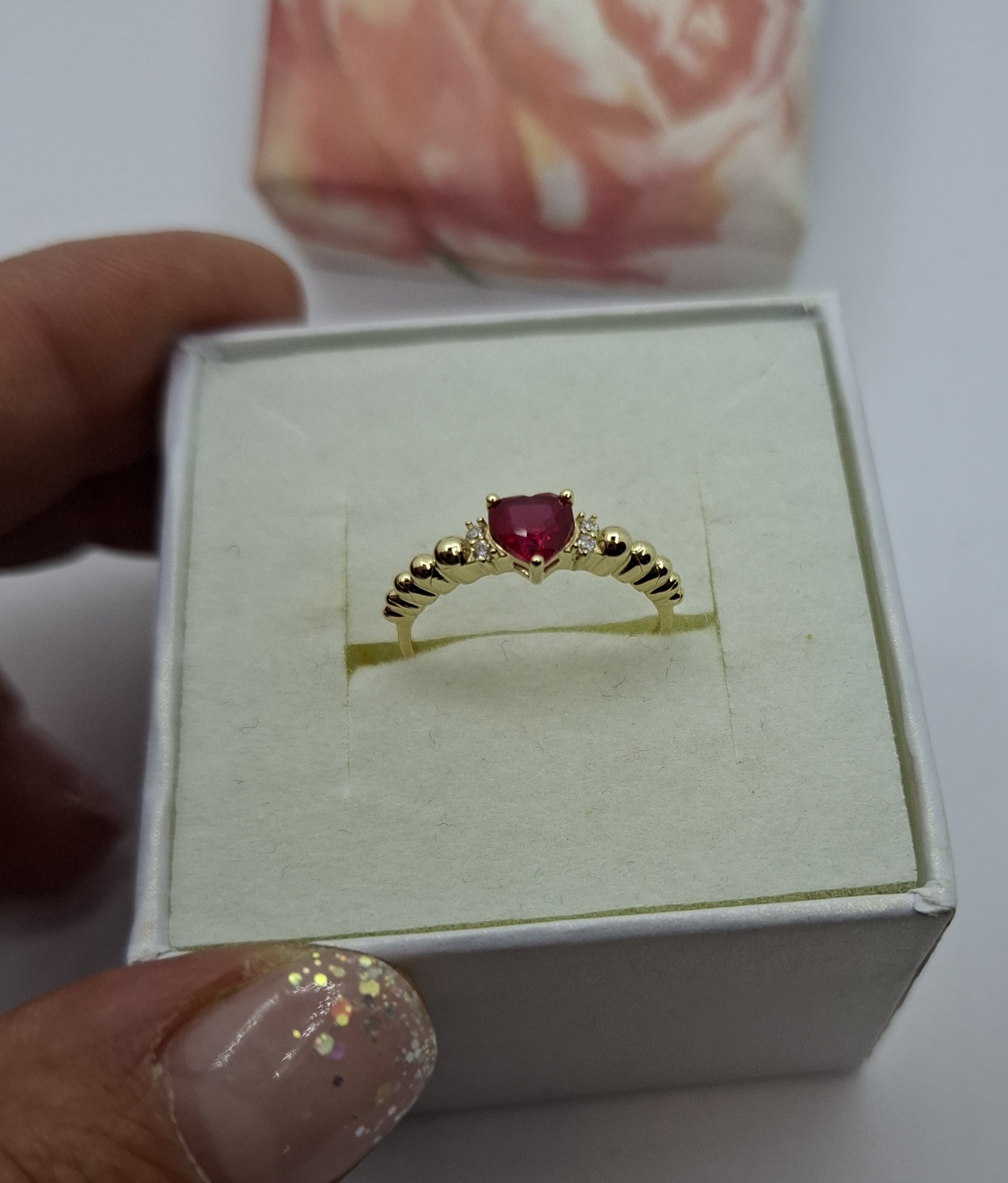 Sárga arany női gyűrű, benne 5mm szív cirkónia kő, mellette fehér csillogó cirkónia. Gyűrű mérete:51, súlya:1,6gr, 14kt. 2mm gyűrű szélesség, kivéve a szívnél.