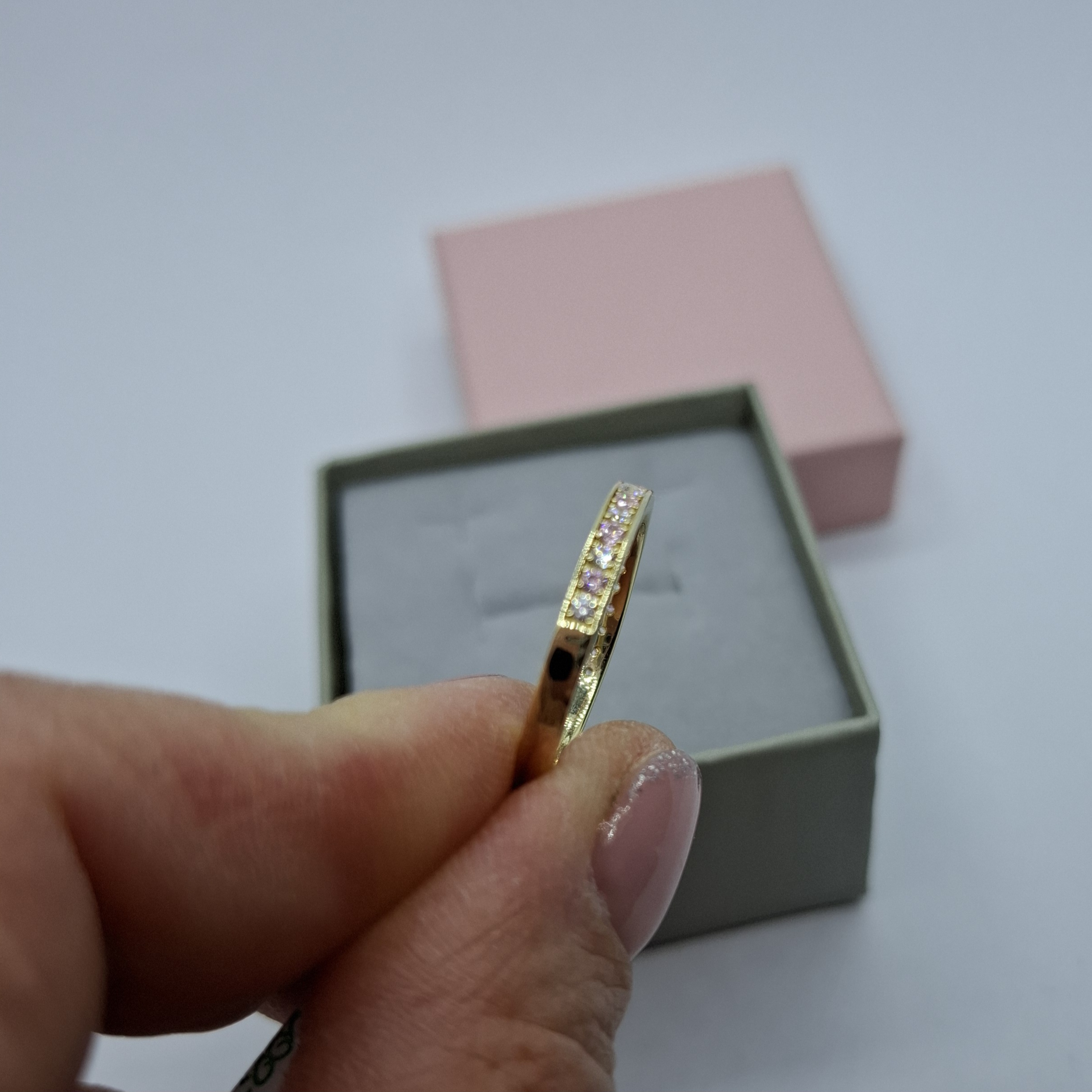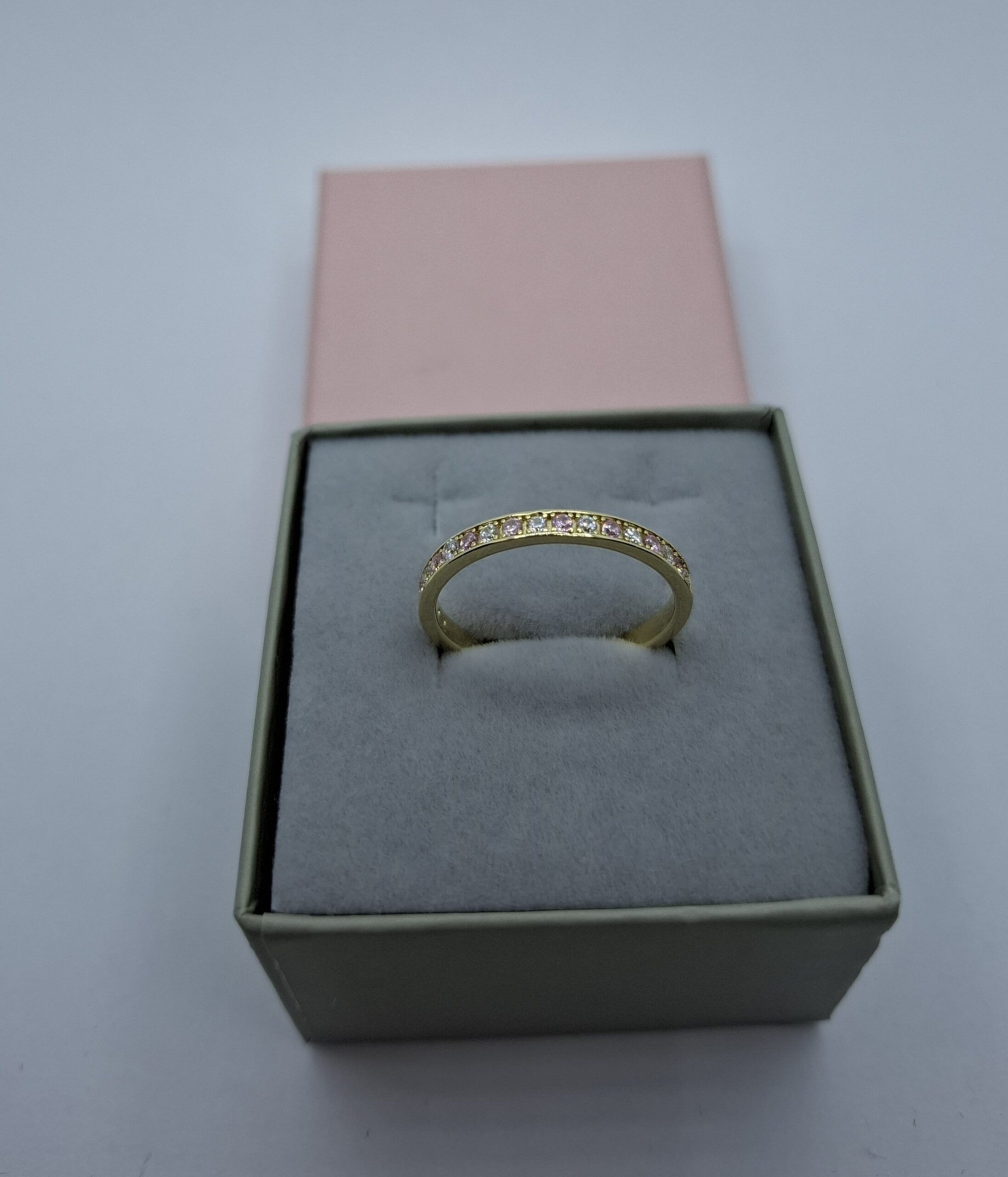 Sárga arany női gyűrű, félig kövekkel. Halvány rózsaszín és fehér cirkóniákkal váltakozik. Mérete:60. szélessége:2,5mm, súlya:2,4gr, 14kt magyar fémjelzett. Szolíd, mutatós.