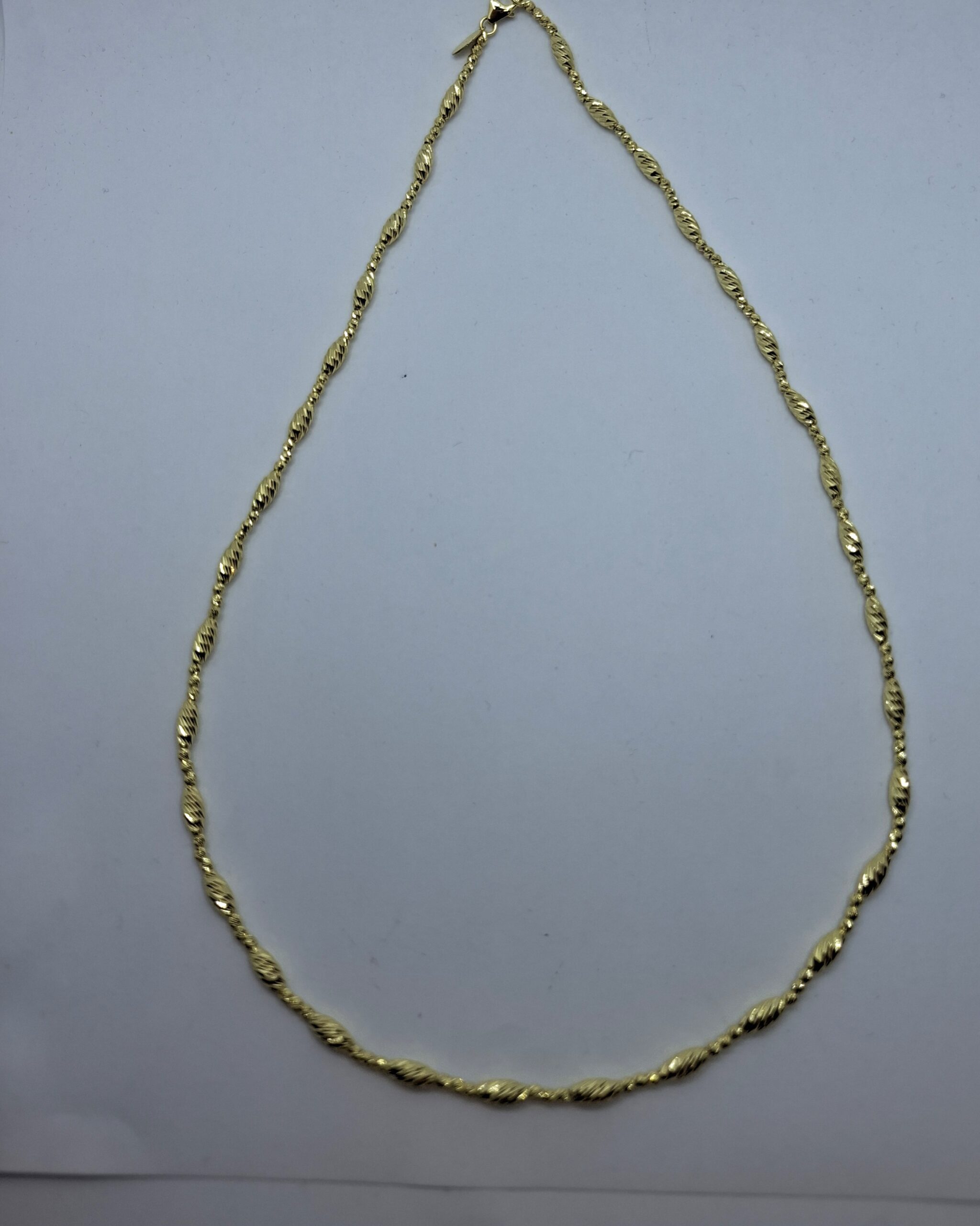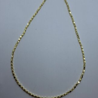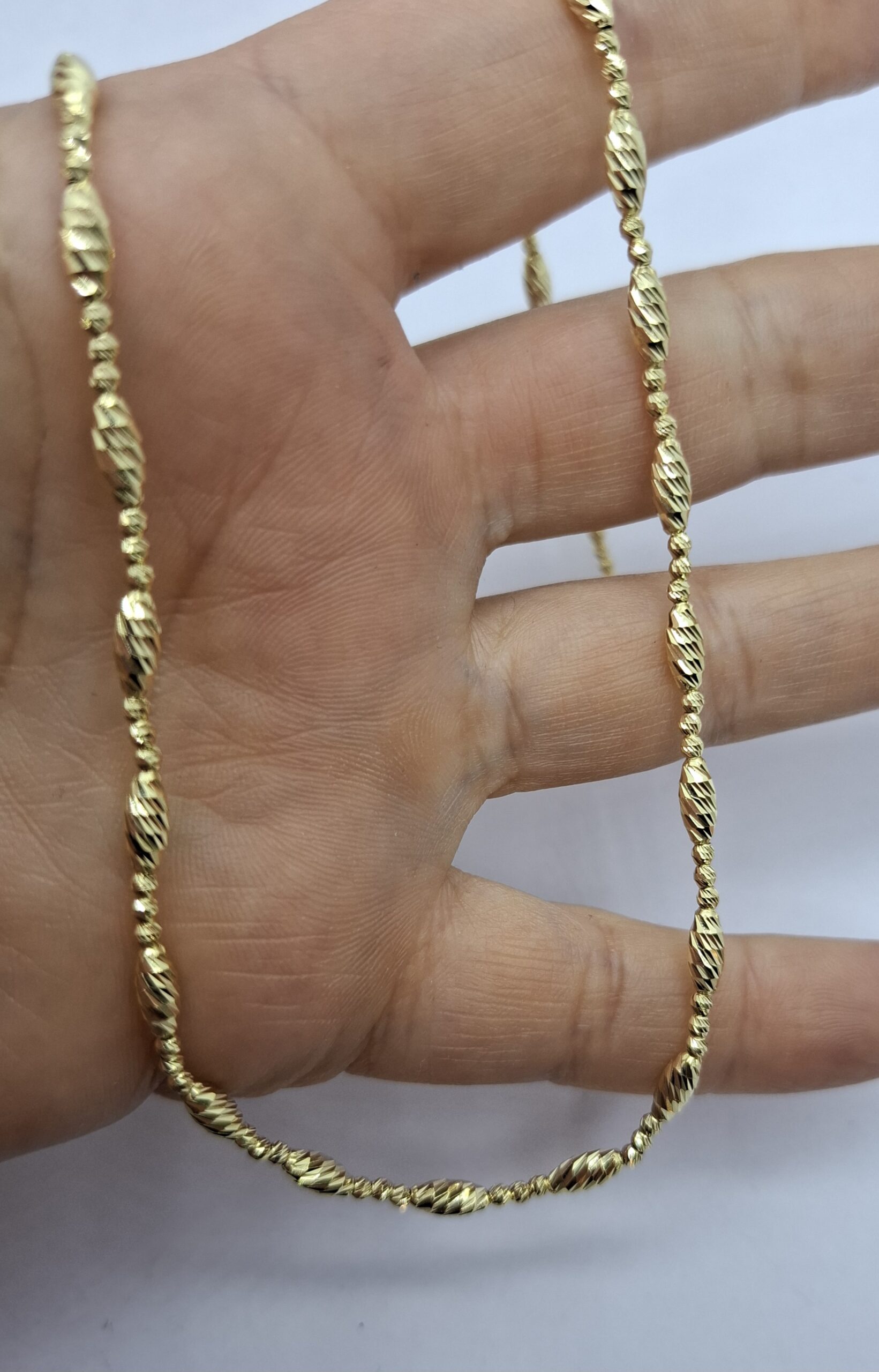 Sárga arany nyaklánc, 45cm, csillogós gyémántvésett. 3kis golyó-1 ovál váltakozva. Modern, mutatós. Vastagsága a kis golyónál:2mm, a nagynál:3mm. Súlya:8,1gr, 14kt.