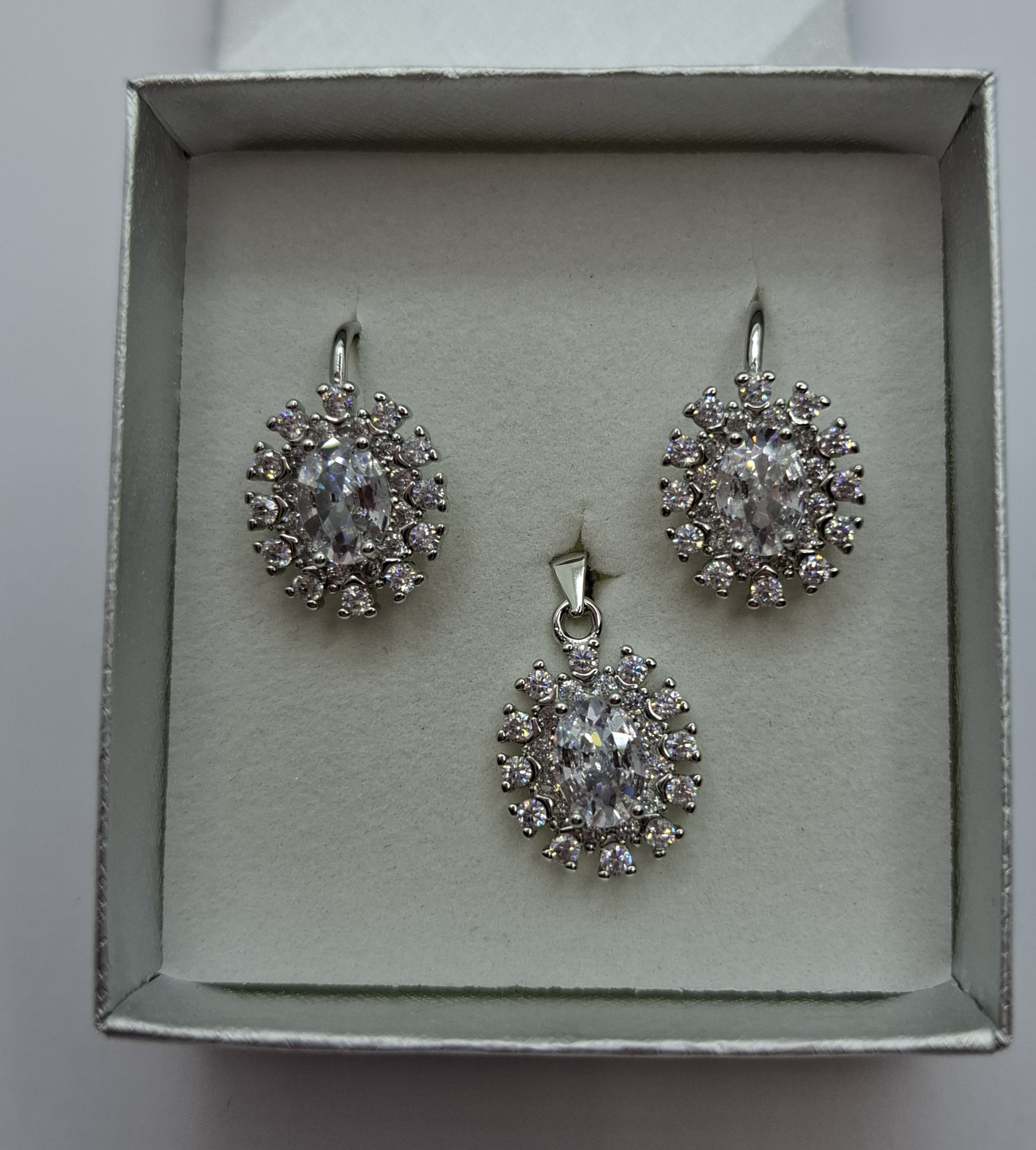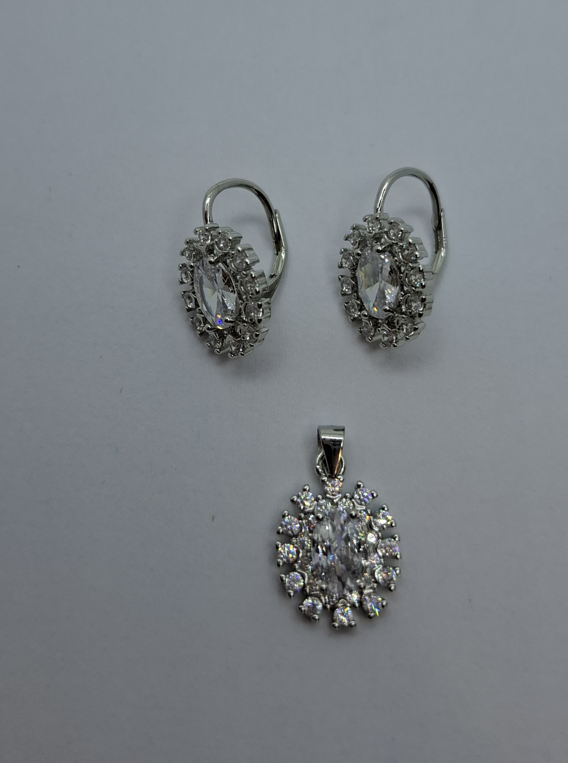 Ezüst hagyományos kapcsos csillogó fehér cirkónia köves fülbevaló+hozzá tartozó medál szett. A fülbevaló hossza:1,8cm, szélessége:11mm. A medál hossza:1,5cm, szélessége:11mm. szett súlya:5gr, 925 ezr.ezüst. Mutatós, csillogó!