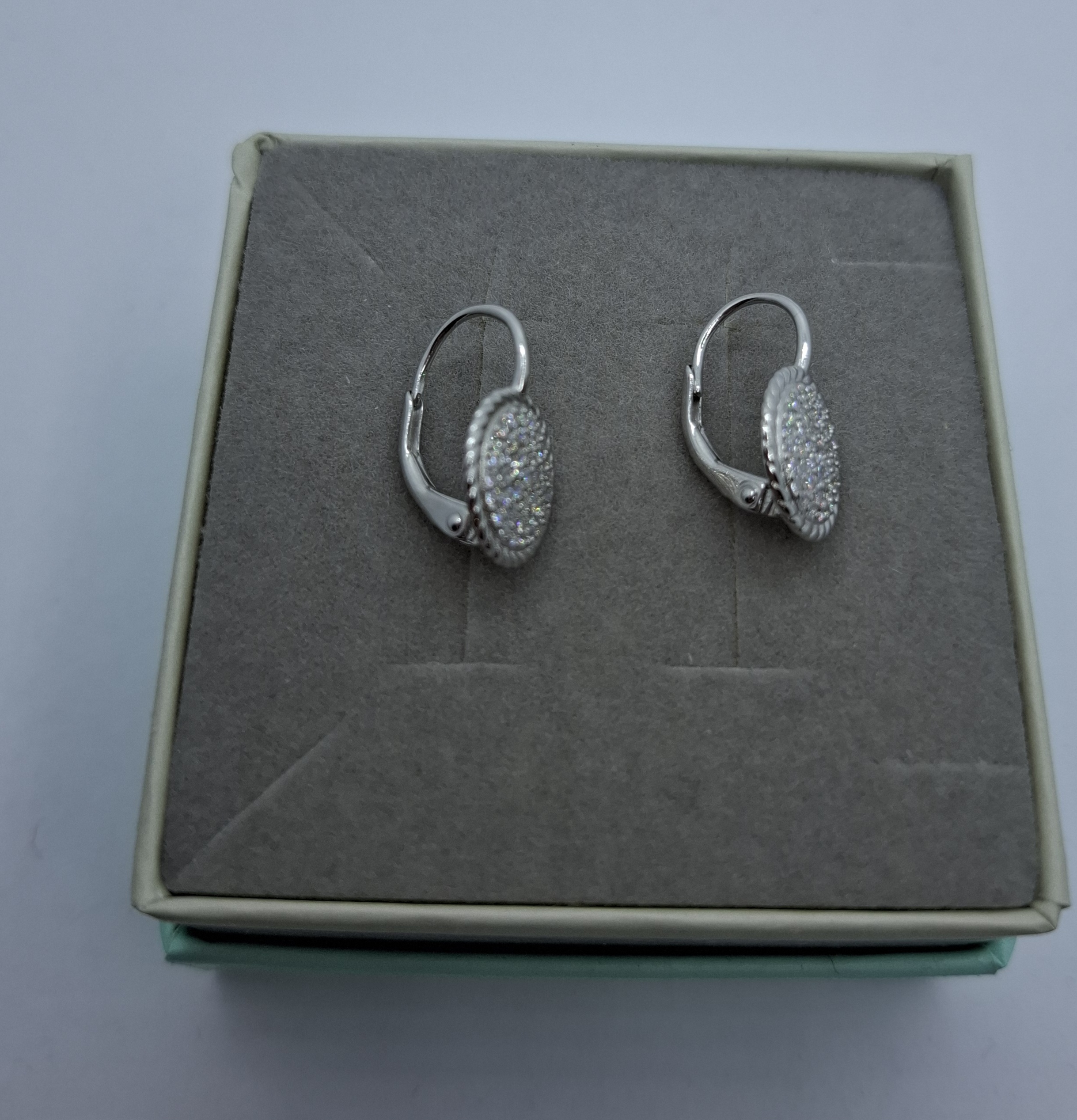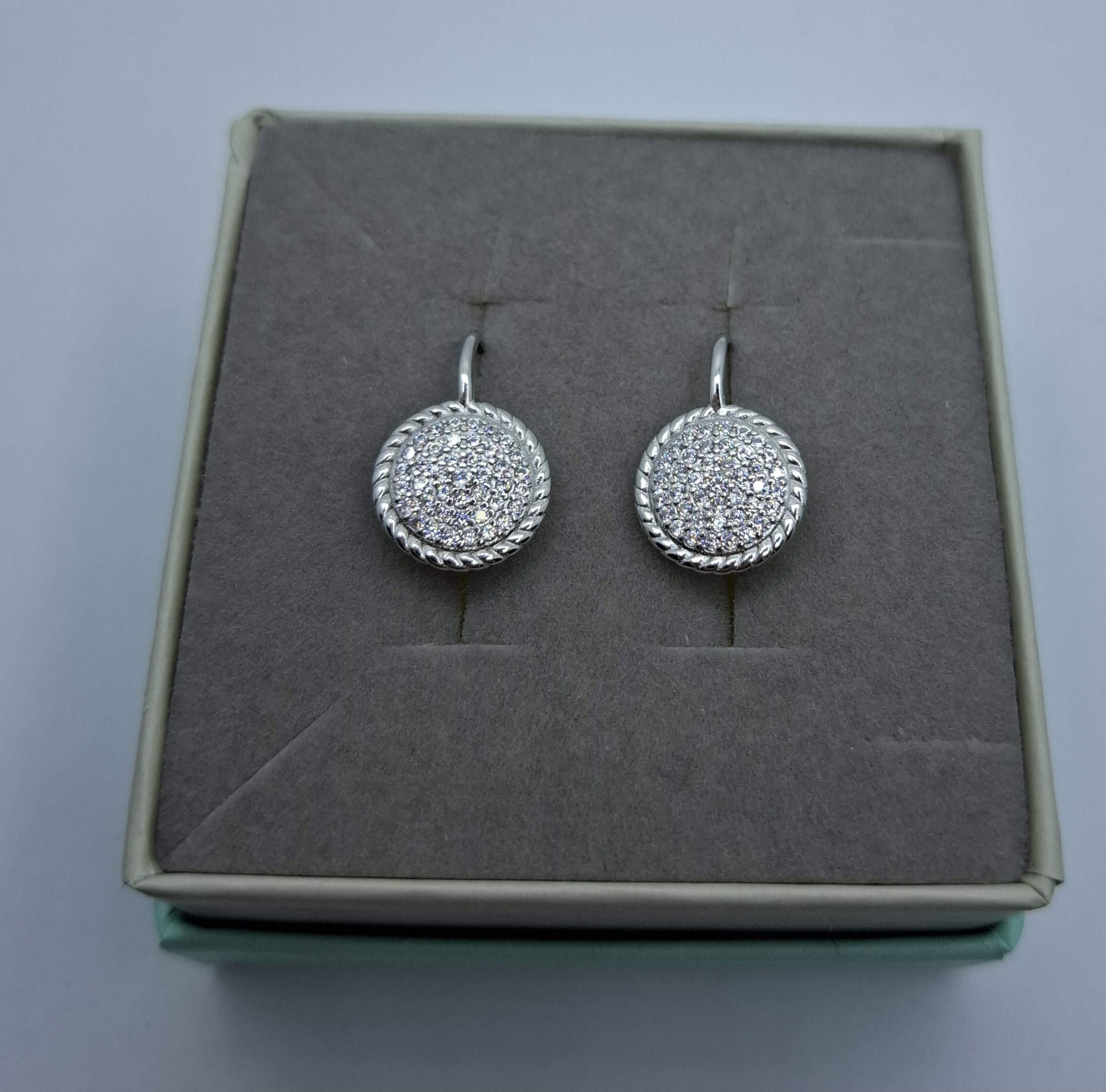 Ezüst fülbevaló, kerek, benne csillogó cirkónia kövekkel. Hagyományos hátul le billenő patenttal. Hossza:1,8cm, szélessége a kerek köves részen:12mm, súlya:2,5gr, 925 ezr. ezüst.