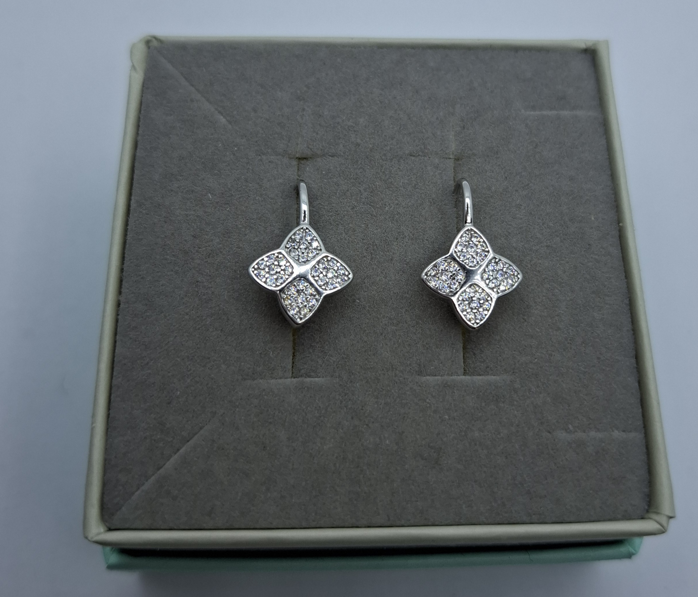 Ezüst virág fülbevaló, cirkónia kövekkel, hátul hagyományos lebillenő kapoccsal. Hossza:1,9cm, szélessége a virágnál:11mm. Súlya:2,6gr, 925 ezr.ezüst.