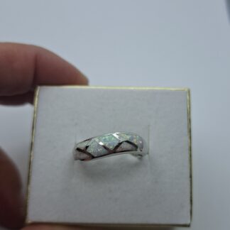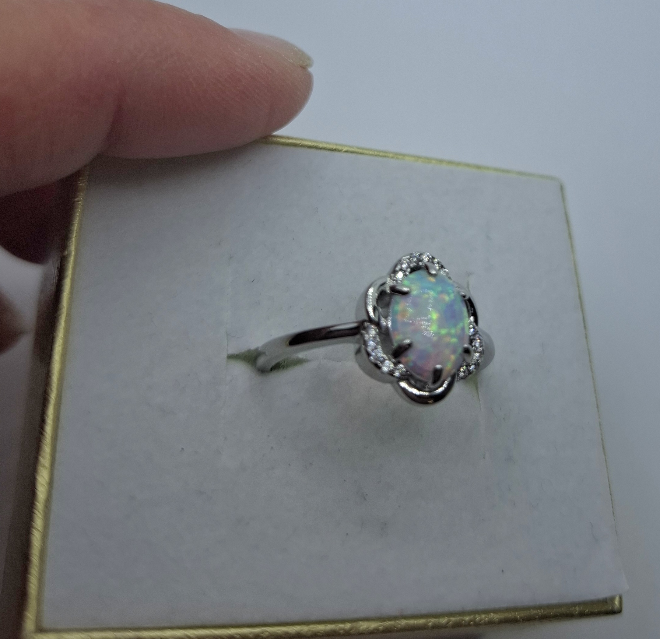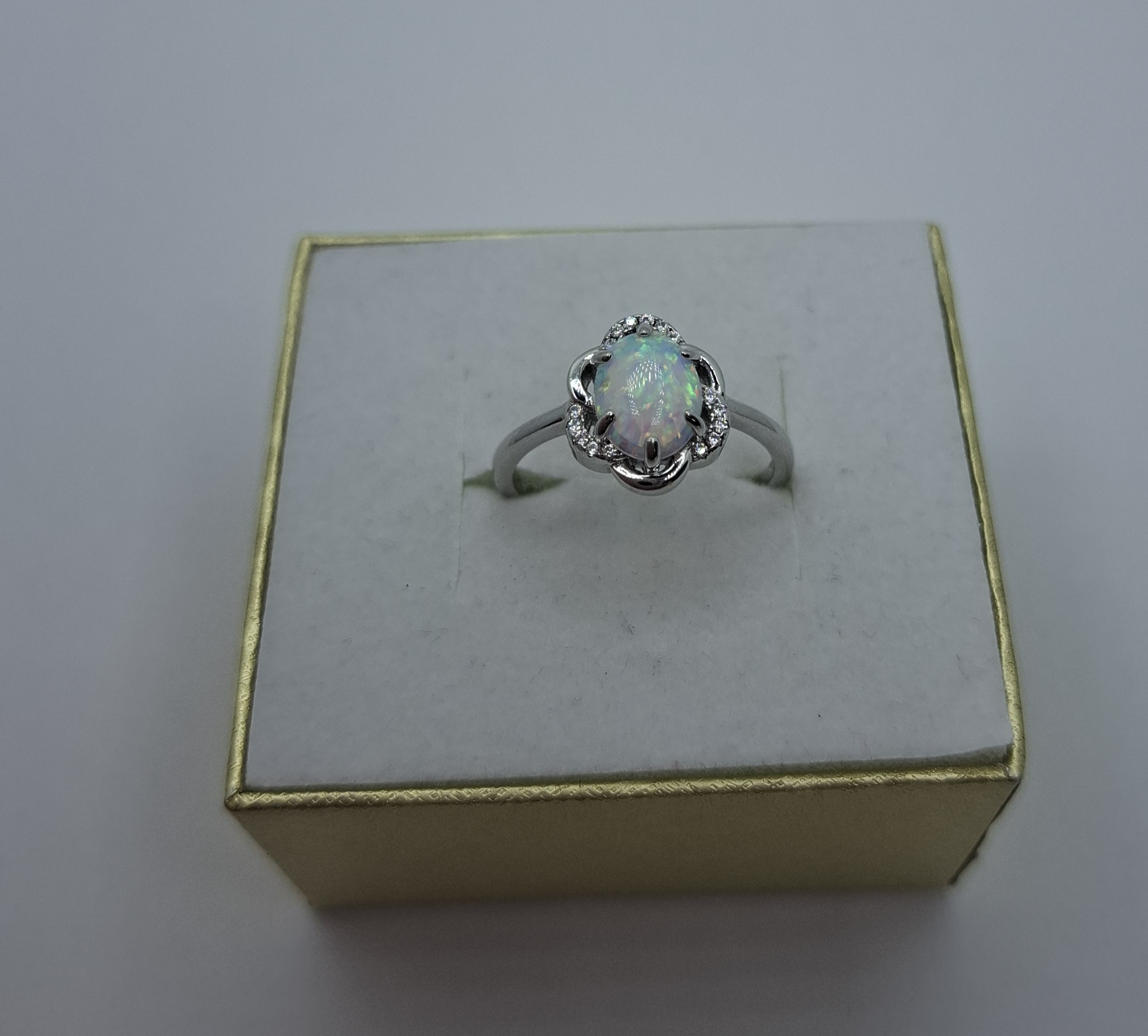 Ezüst női gyűrű, középen :7mmX8,7mm opállal, körbe kis cirkónia kövekkel. Gyűrű mérete:58, a fej szélessége:12,5mm, a sinje:2mm, súlya:3,2gr.