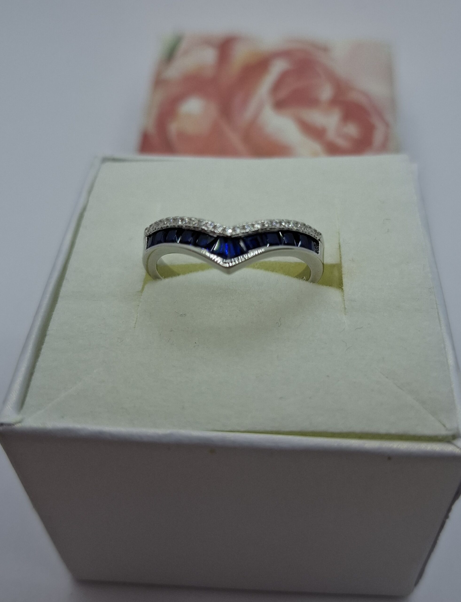 Ezüst viktóriás gyűrű, benne sötétkék, és fehér cirkóniákkal. Gyűrű méret:58, a fej legszélesebb részén:5mm, alul keskenyedik. Mutatós, csillogós, ródiumozott. Súlya:3gr, 925 ezr.ezüst.