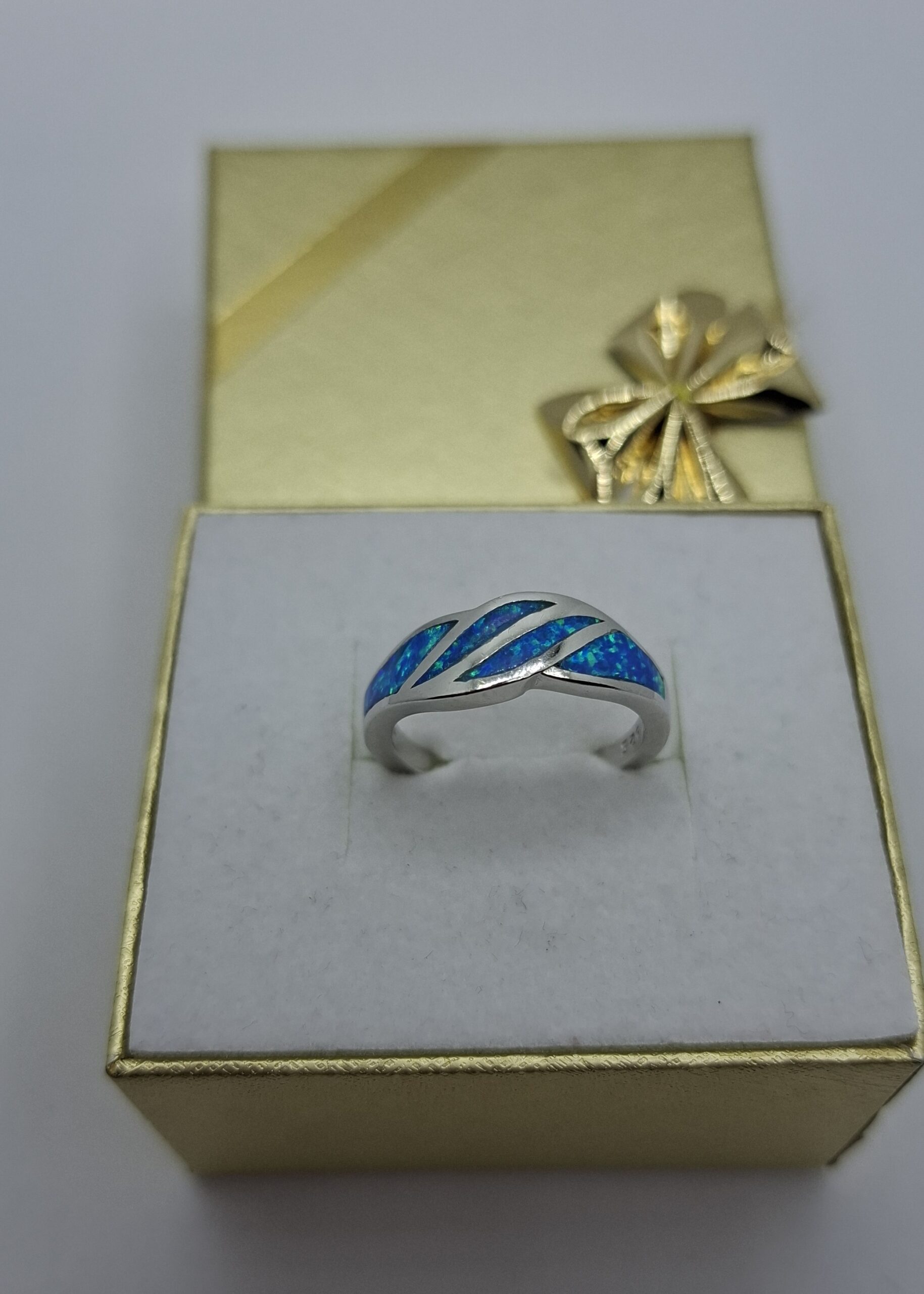Ezüst női gyűrű, modern, kék opál berakással. Mérete:54, súlya:3,6gr, 925 ezr. ezüst. Fej mérete a legszélesebb részen:7mm, alul a sinje2,5mm. Modern, fényes, mutatós.
