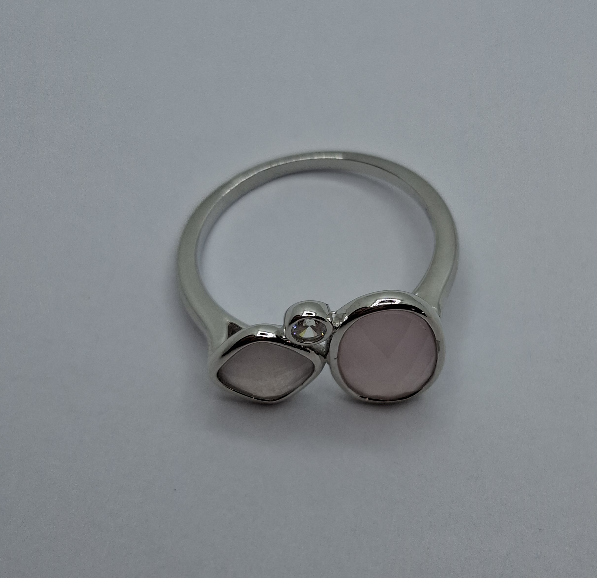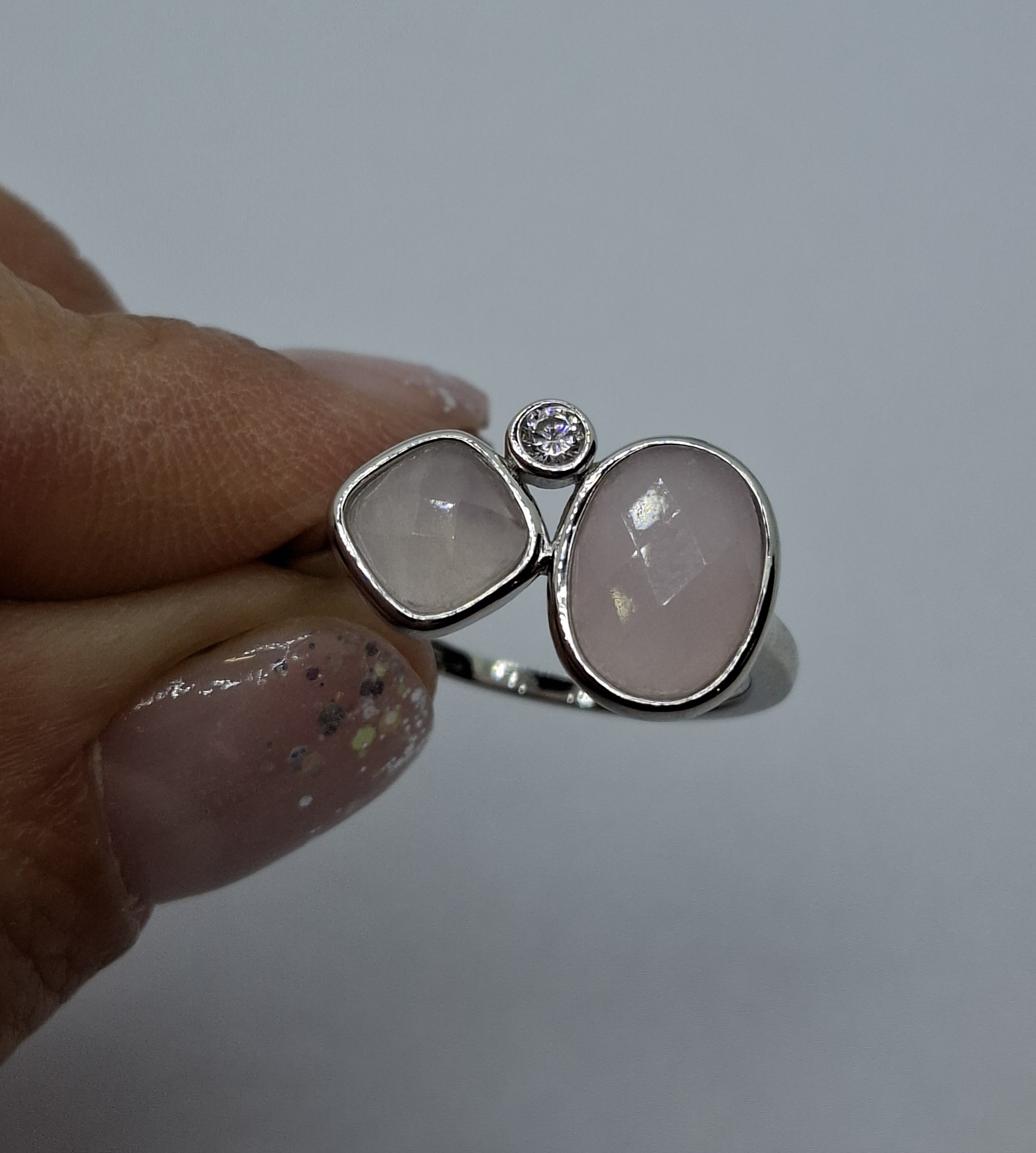 Ezüst női gyűrű, 2 rózsakvarc kövekkel. az egyik rózsakvarc ovál:10X7mm, a másik kockás:6mmX6mm. mellette:2mm cirkónia kővel. Gyűrű mérete:58, súlya:3gr, 925 ezr. ezüst.