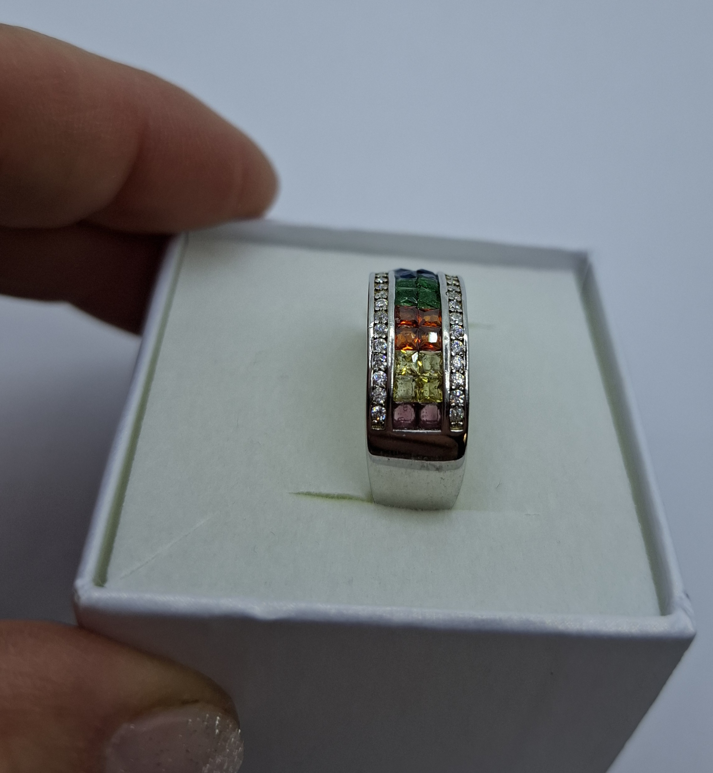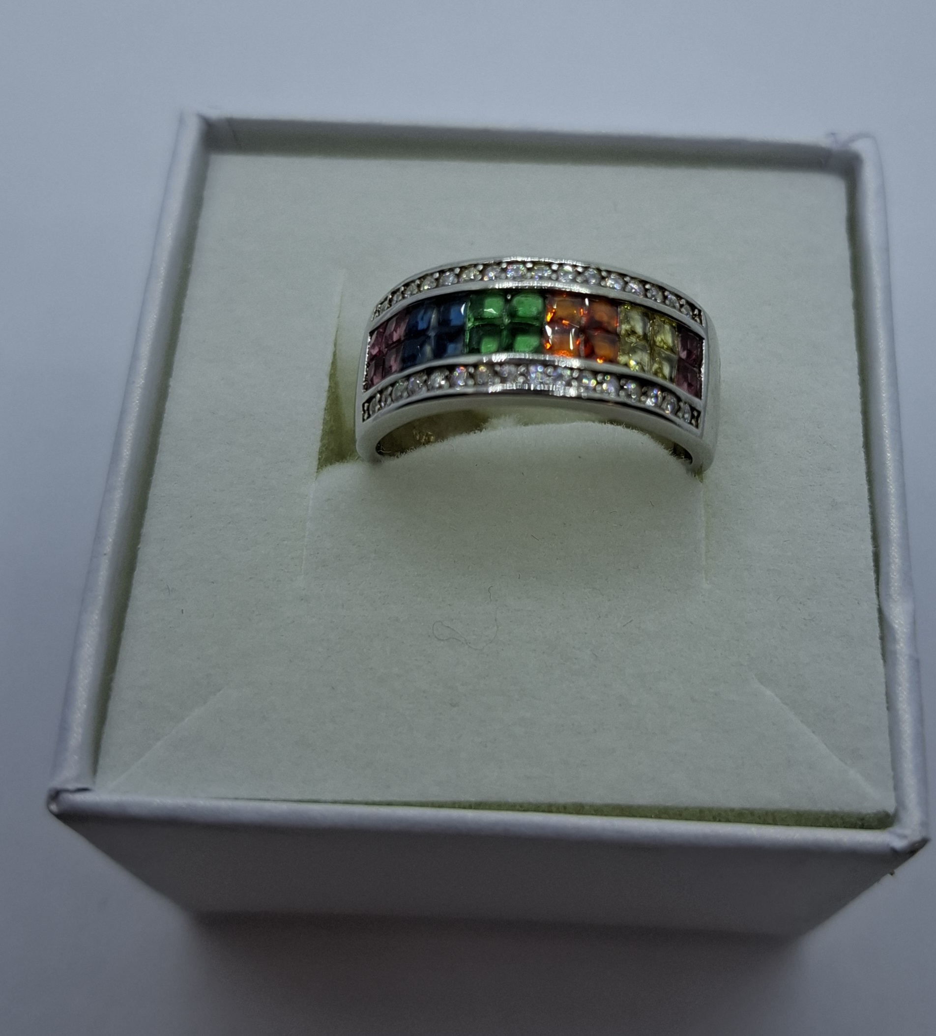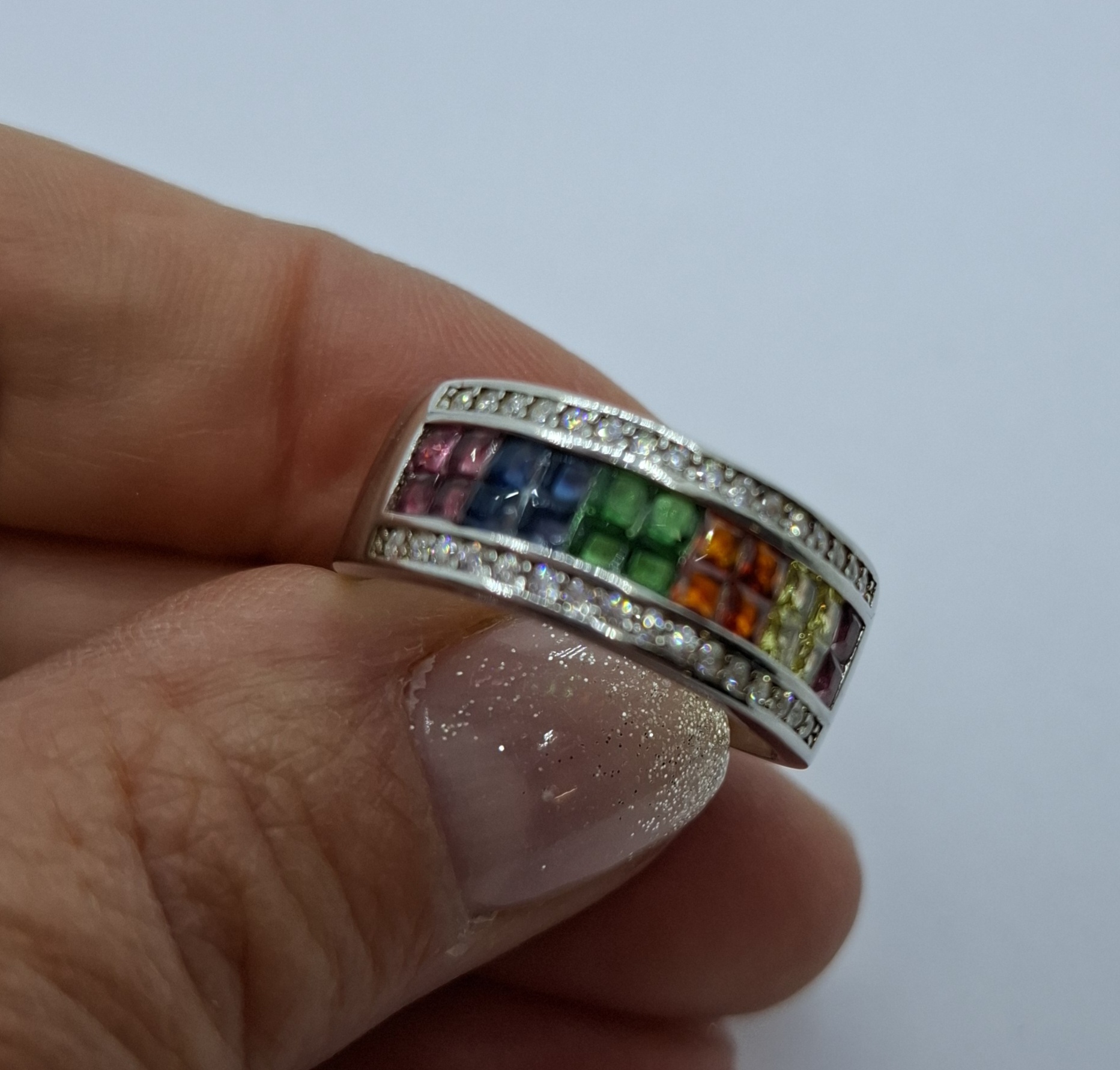1 db ezüst női gyűrű színes cirkónia kövekkel. Szélessége:8,5mm, alul 8mm. Mutatós, erős. Mérete:58, súlya:5,9gr, 925 ezr. magyar fémjelzett.