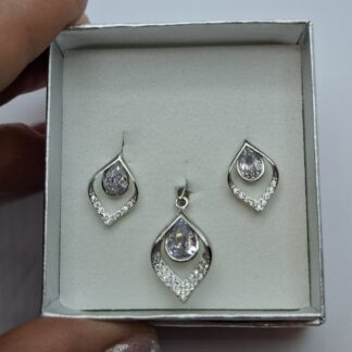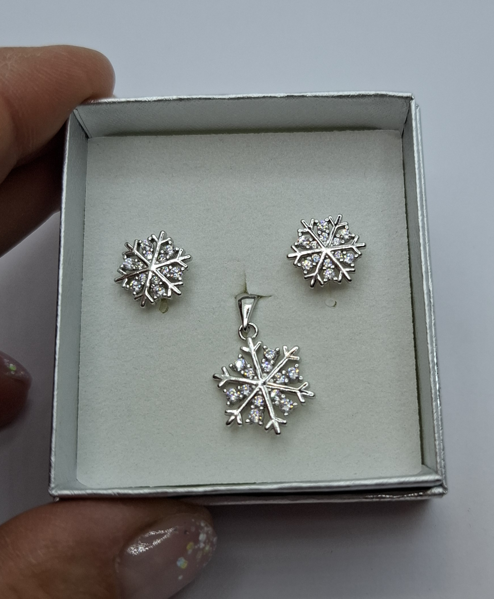1 pár ezüst bedugós hópehely fülbevaló, hozzá tartozó medállal, benne csillogó befoglalt cirkónia kövekkel. A fülbevaló:1cm, a medál:1,2cm+karika. Lapos, mutatós!Szett súlya:3,1gr, 925 ezr.ezüst.