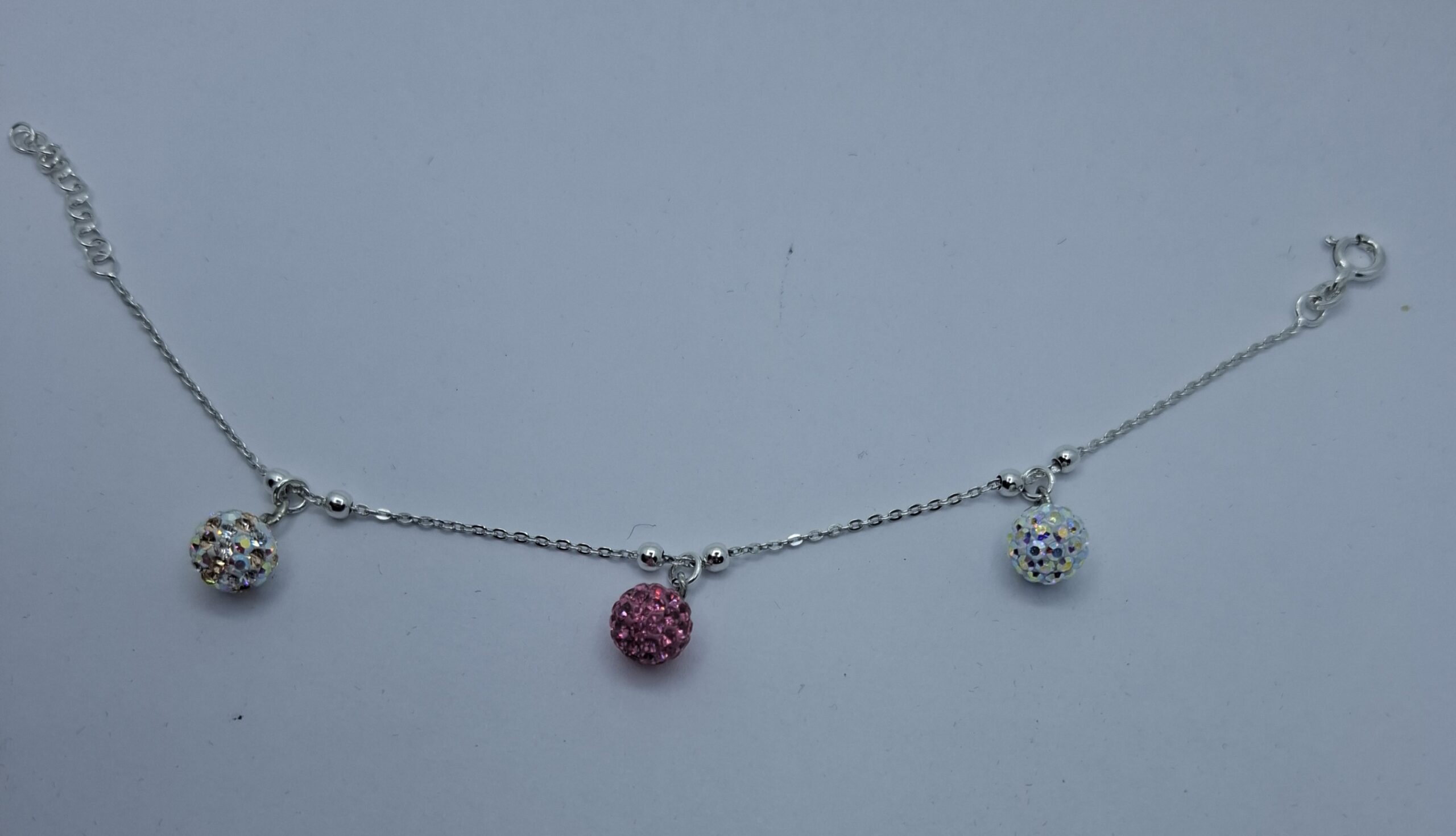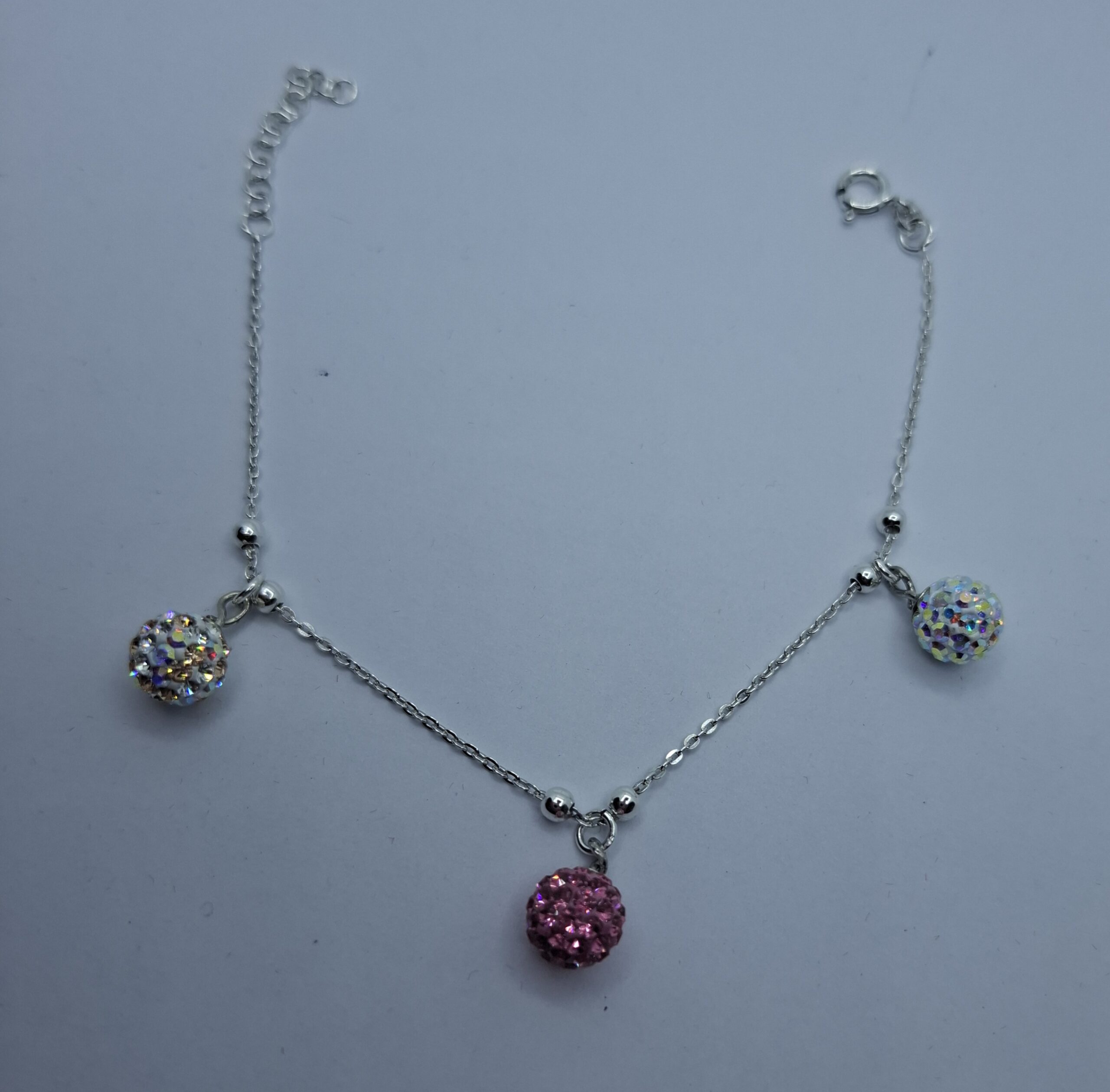 Ezüst karkötő, Swarovski gömb medálokkal. Hossza: 17cm-20cm ig alakitható. súlya: 3,4gr. A medálok 8,2mm, fehér, rózsaszín, és fehér krém kristályokkal,