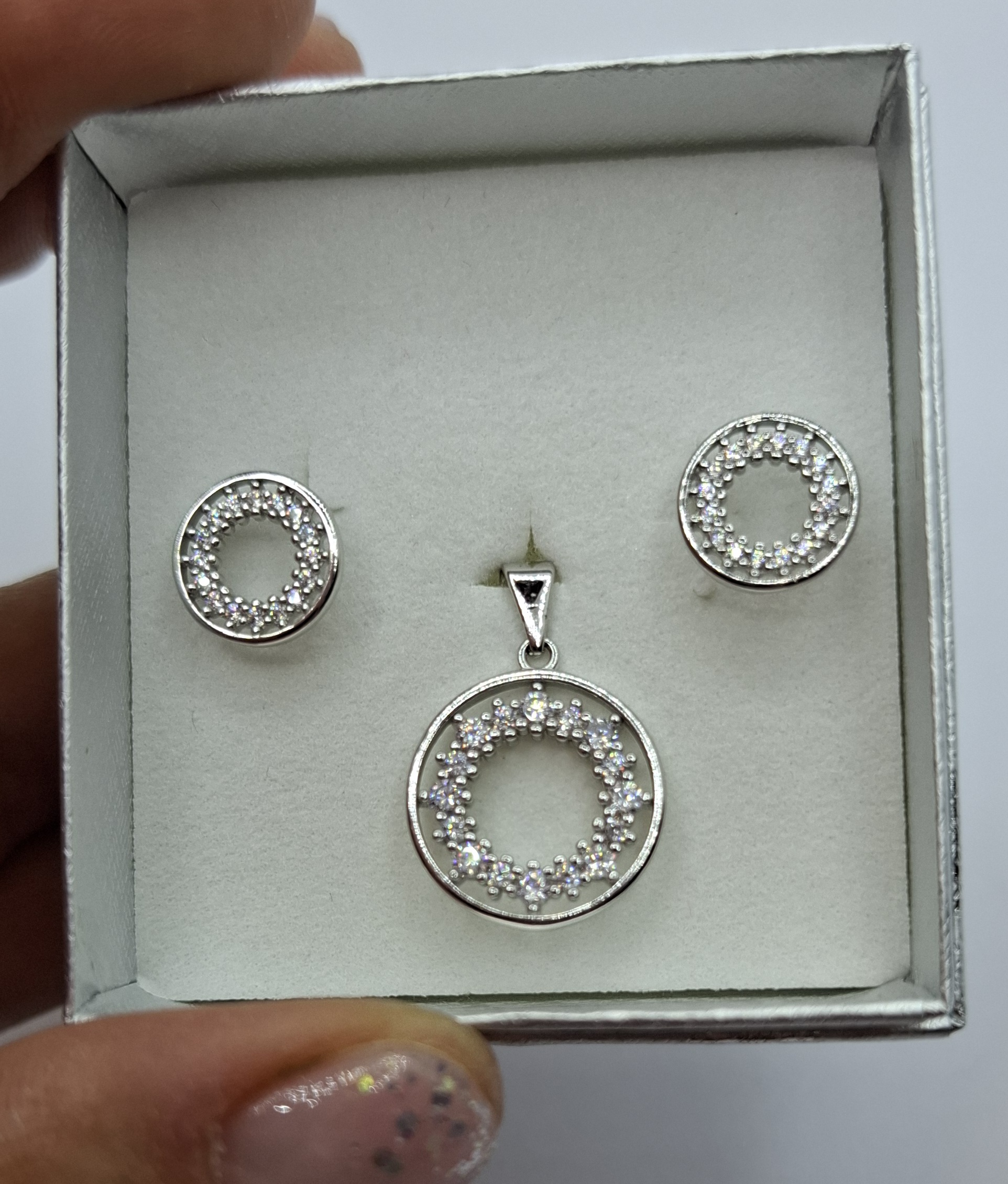 1 pár ezüst bedugós fülbevaló, karika, középen lyukas, benne cirkónia kövekkel, hozzá tartozó medállal. A fülbevaló átmérője:1cm, a medál:1,5cm+karika. Szett súlya:2,6gr, 925 ezr.ezüst. Mutatós, kedvelt.
