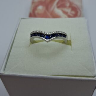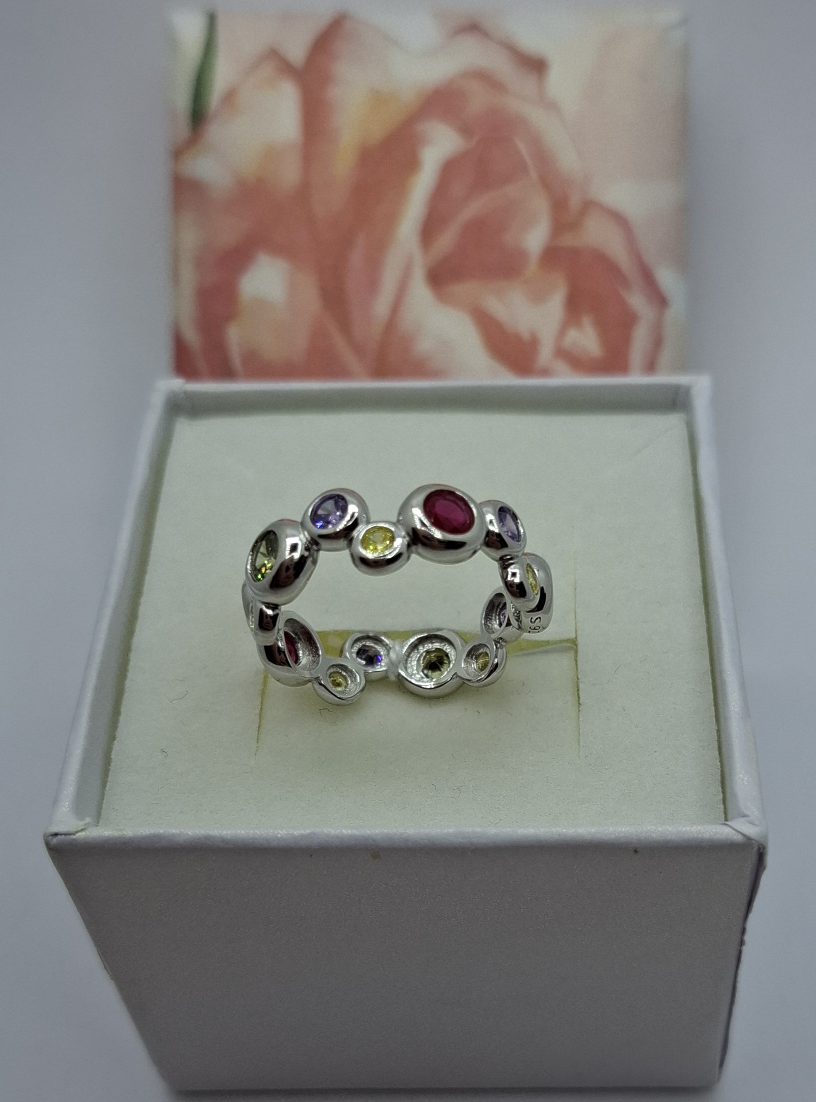 Ezüst modern gyűrű, piros, sárga, lila, zöld , fehér cirkóniákkal váltakozva. Gyűrű mérete:54, szélessége:6-7mm, súlya:3,9gr, 925 ezr.ezüst. Körbe köves.