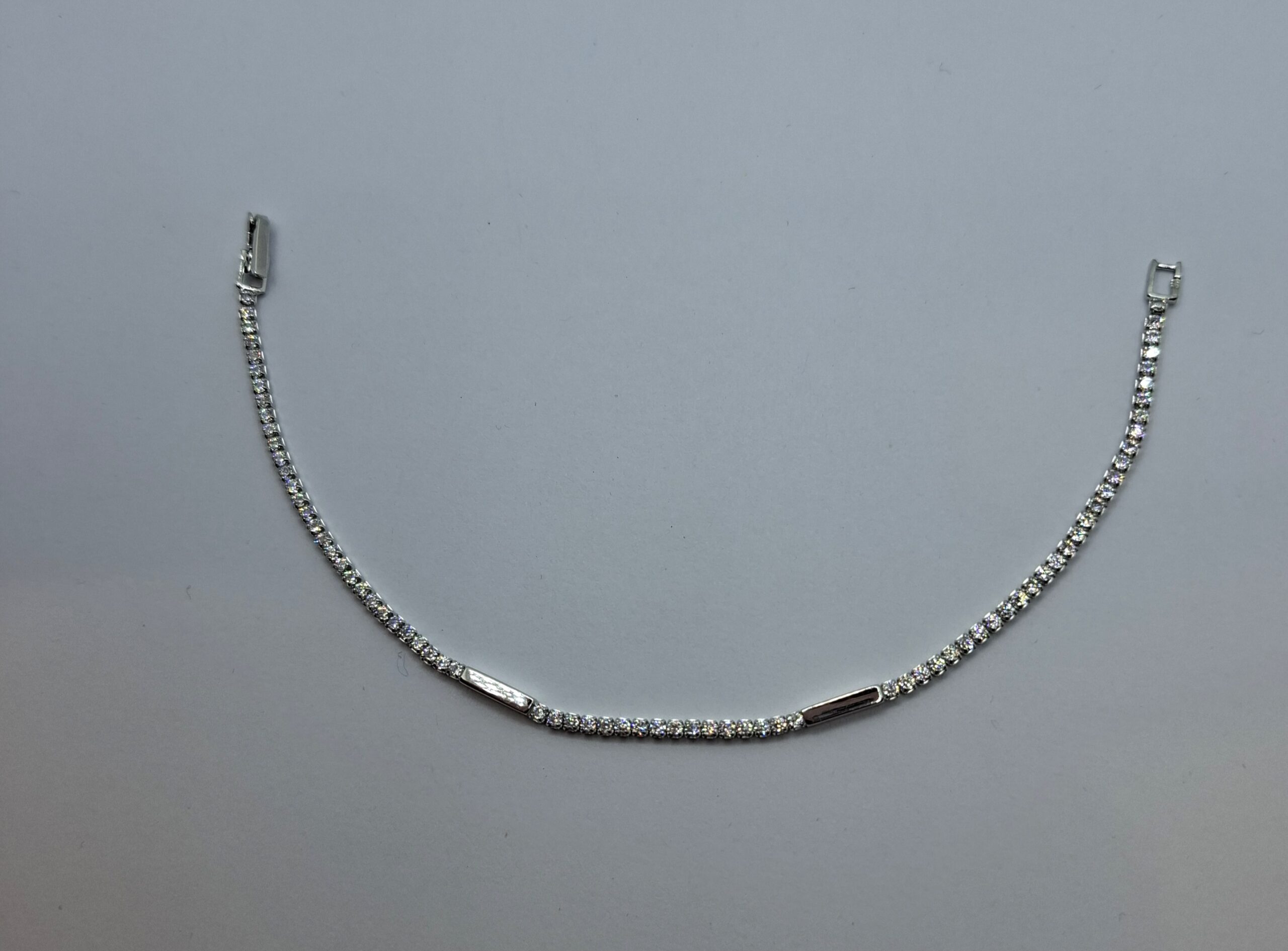 Ezüst női karlánc, csillogó cirknia kövekkel. Hossza:18cm, szélessége:2,2mm, benne 2 kis ezüst lap. Súlya:4gr, 925 ezr.ezüst.