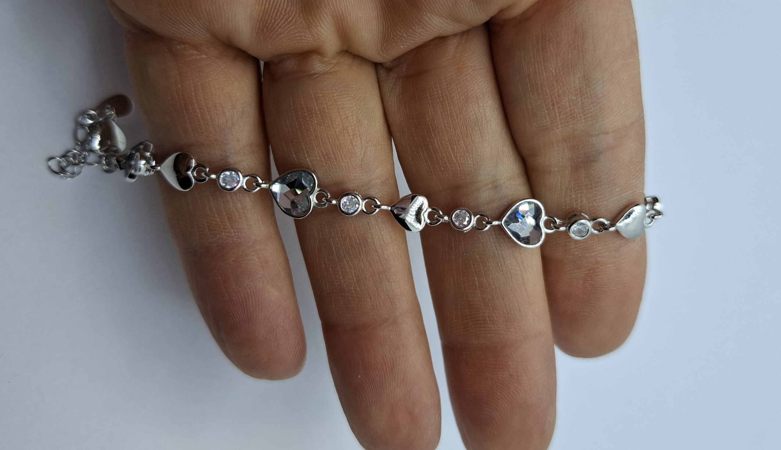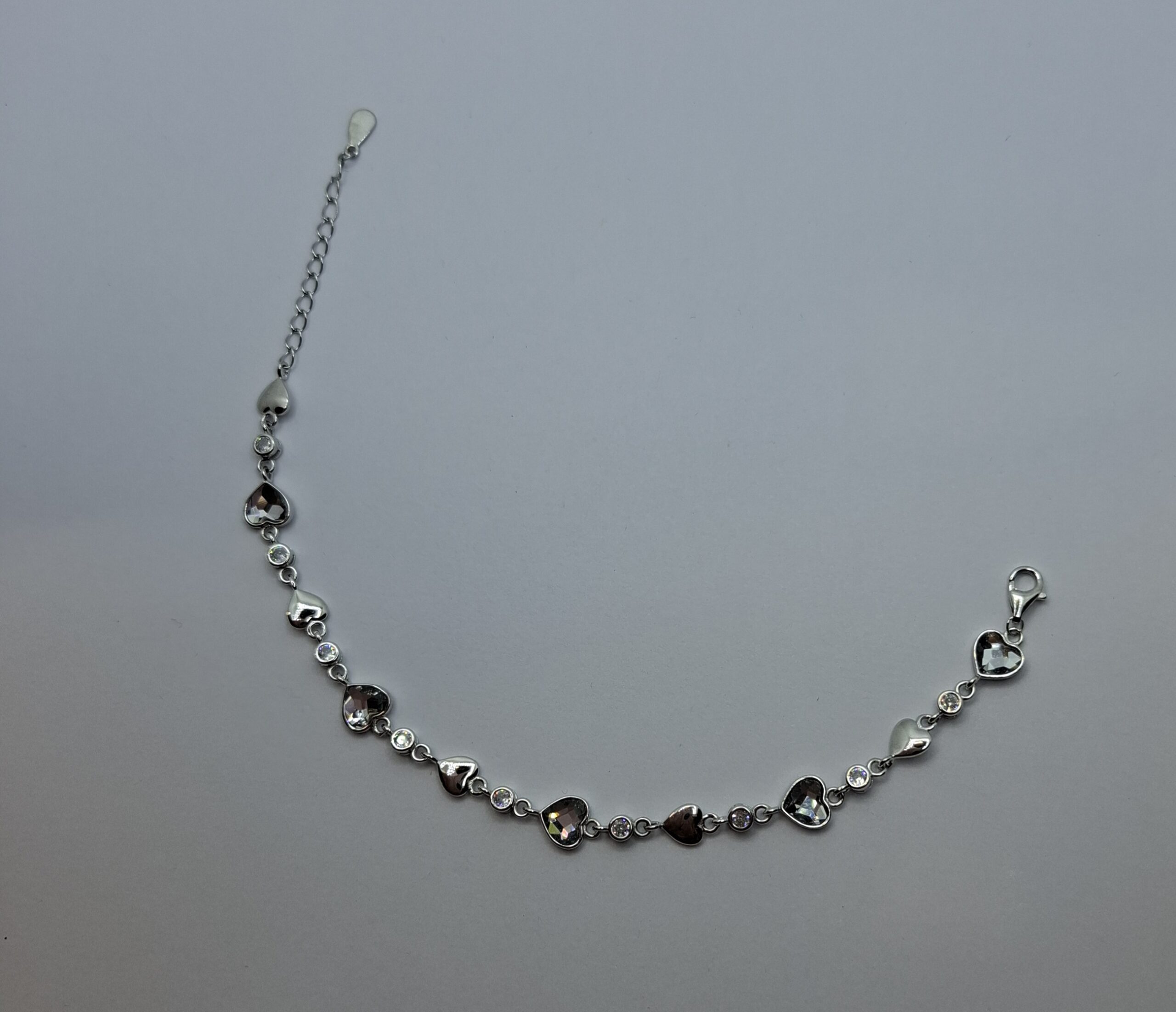 Ezüst női karlánc, 1 nagyobb köves szívvel, kissebb teli szívvel váltakozva, közbe kis cirkónia kövek. Hossza:16-19cmig állítható, szélessége a legszélesebb nagy szívnél:7mm. Mutatós, modern. Súlya:5,04gr, 925 ezr.ezüst.