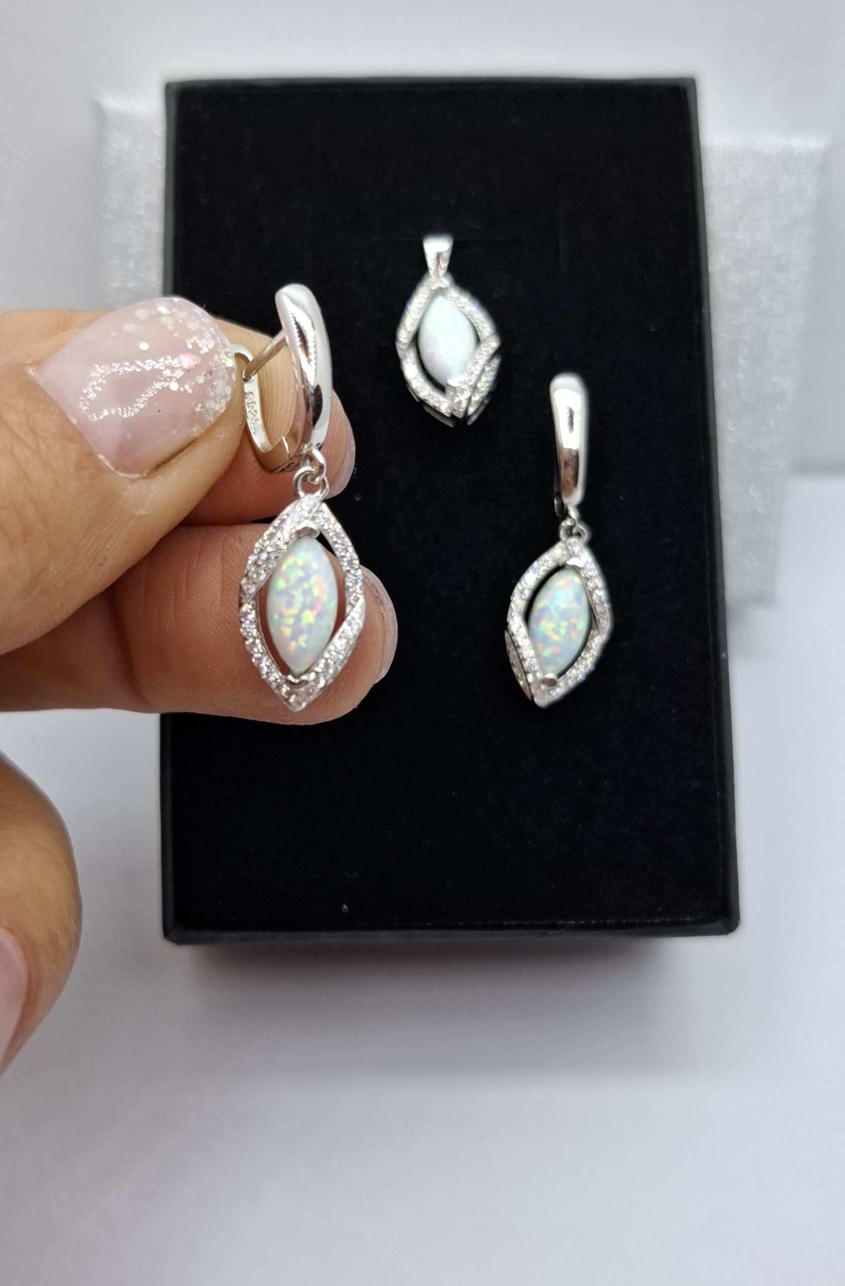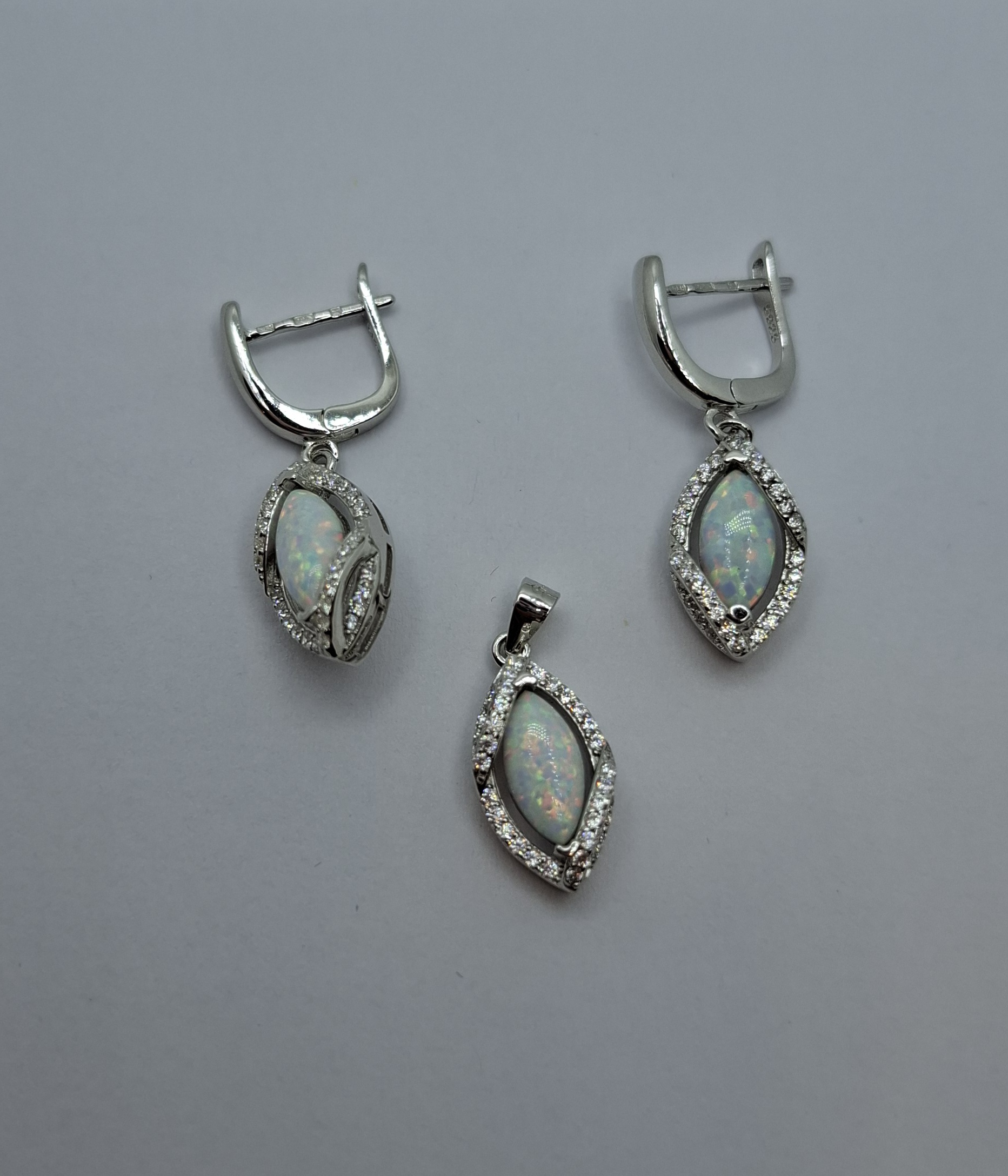 Ezüst szett, lógós fülbevaló+medál, opállal, cirkóniával. A fülbevaló francia kapcsos, hossza:3cm, szélessége:9mm. Az opál 5mmX10mm. körbe kis cirkónia kövekkel. A medál 2cm, teljesen egyforma a fülbevaló alsóval. Nagyon mutatós. Az opál tejes, kis kék , piros színekkel.Szett súlya:6gr, 925 ezr.ezüst. Mutatós!