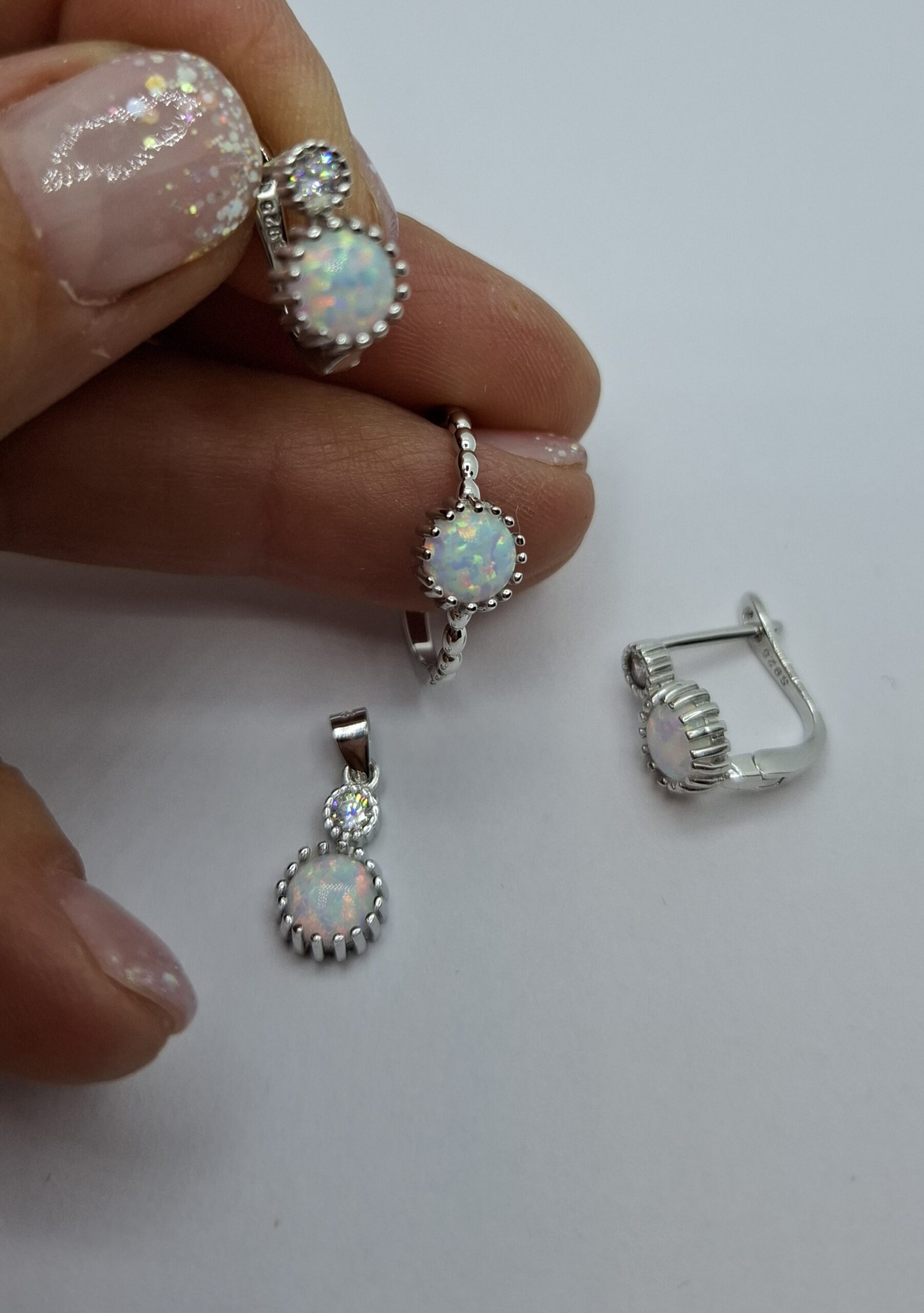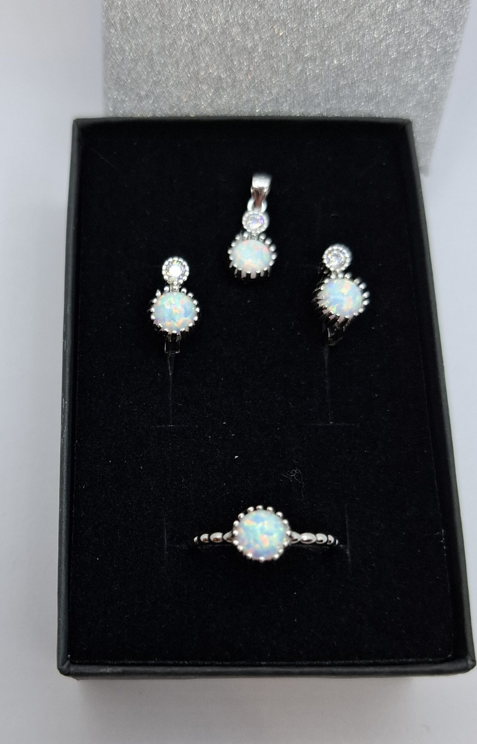 Ezüst szett. Tartalmat 1 db ezüst gyűrű halvány opállal(6mm), mérete:52-es, szolíd, mutatós. Hozz tartozó francia kapcsos fülbevalóval, 6mm opállal, fölötte 3mm cirkónia.Fülbevaló teljes hossza:1,4cm. Hozzá tartozó teljesen ugyan akkora medállal. Teljes szett súlya:5gr, 925 ezr.ezüst. Nagyon mutatós.