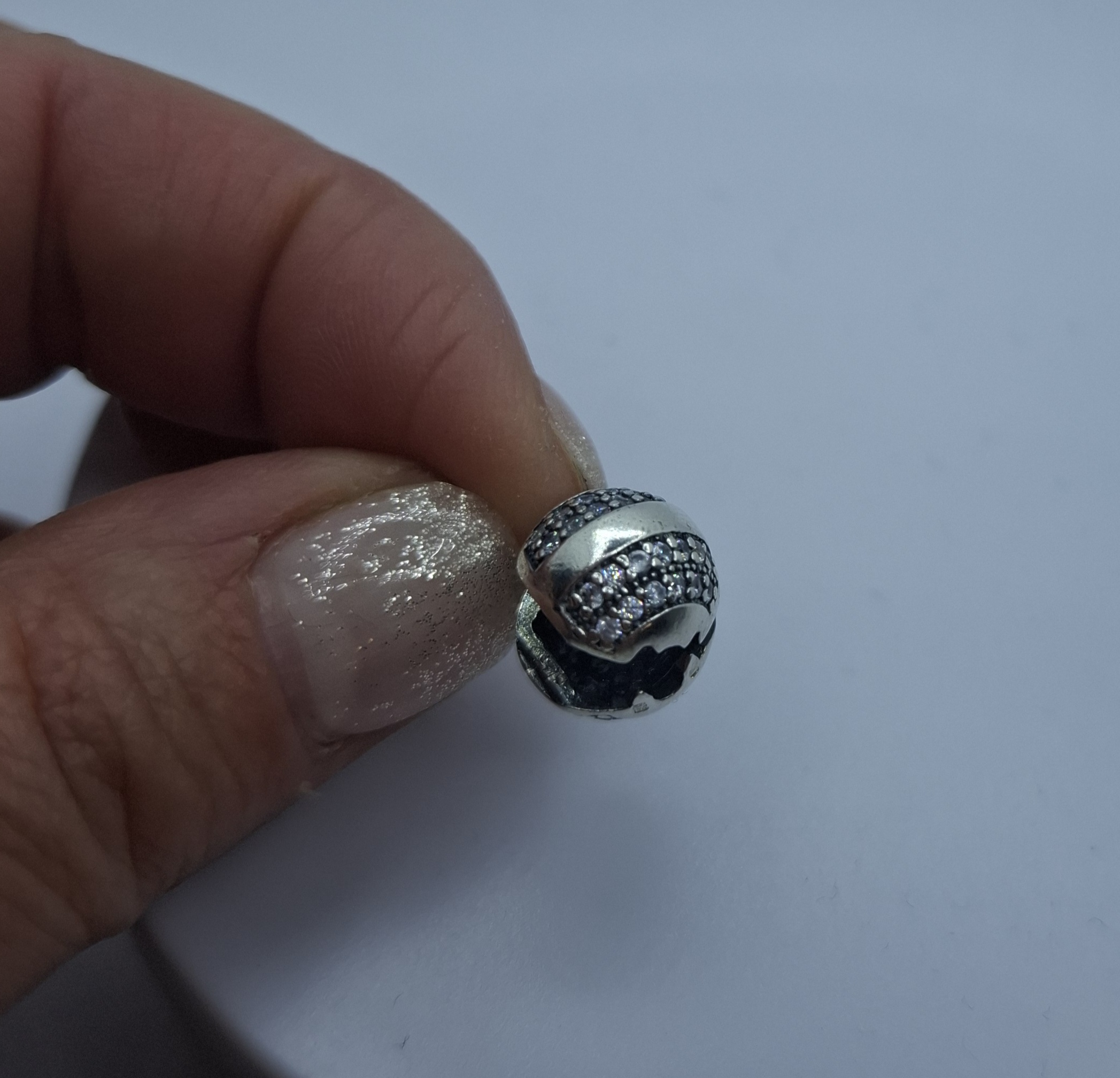 Ezüst kapocs pandora karláncra. Kerek cirkónia kövekkel. 3,6gr, 925 ezr. ezüst. Mérete:11mm.