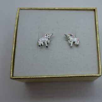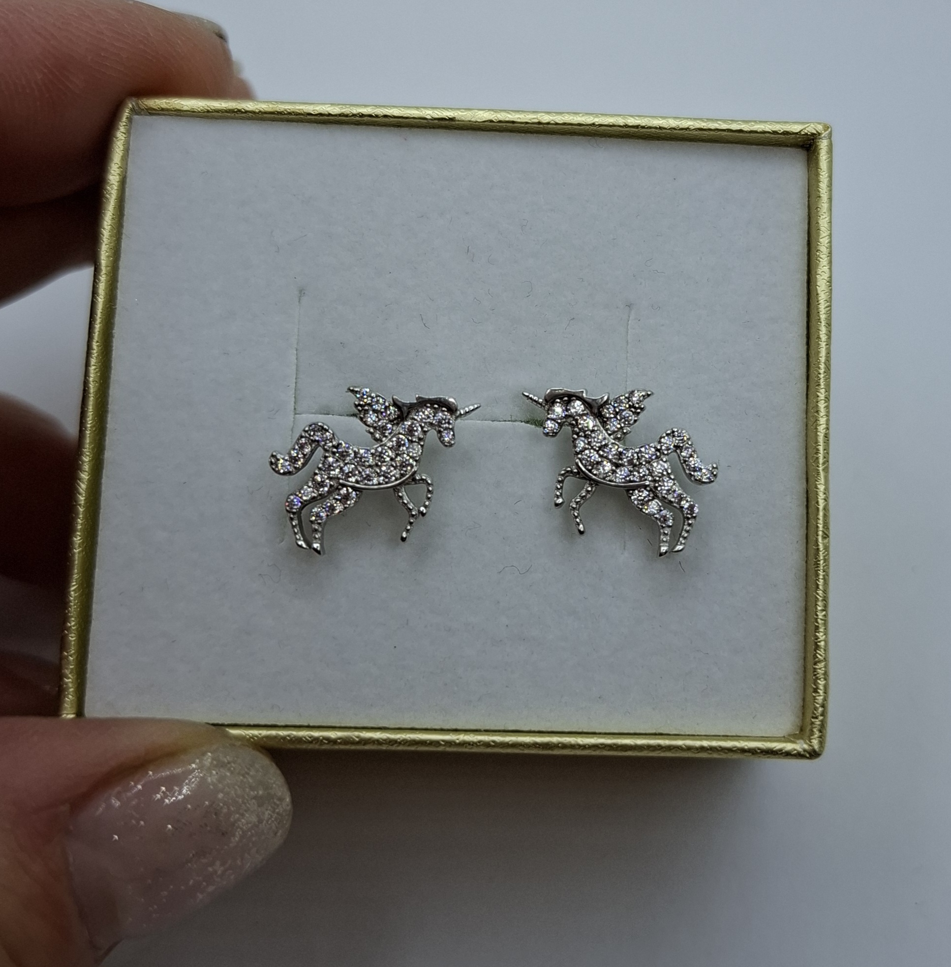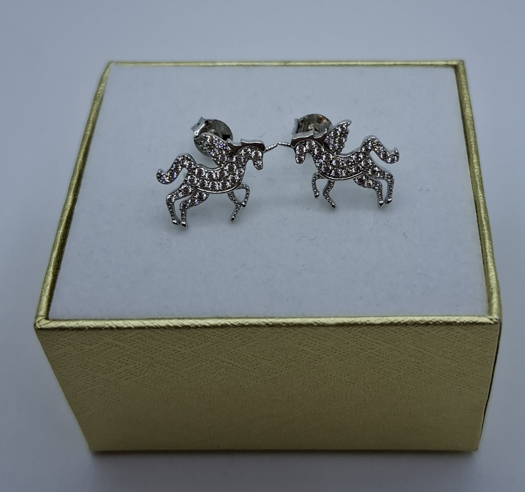 1 pár ezüst bedugós egyszarú ló fülbevaló, csillogó kövekkel. Mérete:1,5cmX1,1cm. Súlya:1,8gr, 925 ezr.ezüst.