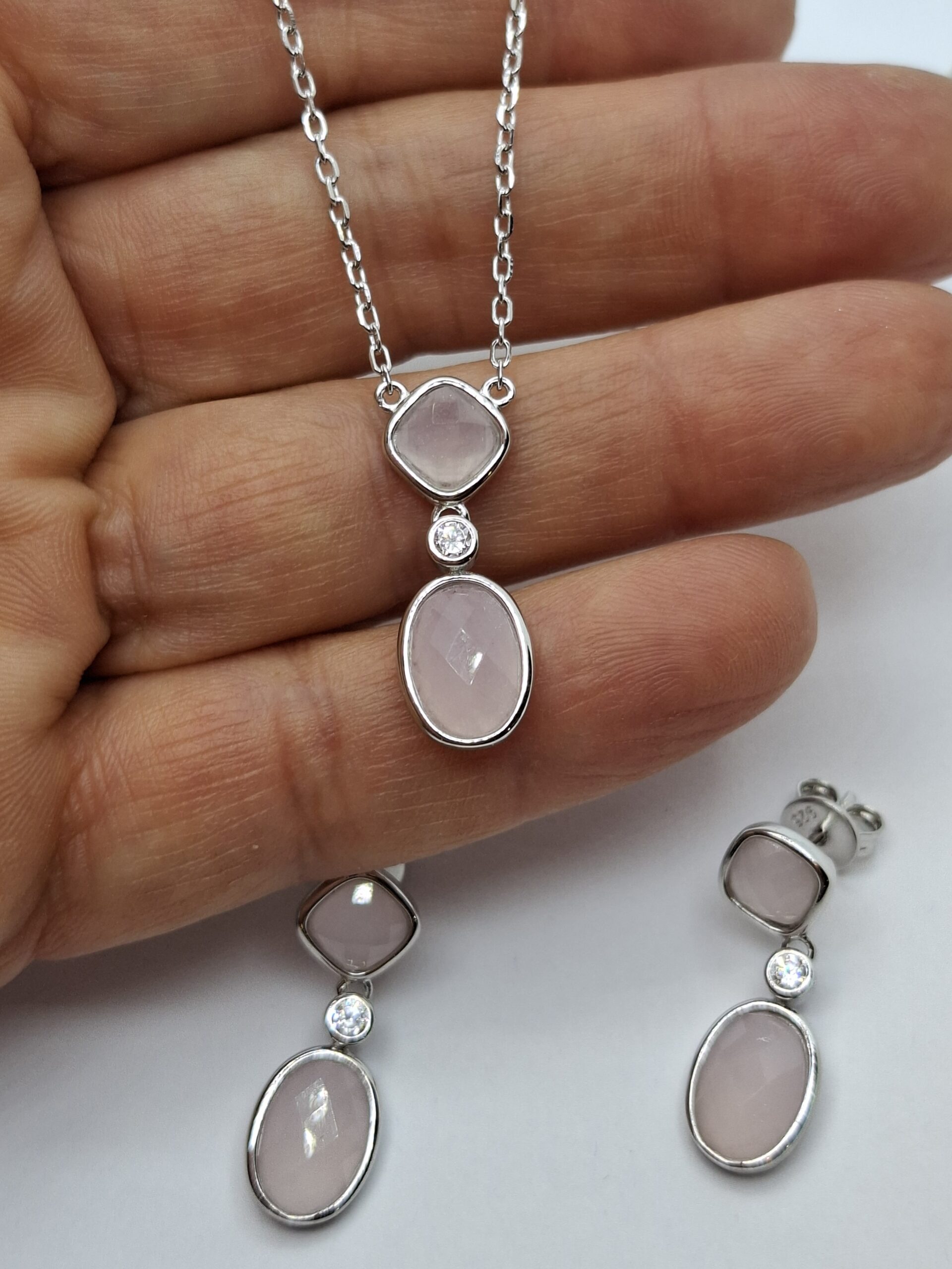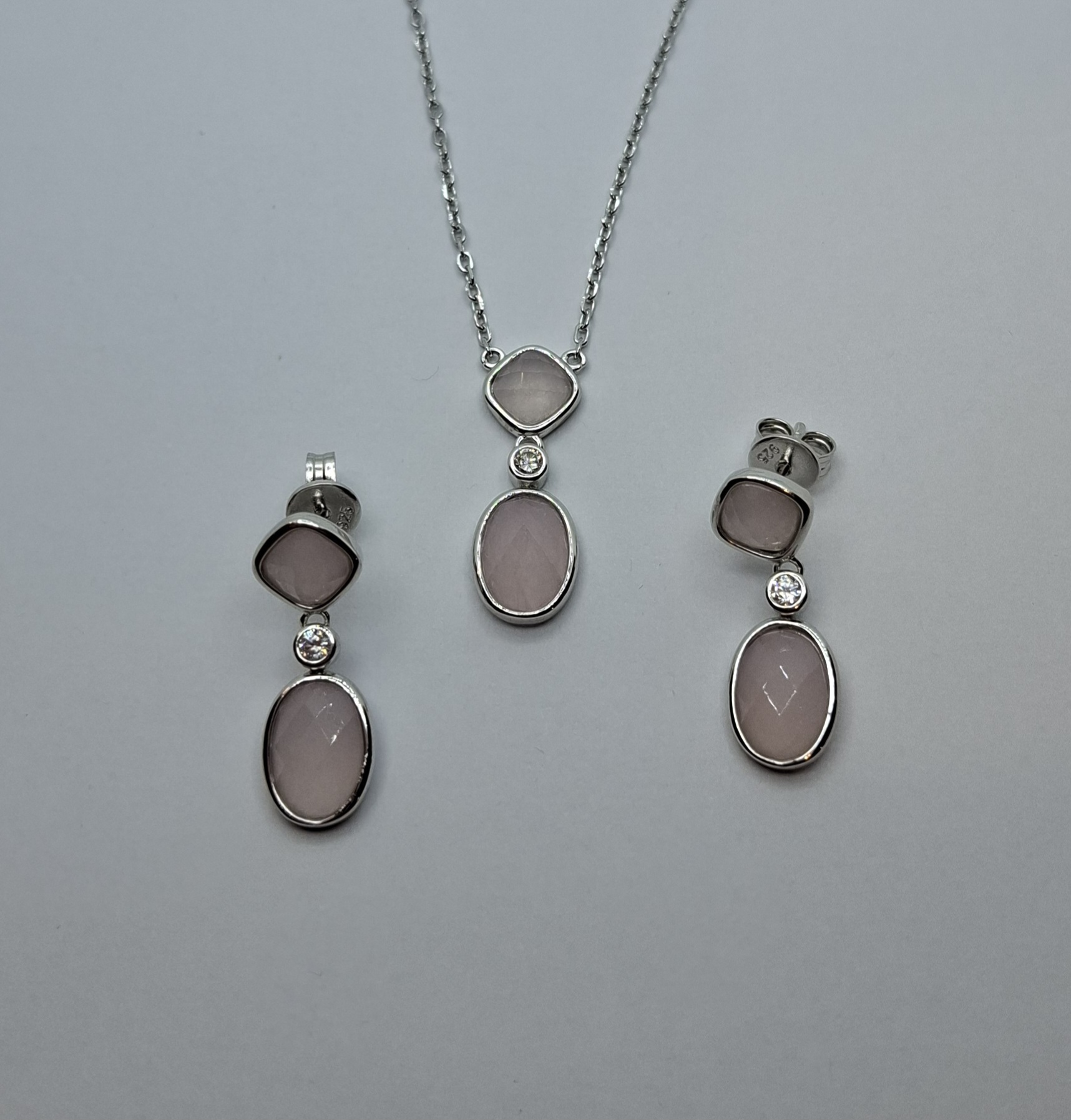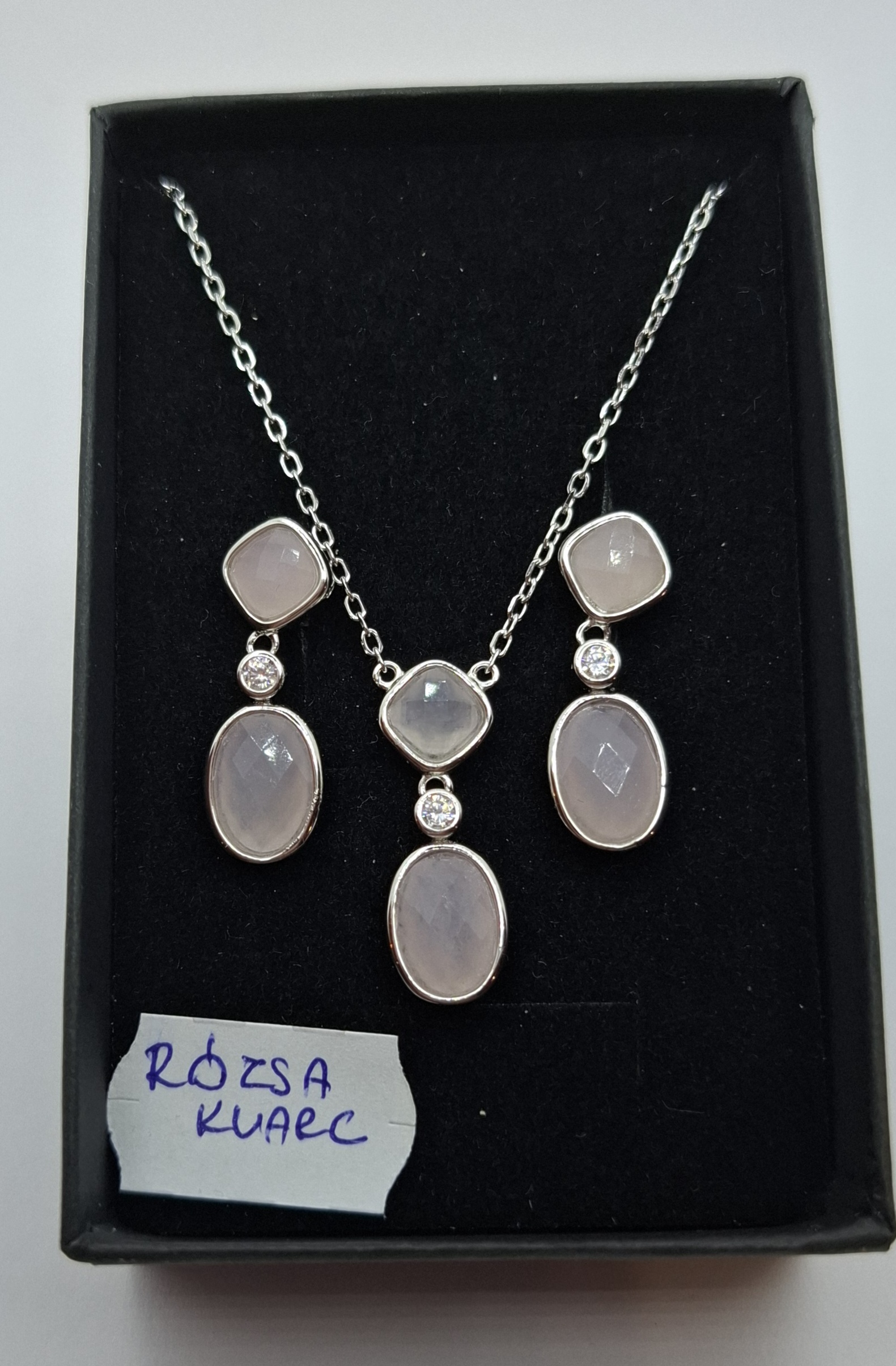 Ezüst rózsaszín rózsakvarc fülbevaló medál nyaklánc szett. 5595