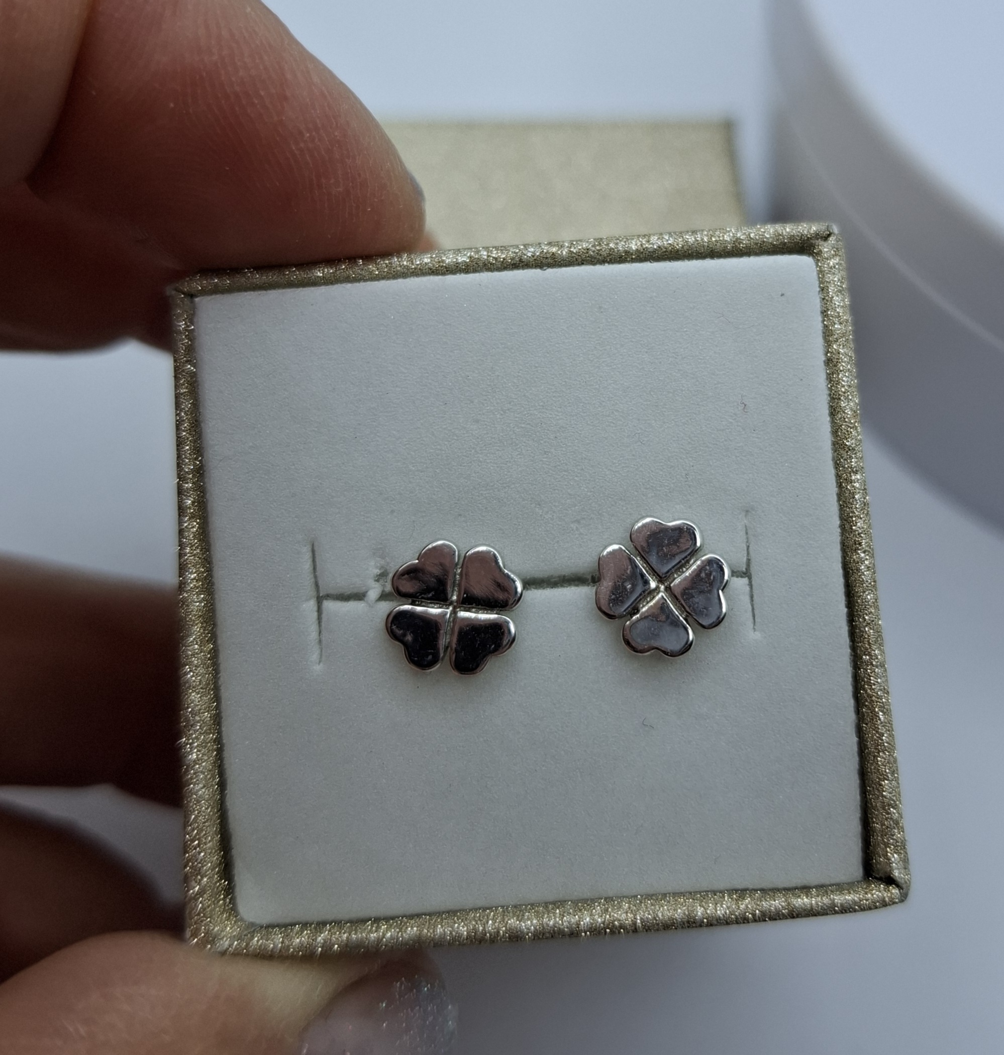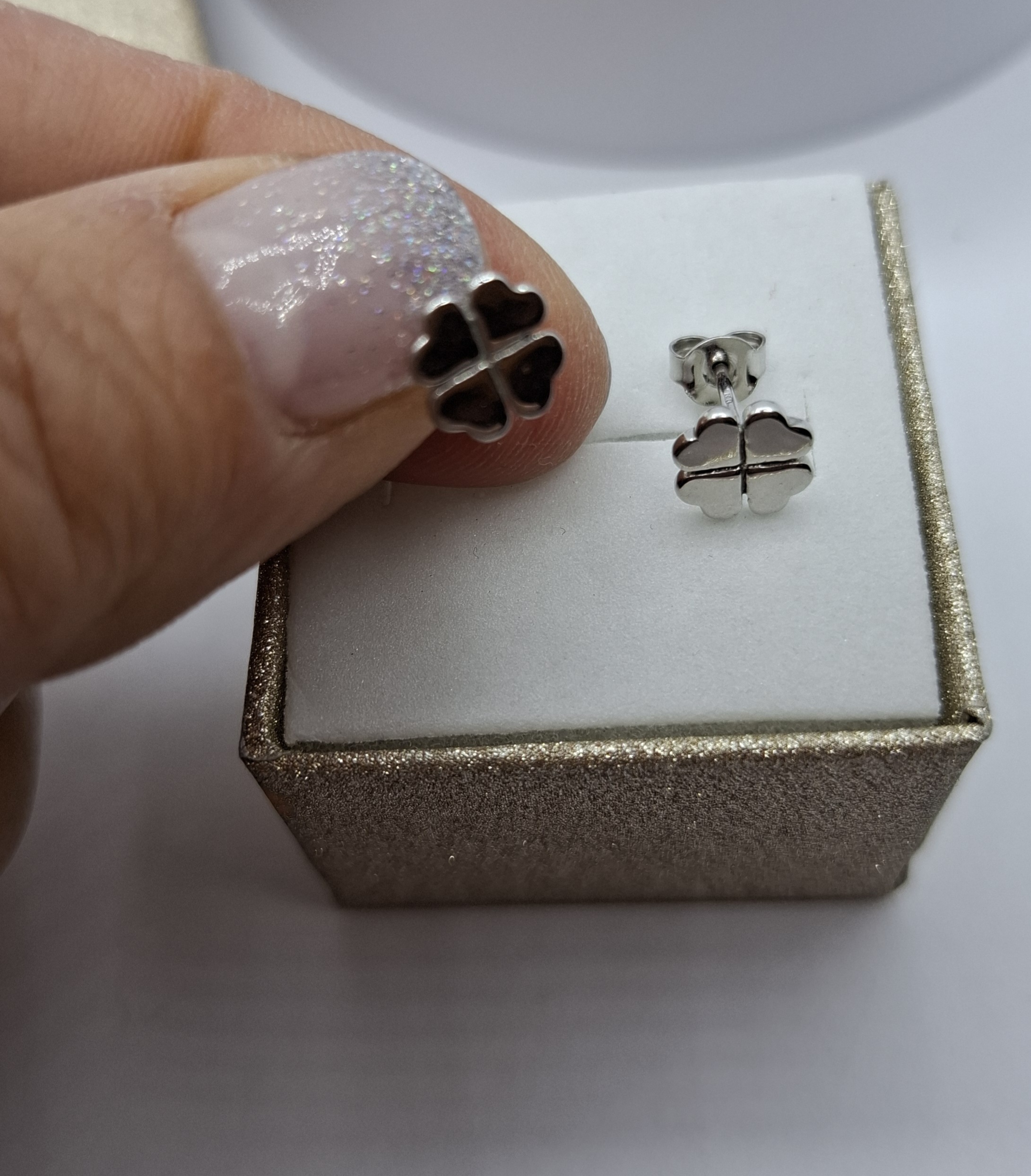 1 pár fehér arany fülbevaló, 4levelű szerencsehozó. 1,5gr, 14kt. Lapos, fényes, mérete:7,5mm