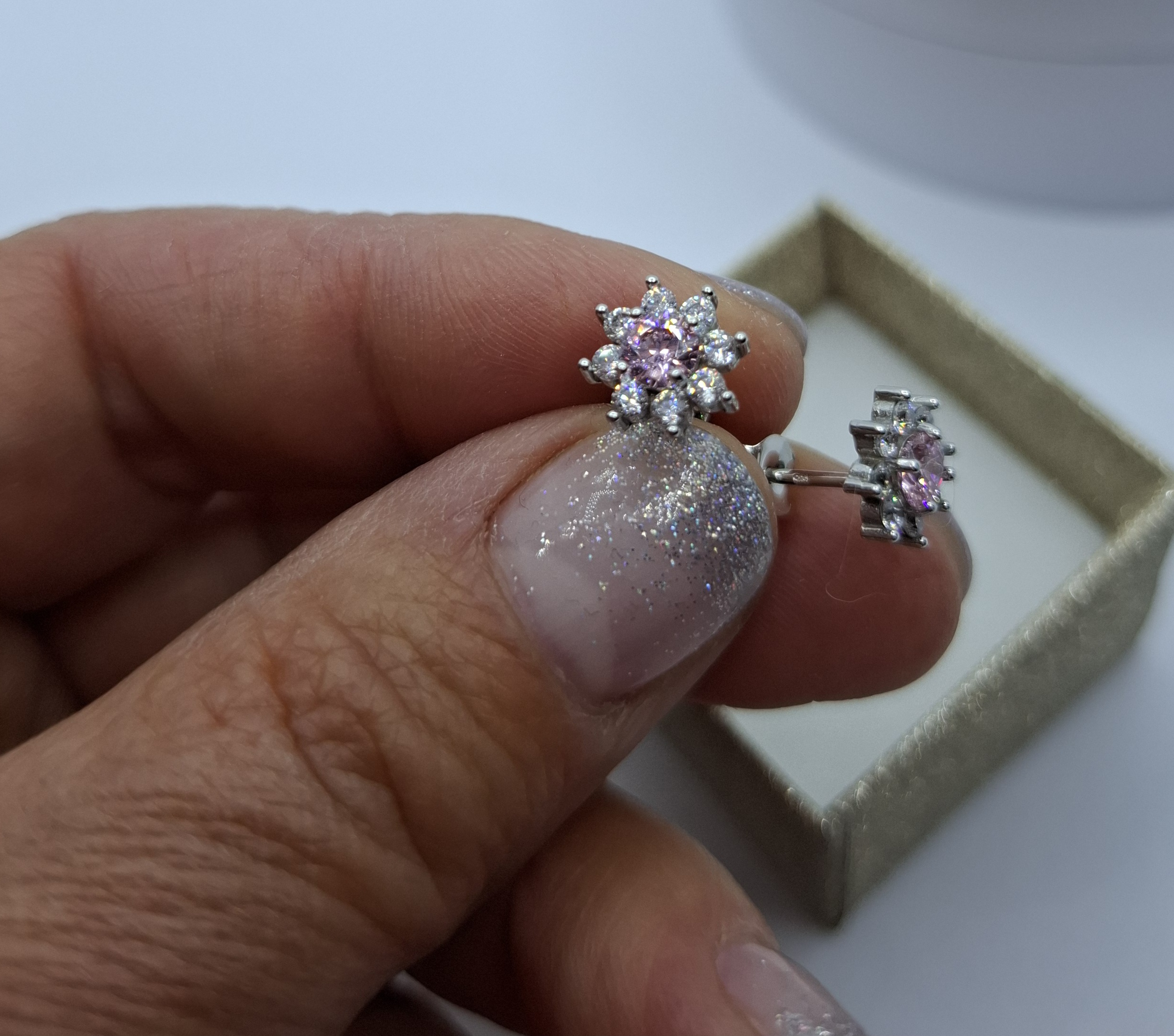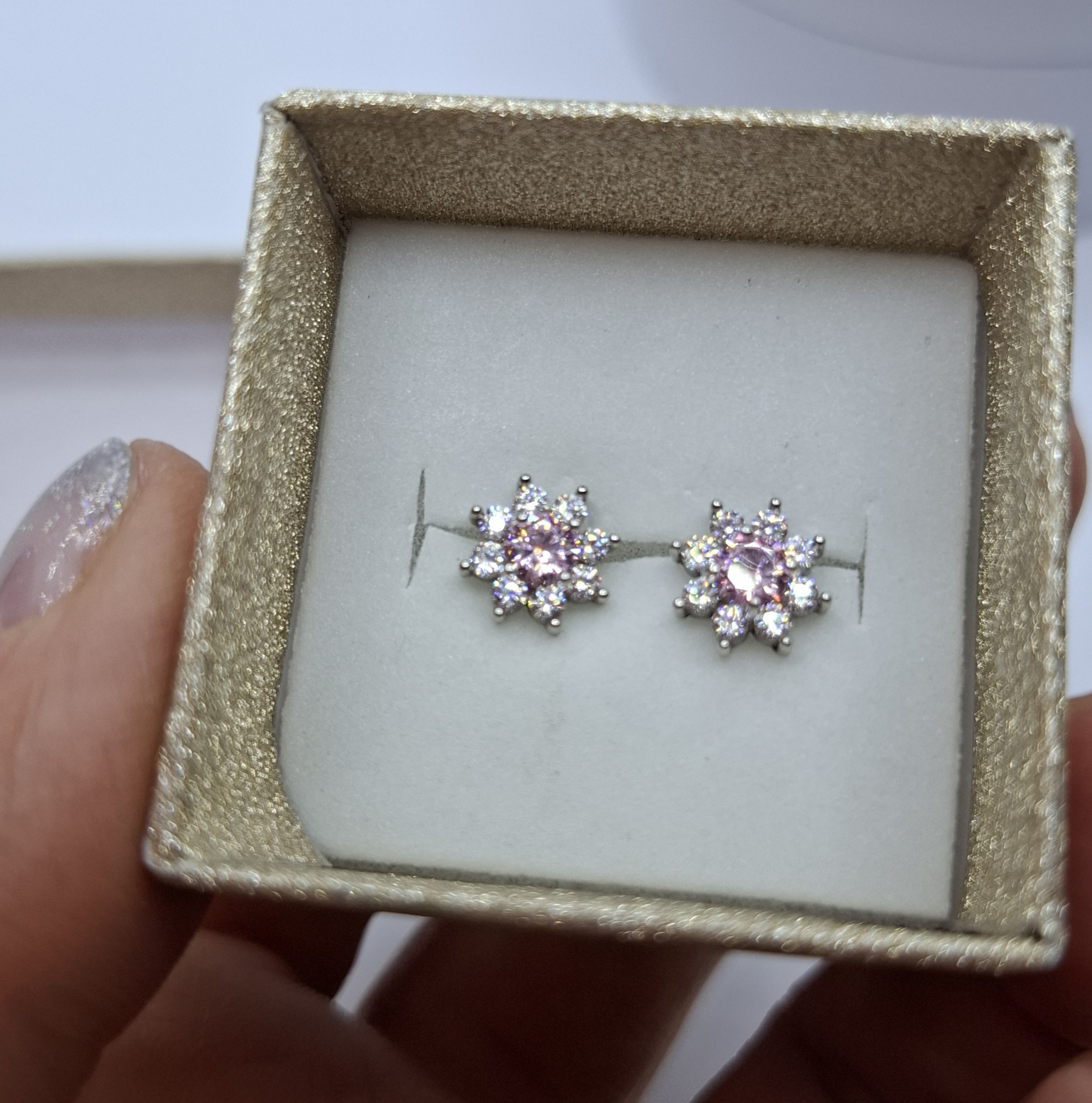 1 pár fehér arany bedugós virág, középen rózsaszín, körbe fehér cirkónia kövekkel. Fej mérete:8,1mm, súlya:1,9gr, 14kt. Mutatós!