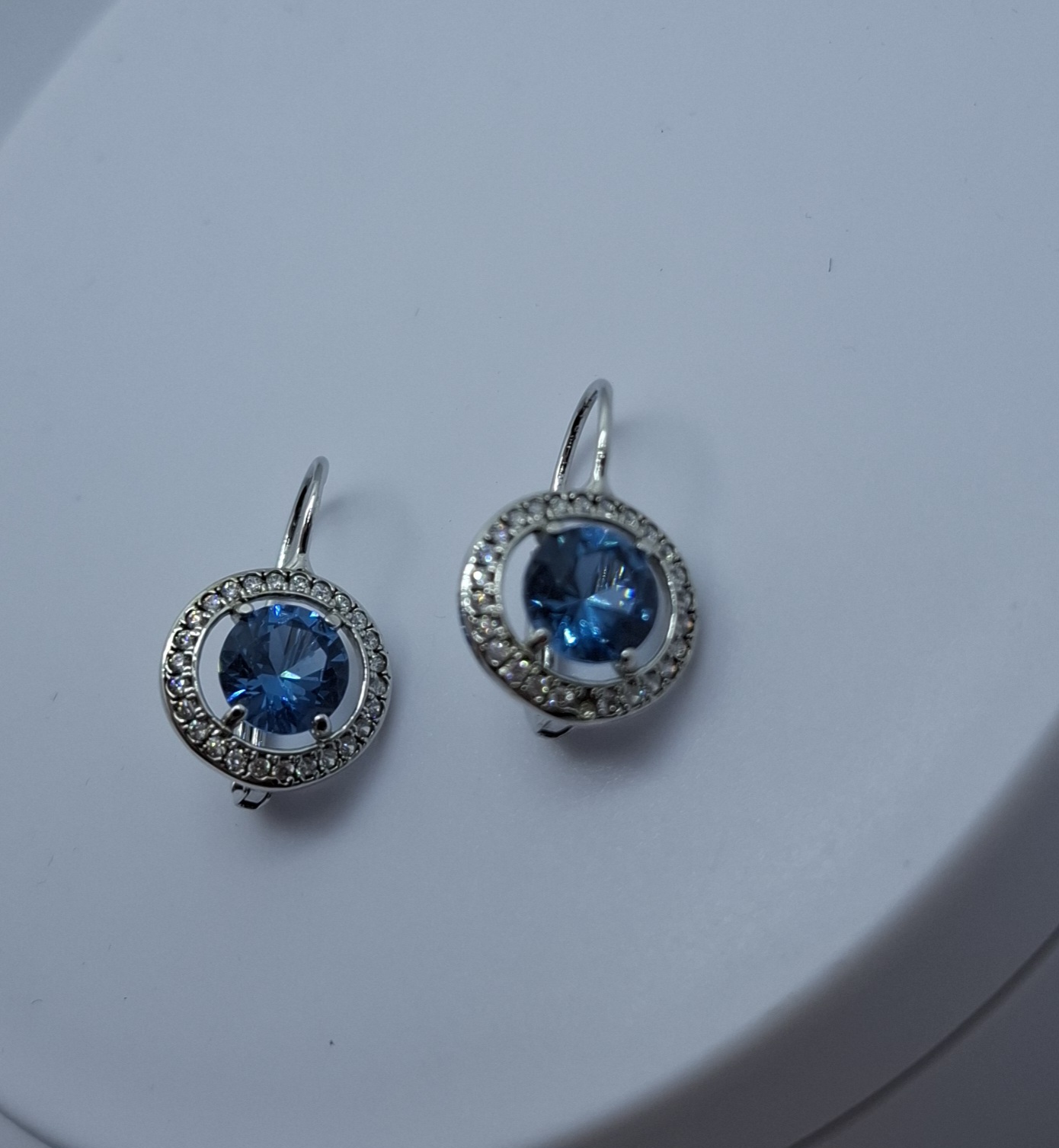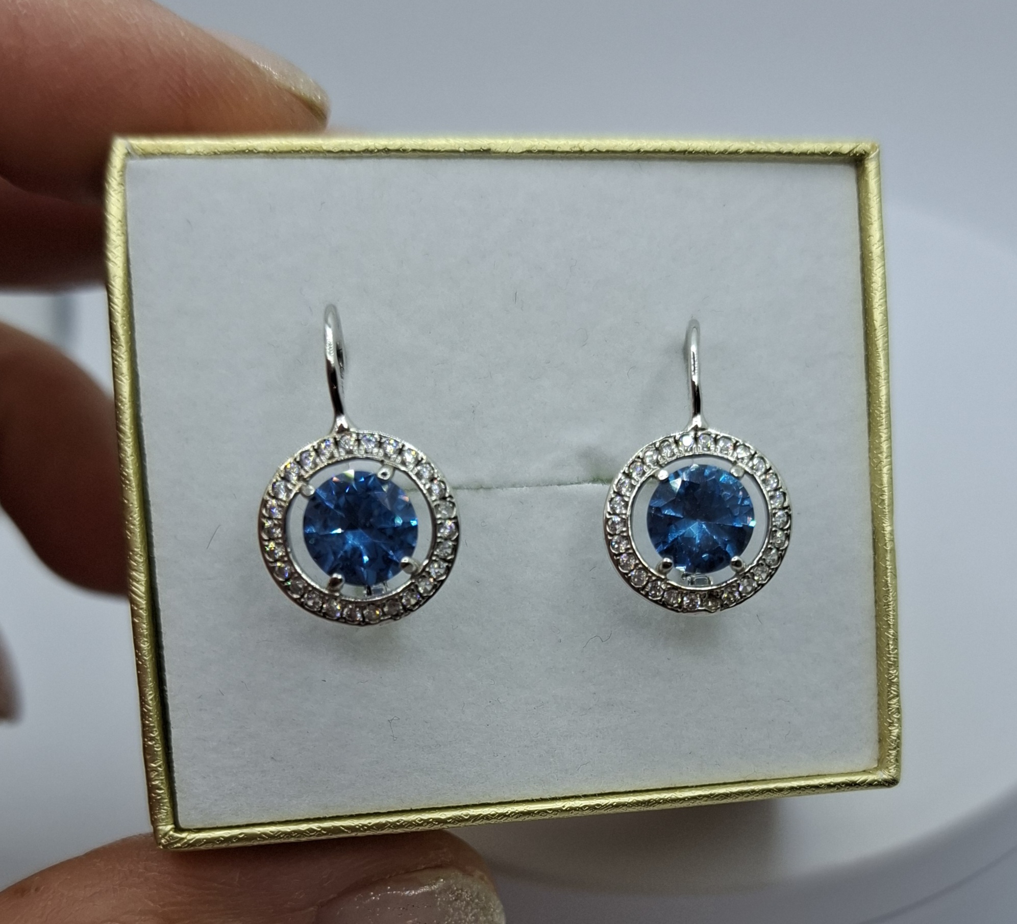 1 pár fehérarany hagyományos kapcsos fülbevaló, középen kék 7mm cirkoniával, körbe kis apró fehér cirkóniákkal. A fülbevaló Teljes hossza:2cm, a szélessége a kerek résznél:12,5mm. Súlya:3,2gr, 14kt.