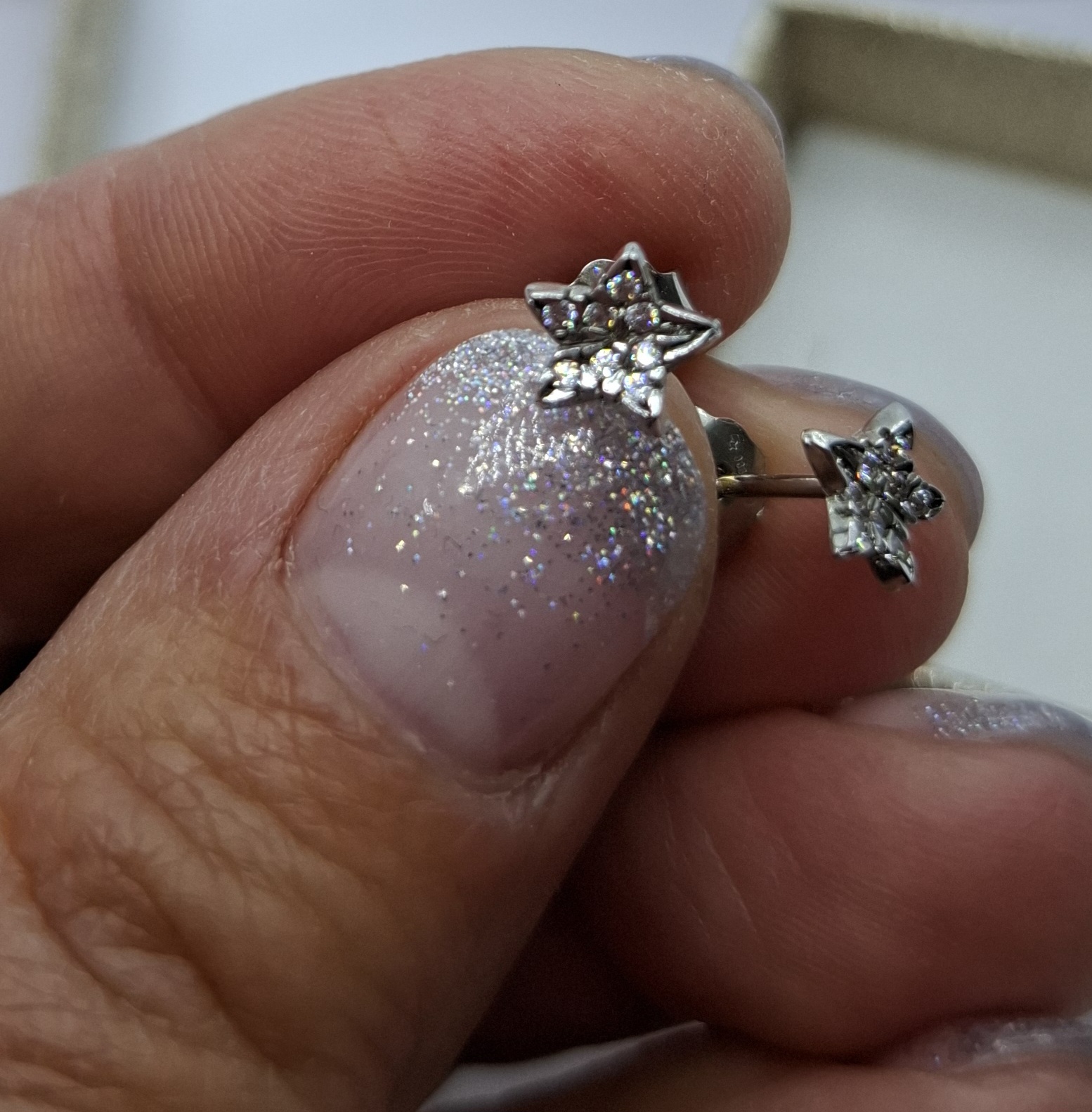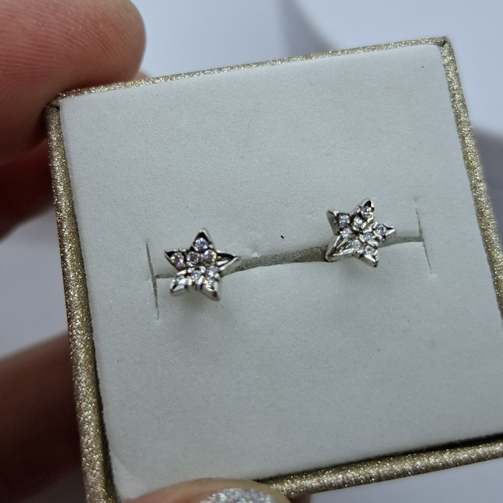 1 pár fehér arany pici csillag fülbevaló, benne cirkónia kövekkel. fej mérete:6,3mm, súlya:0,9gr, 14kt.
