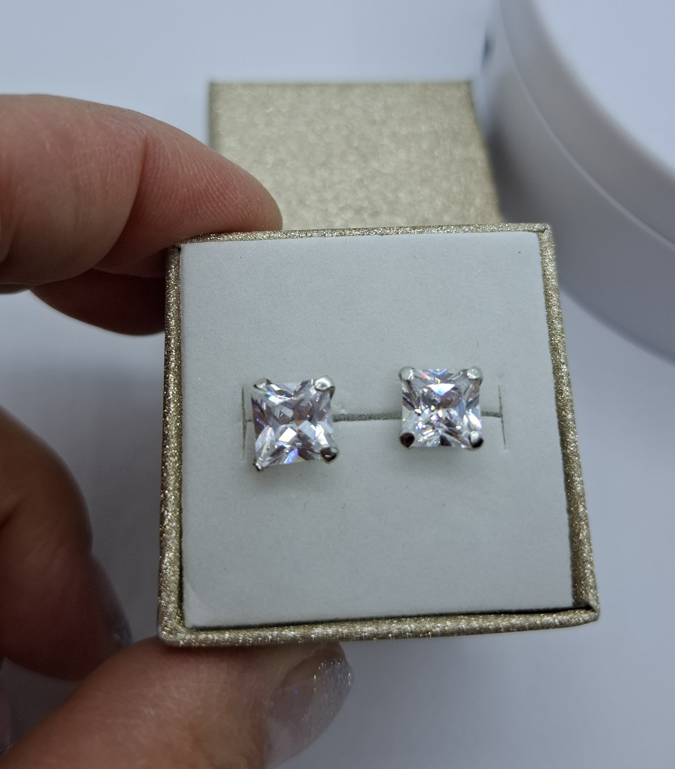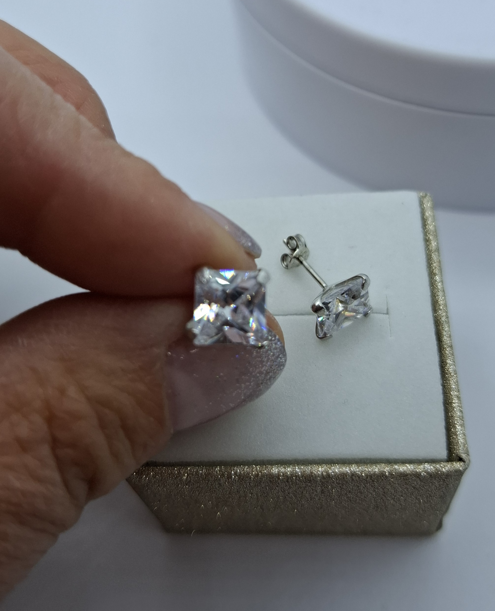 Fehér arany bedugós fülbevaló, kockás cirkónia kővel. Mérete:7,7mm. Súlya:1,9gr, 14kt. Modern, mutatós.