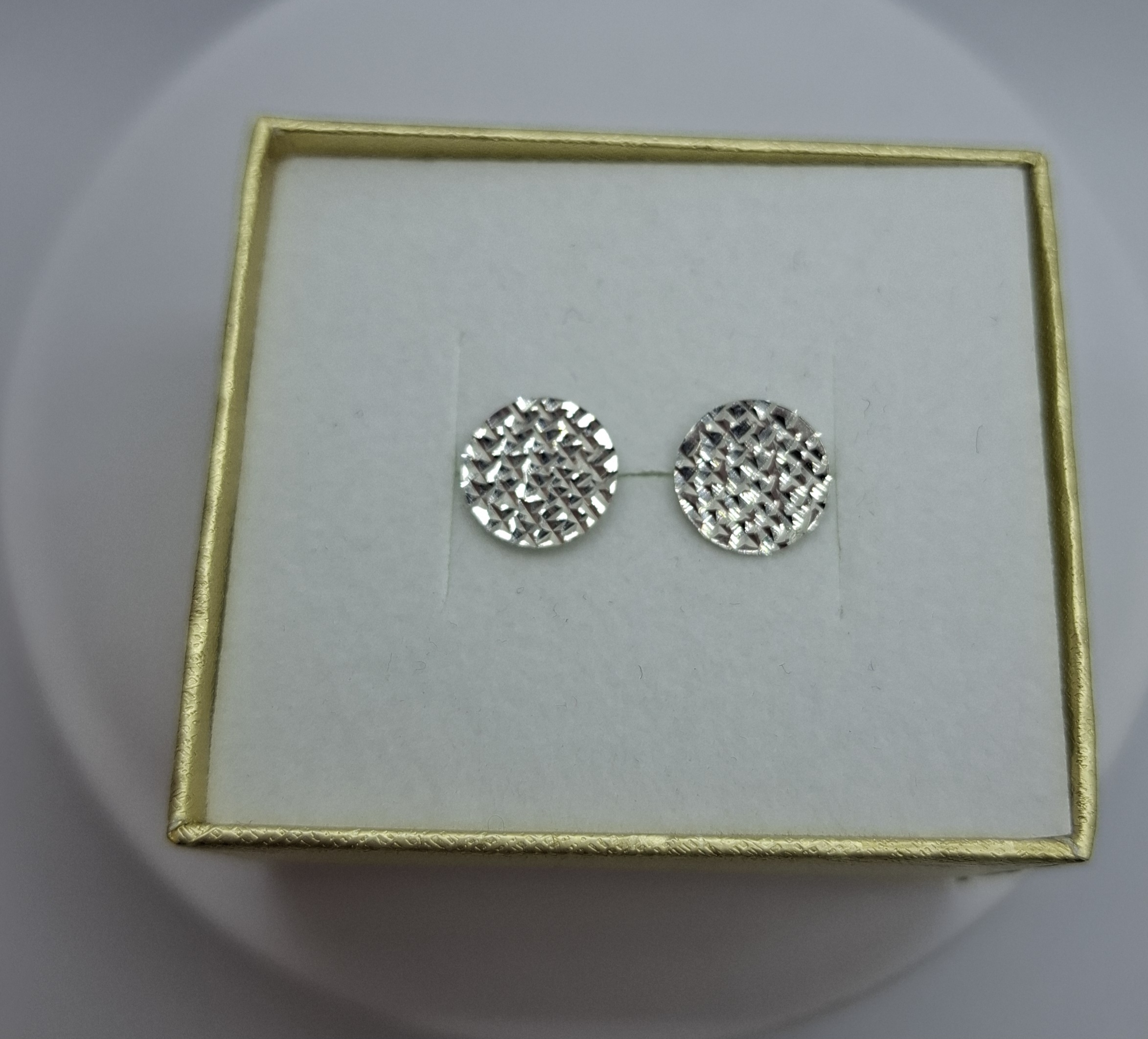 1 pár fehér arany lapos, gyémánt vésett kerek fülbevaló . Mérete:9,5mm, lapos, kő nélküli, csak csillogósra vésett. Súlya:1,1gr, 14kt.