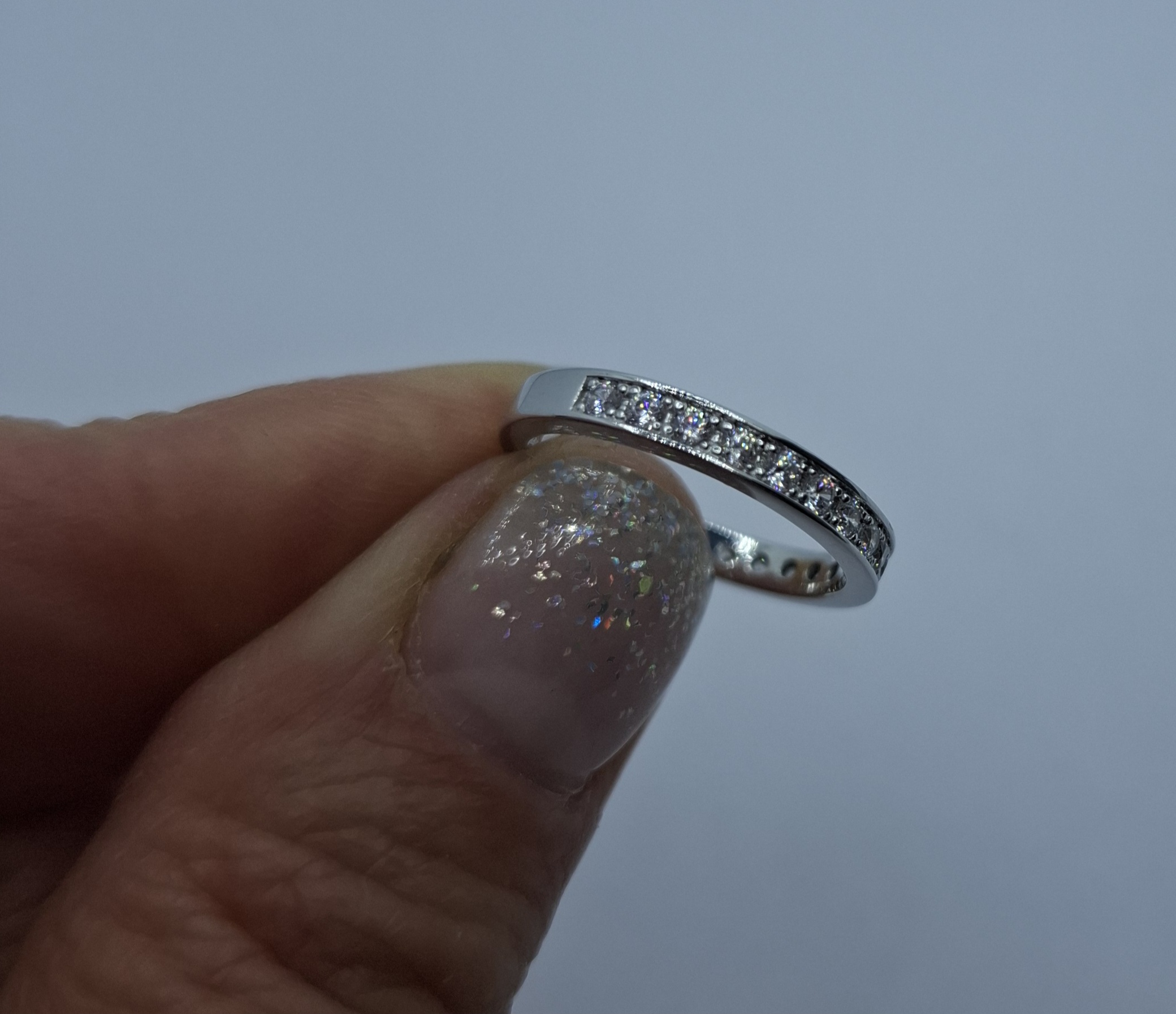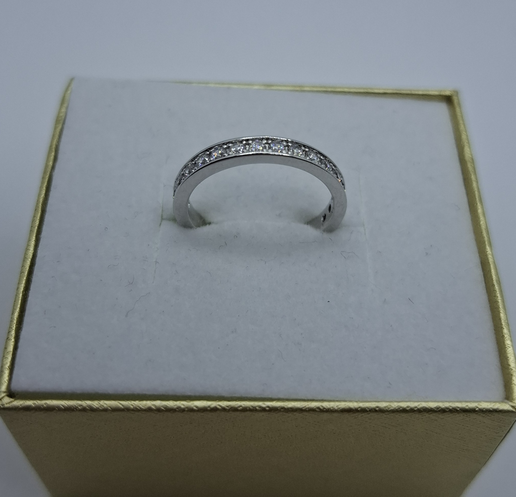 Fehér arany karikagyűrű, női, megrendelhető más méretben is. Félig cirkónia kövekkel. Mérete:50. súlya:2,5gr, 14kt. Szélessége:2,8mm. Mutatós, kedvelt.