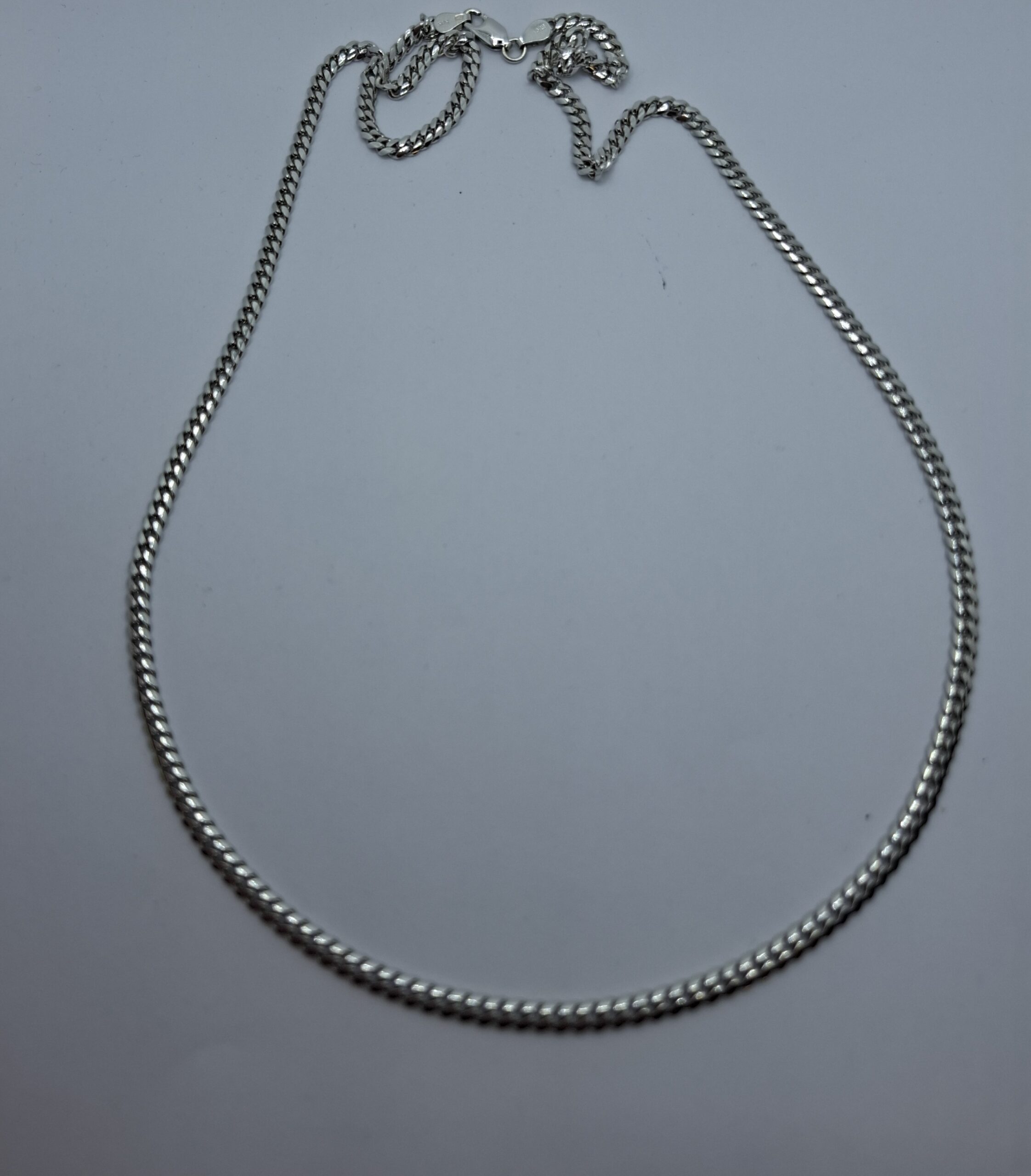Fényes fehér arany egyszerű de mutatós nyaklánc, teljesen tömör, erős. Hossza:55cm, szélessége:3,3mm, sűrű pancer. Súlya:18,4gr, 14kt.
