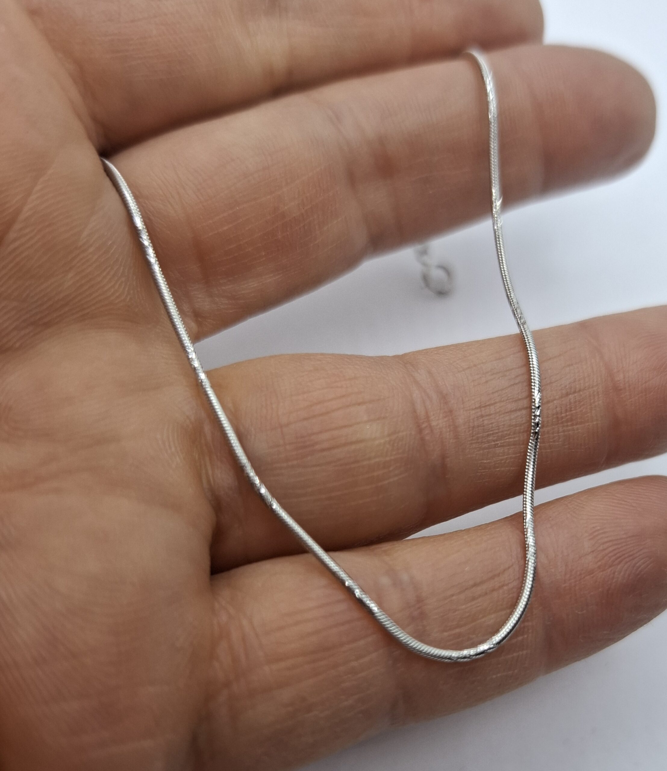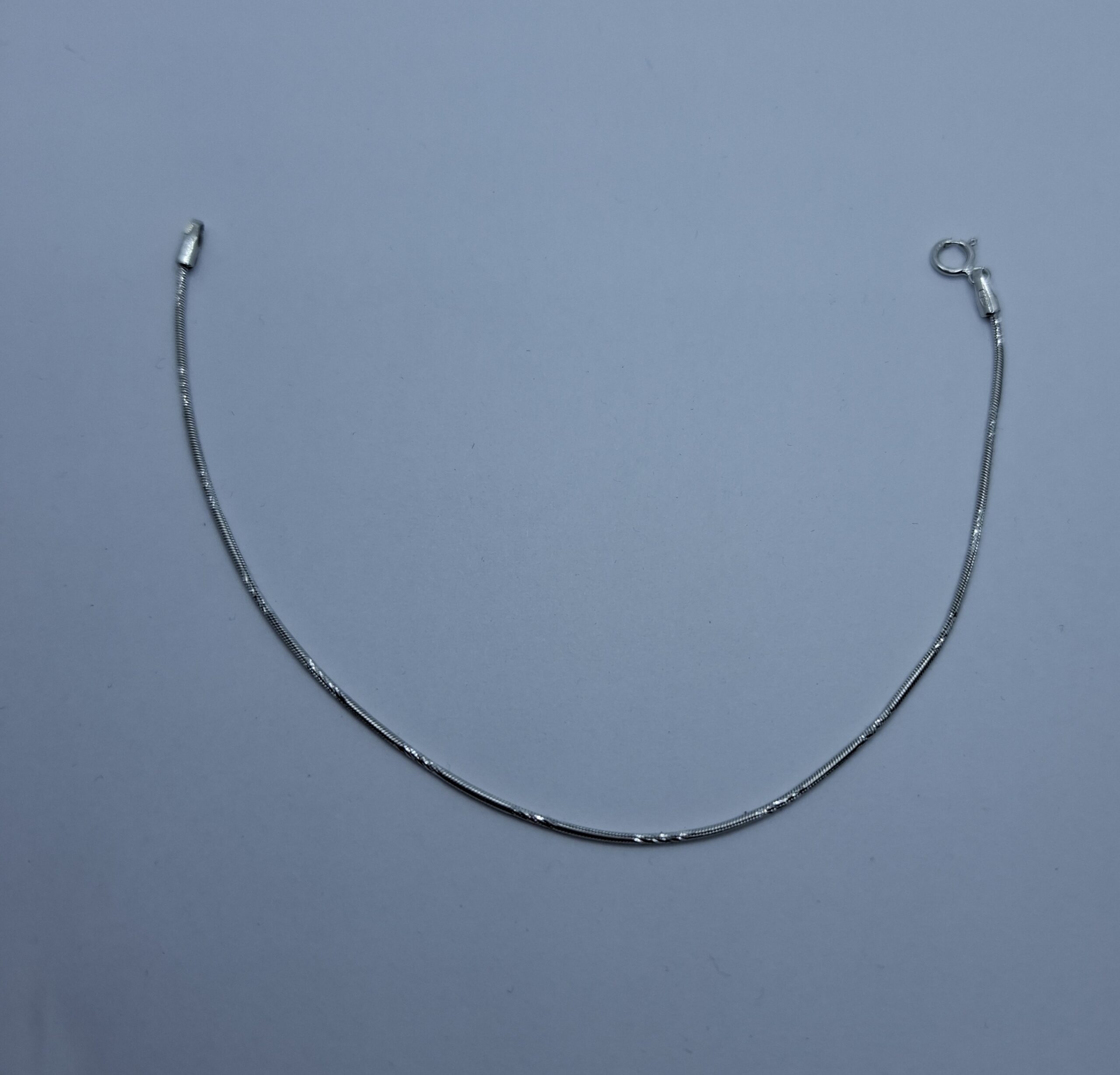 Fehér arany kígyó karlánc, kerek, kis mintával. vékony:1mm. Hossza:18cm. Súlya:1,6gr, 14kt.