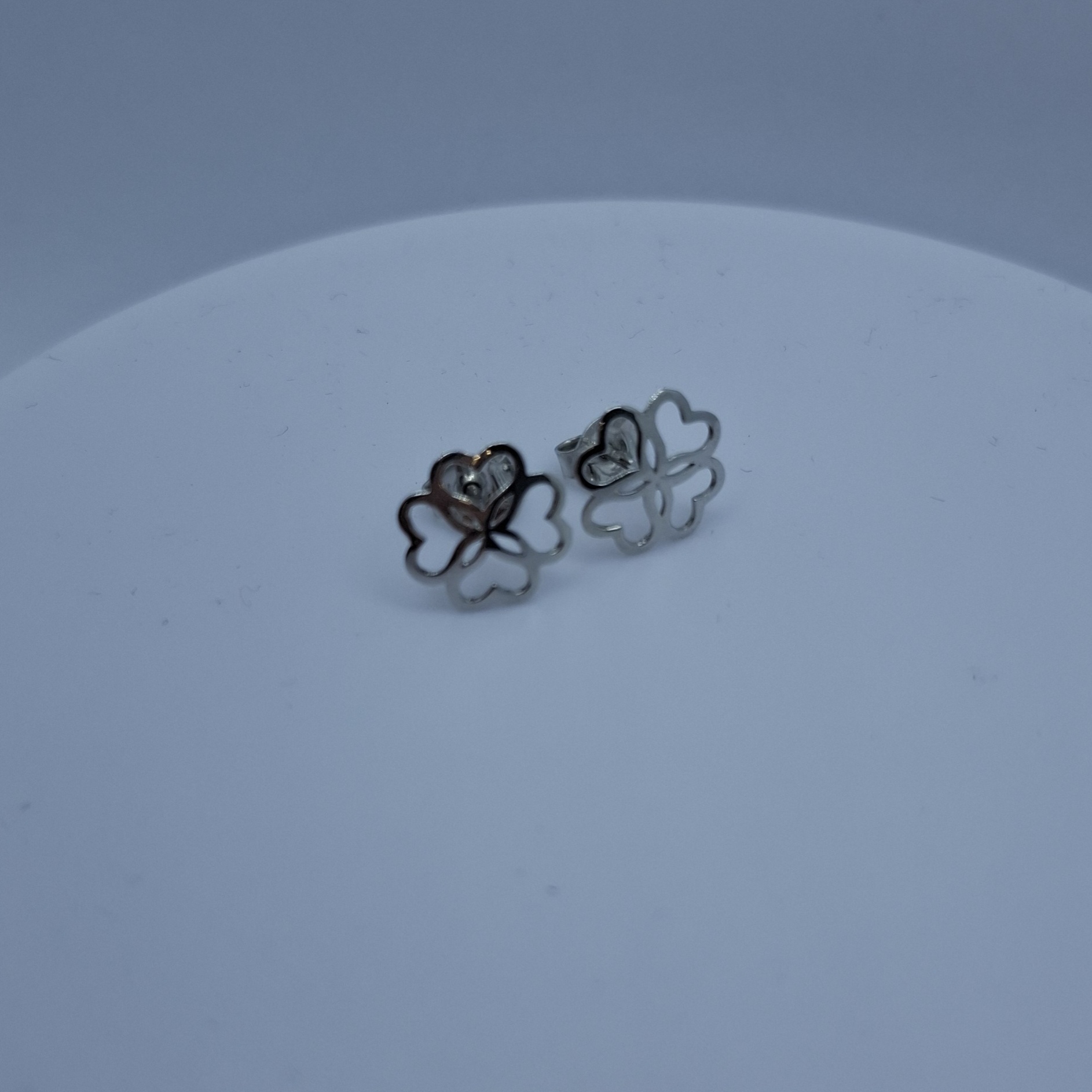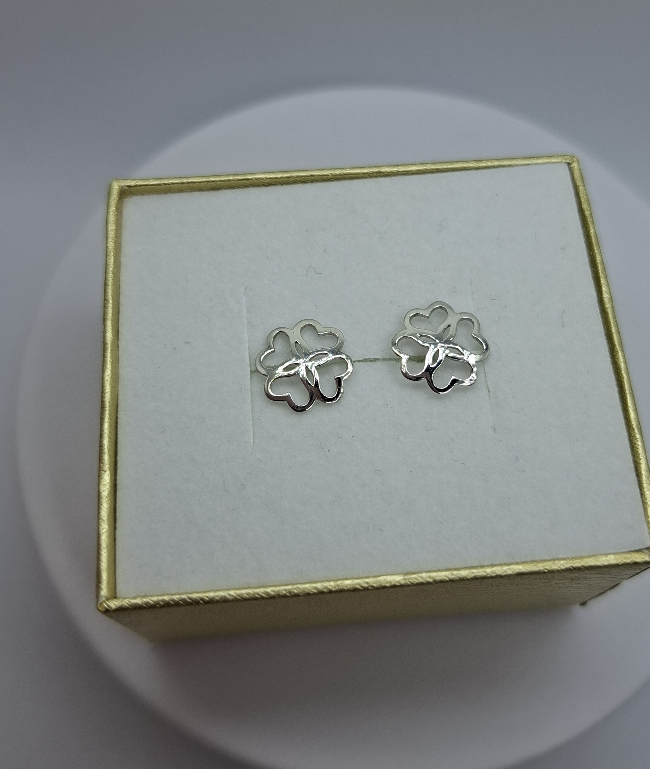 Fehér arany áttört bedugós fülbevló, 4levelű szerencsehozó, áttört. Szív formáju levélkékből álló. Sólya:0,9gr, 14kt. Fej mérete:9,6mm.
