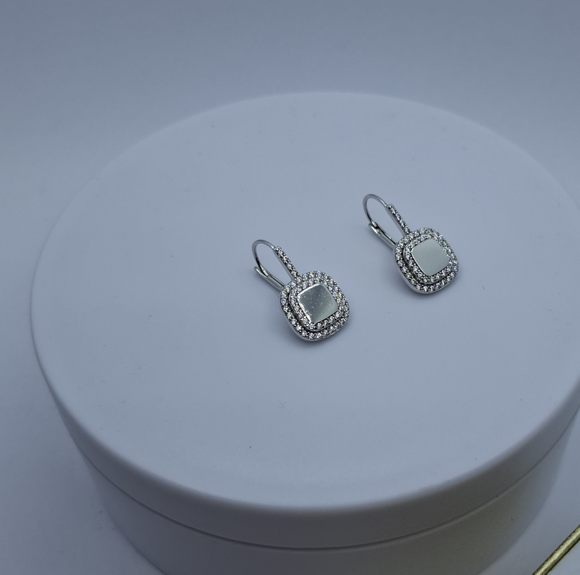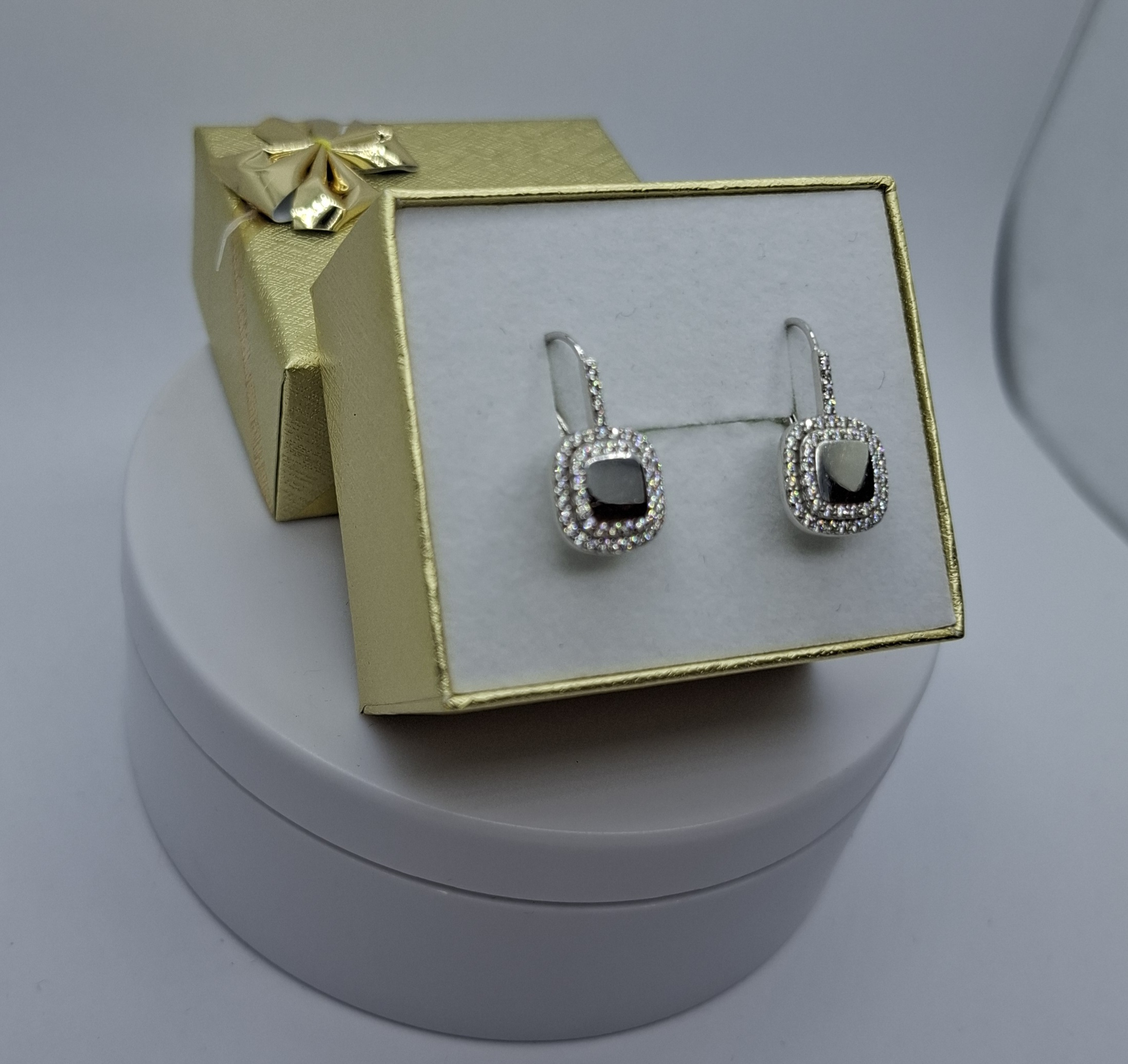 1 pár fehérarany fülbevaló, hátul hagyományos kapoccsal, cirkónia kövekkel. Hossza:2,2cm, szélessége az elején:10,8mm, súlya:2,7gr, 14kt. Mutatós.