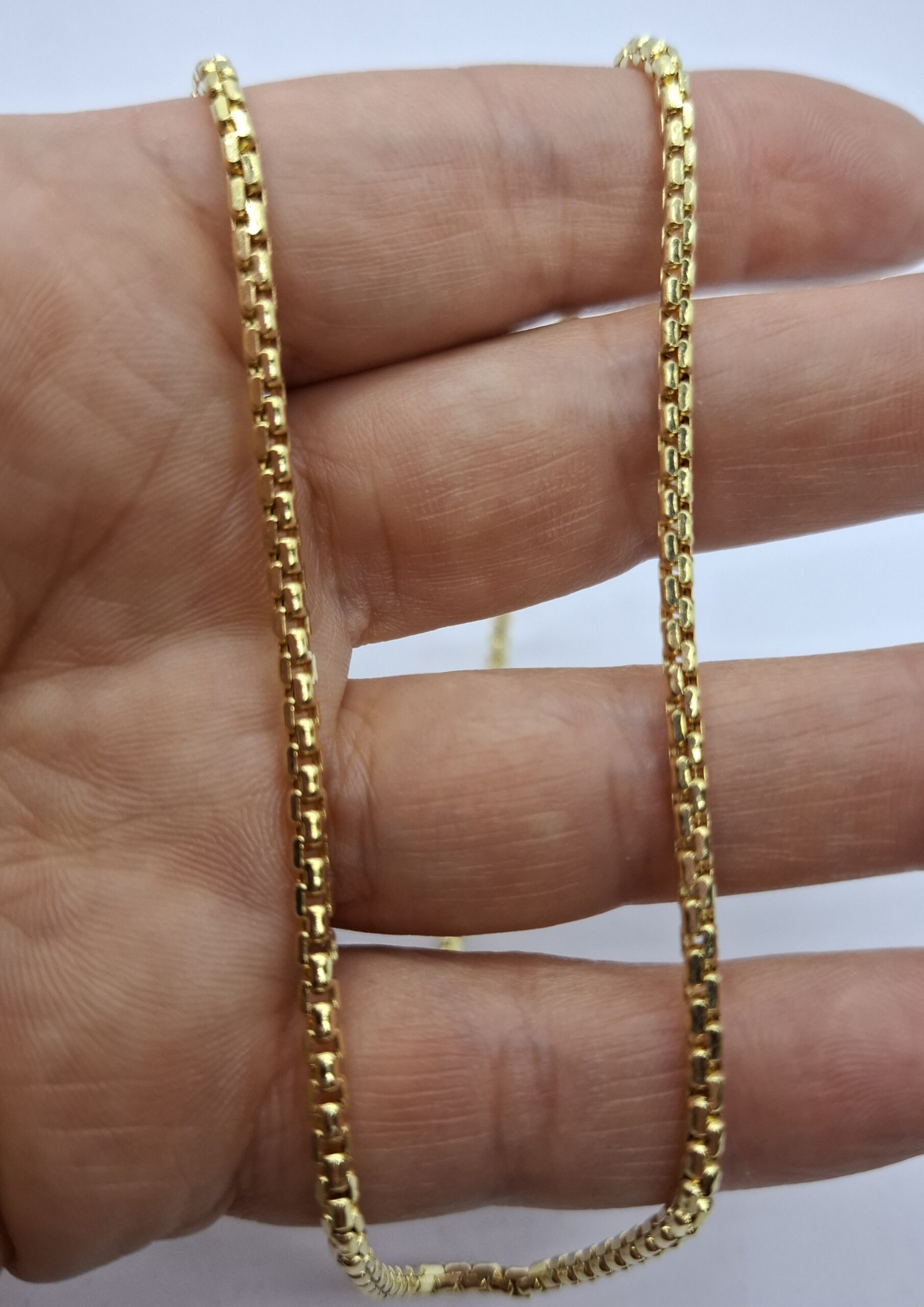 Arany lánc, kerek forma apró szemekből álló. Hossza:55cm, vastagsága:2,5mm, súlya:7,9gr, 14kt magyar fémjelzett. Mutatós, szolíd.